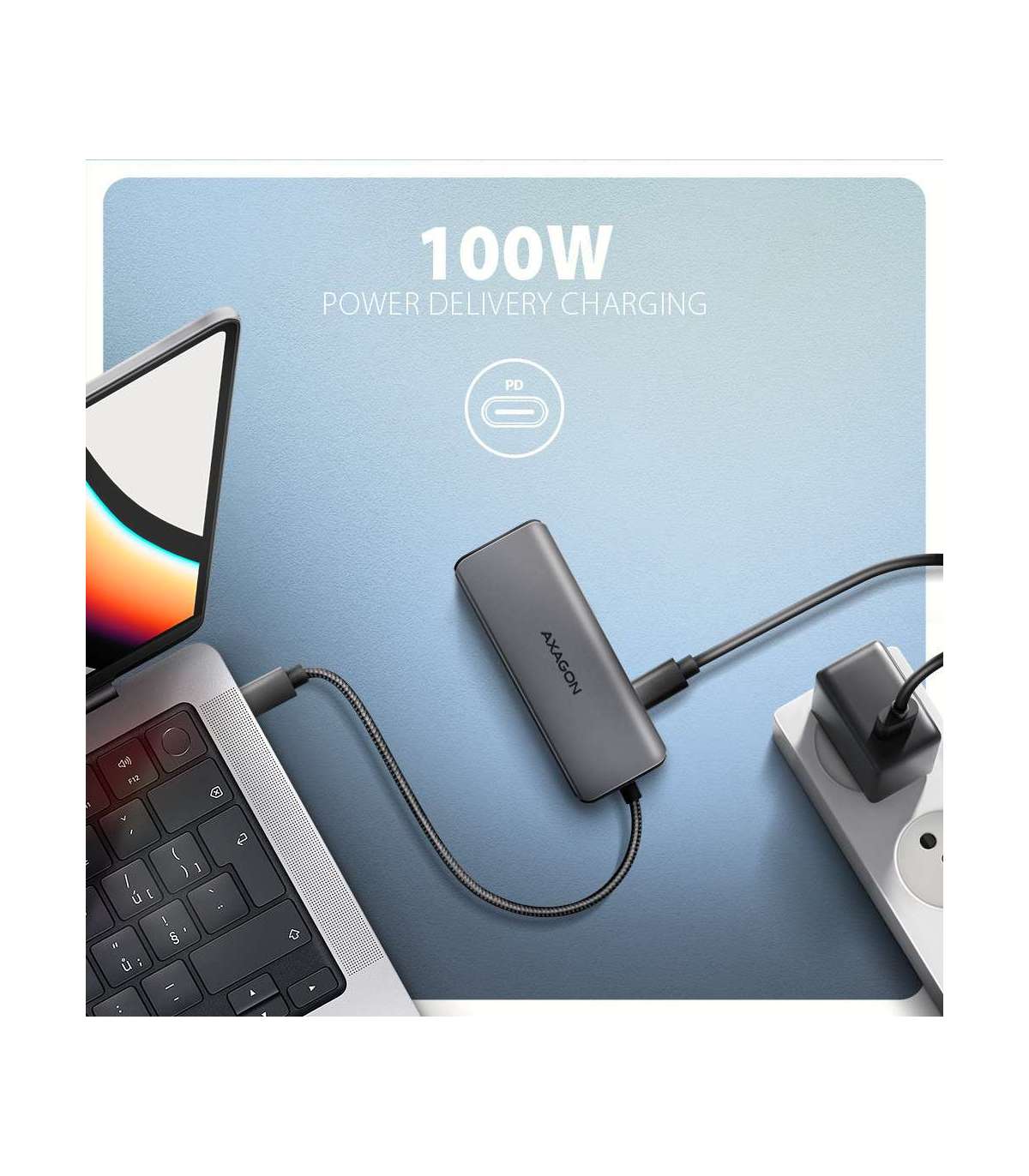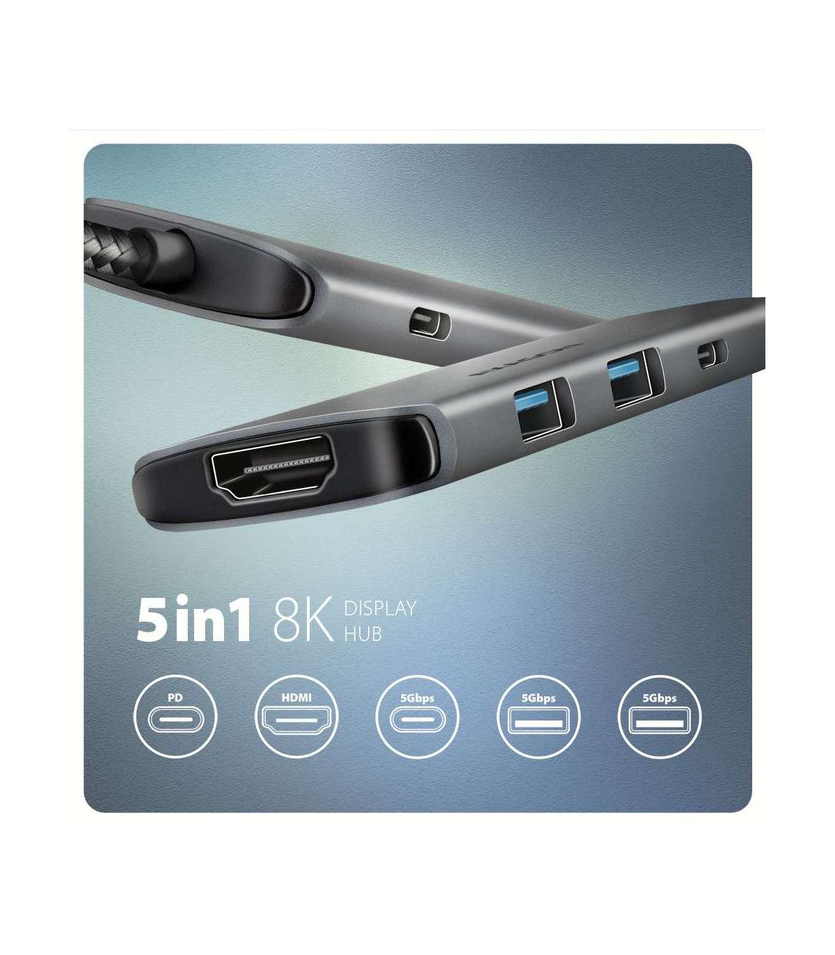 - USB 5Gbps hub, 3x USB-A, HDMI 4k/30Hz, PD 100W, 100cm USB-C cable