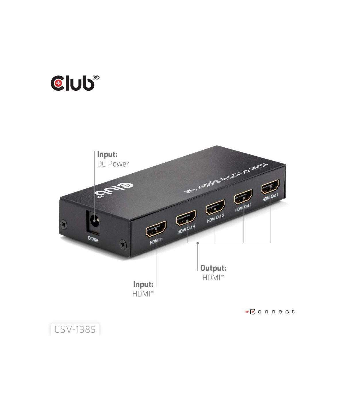 The Club 3D CSV-1385 is a high-performance and small-sized 1 to 4 HDMI™ Splitter 4K120Hz with hot plug and iron casing. It distributes the input of the HDMI™ signal into four identical outputs at the same time. It provides high performance audio and video output through HDMI™ cables up to 4K@120Hz resolution. This Splitter only splits the input signal to 4 output ports based on the input signals specifications.