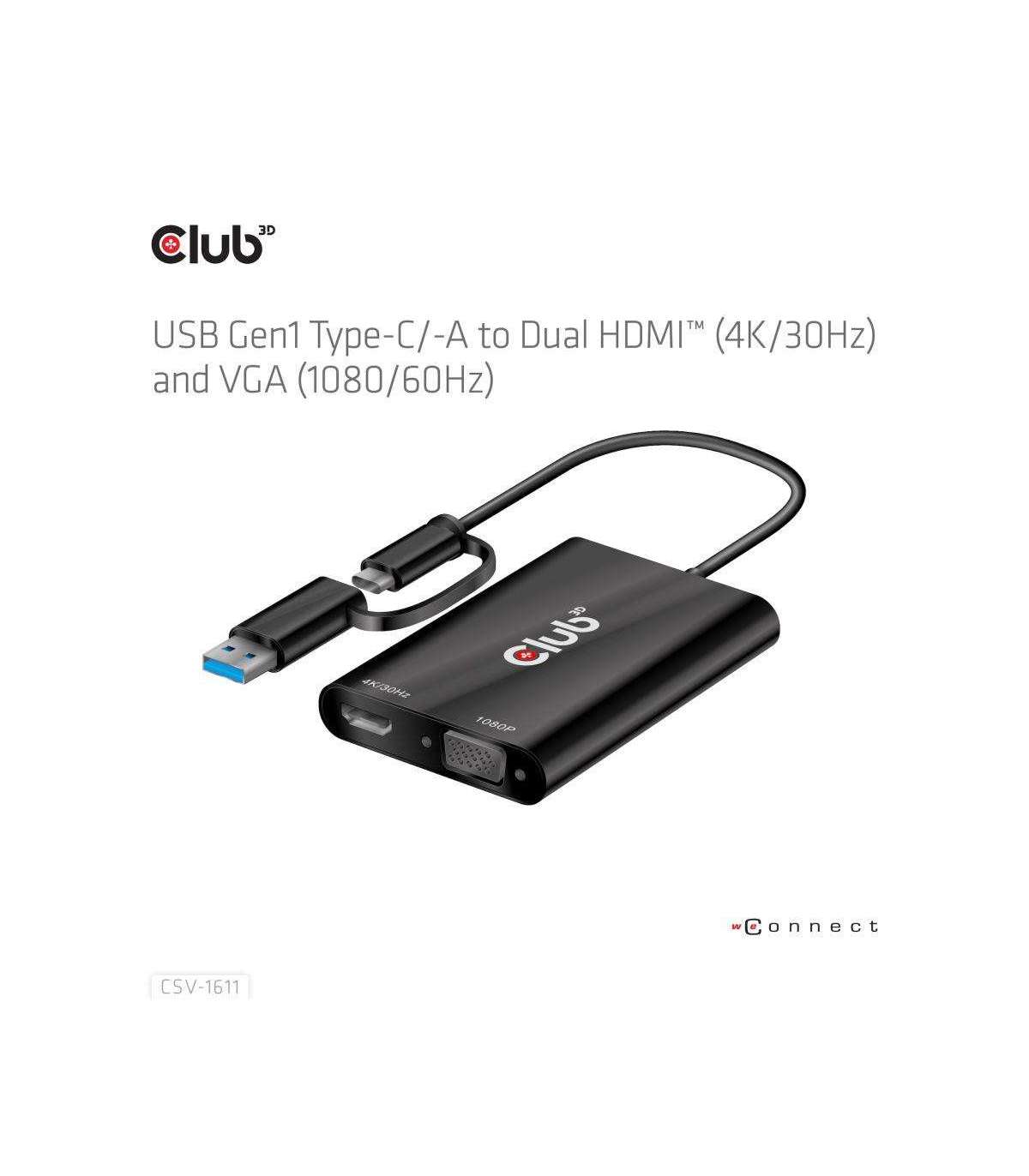 The Club 3D CSV-1611 USB Gen1 Type-C/-A to Dual HDMI™ (4K/30Hz) and VGA (1080/60Hz) adapter is a Dual Display adapter which provides most advanced, efficient solution to extend a single USB Type-C or Type-A port to HDMI™ and VGA displays. It supports single HDMI™ 4K/30Hz and VGA 1080P/60Hz or dual 4K/30Hz + VGA 1080P/60Hz simultaneous output of different videos. It can work on USB Mode and DP Alt mode supported Type-C and USB-A host. Dual Video output on MacBook with M1. Support USB Gen1 with max 5Gbps data transmission. The unit is powered thru the USB Type-A or Type-C host connection. No external power needed.