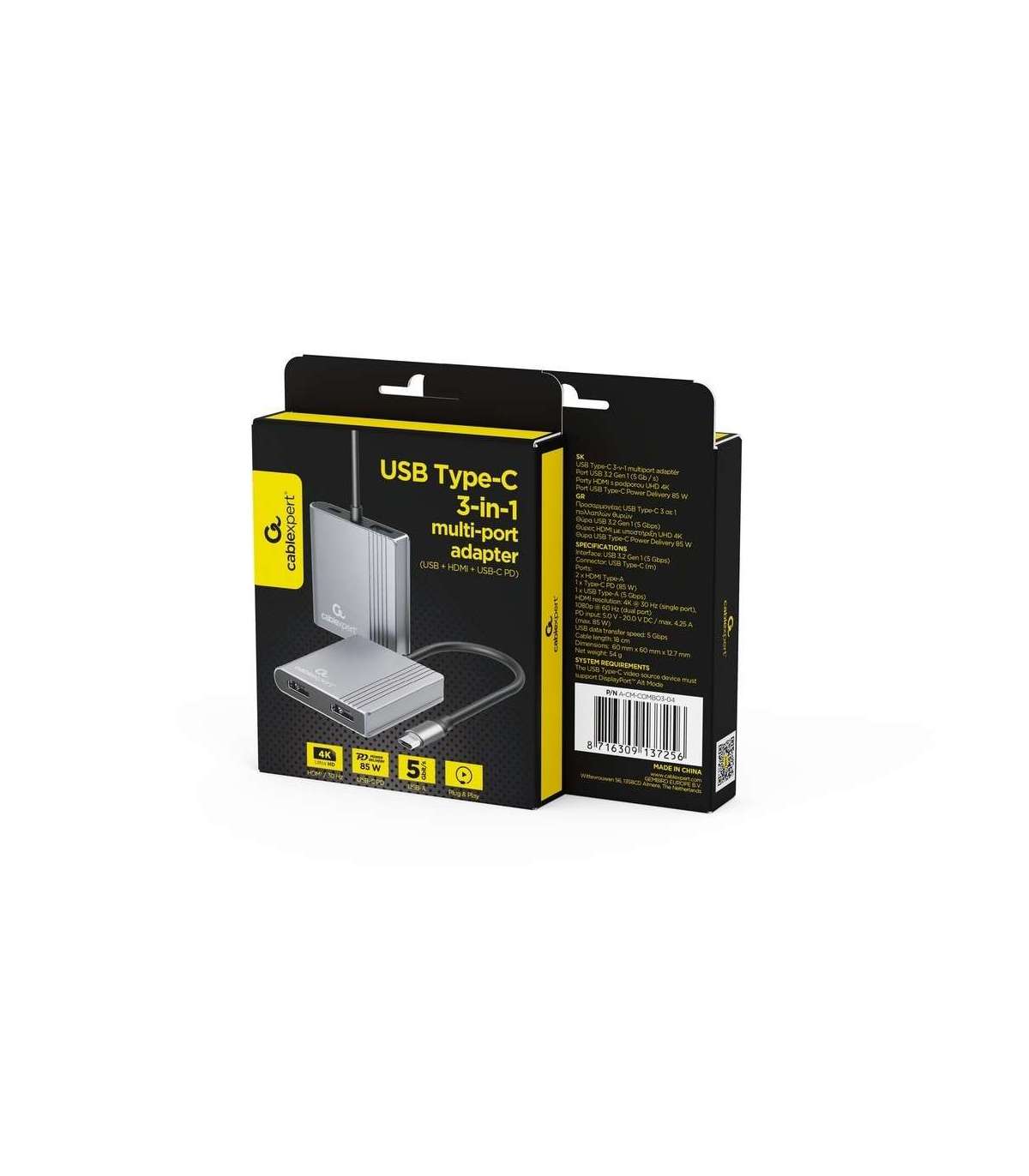 GEMBIRD USB TYPE-C 3-IN-1 MULTI-PORT ADAPTER GREY