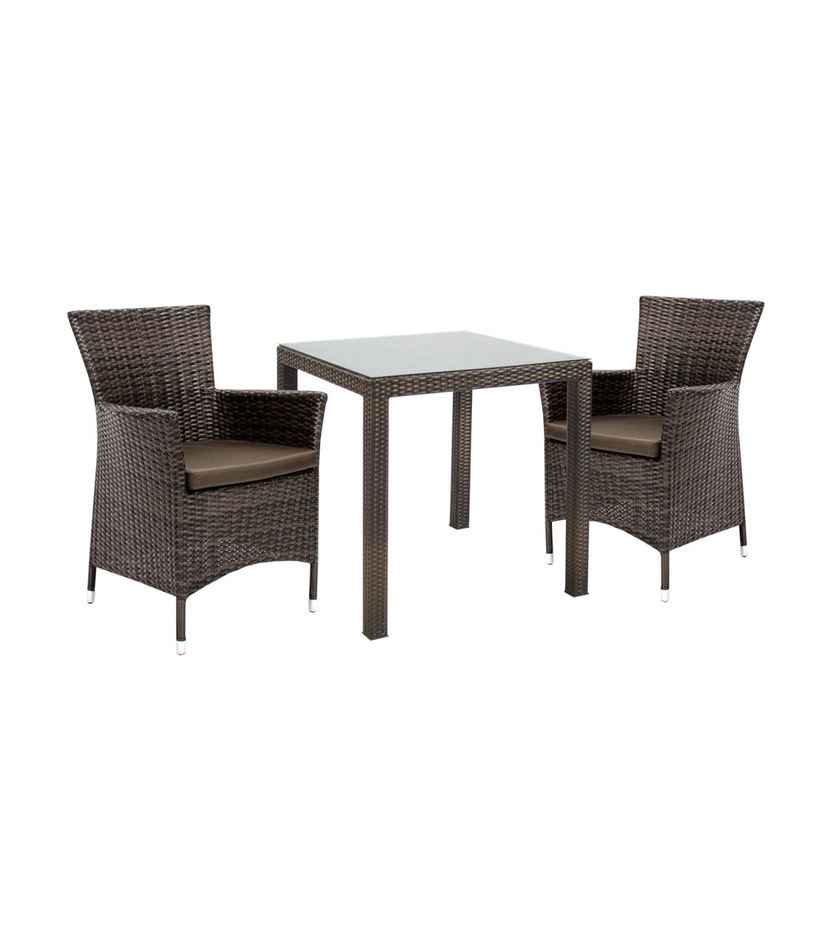 Aiamööblikomplekt WICKER laud ja 2 tooli, tumepruun. Laua mõõdud on 73x73xH71cm. Lauaplaat: 5mm läbipaistev karastatud klaas. Laua pulbervärvitud alumiiniumraam on kaetud plastikpunutisega. Tooli tugev ja stabiilne terasraam on kaetud plastikpunutisega. Istmepadi kuulub komplekti. Padja mõõdud 46x47x4,5cm. Padjakate on valmistatud polüesterkangast. Tooli üldmõõdud on 61x58xH86cm. Istme laius 46cm, istme sügavus 47cm, istme kõrgus 48cm. Käetoe kõrgus maast 62cm. Kaalupiirang 120kg. Toode on muutlikes ilmastikutingimustes hästi vastupidav ja ei nõua erilist hooldust. Välitingimustes kasutatava mööbli eluea pikendamiseks soovitame kasutada välimööbli katteid. HOIUSTAMINE: suvehooaja lõppedes soovitame aiamööblit hoiustada siseruumides. Puhastage ja kuivatage mööbel enne hoiule panekut. Kasutage hoiustamiseks kuiva ning hea ventilatsiooniga ruumi.