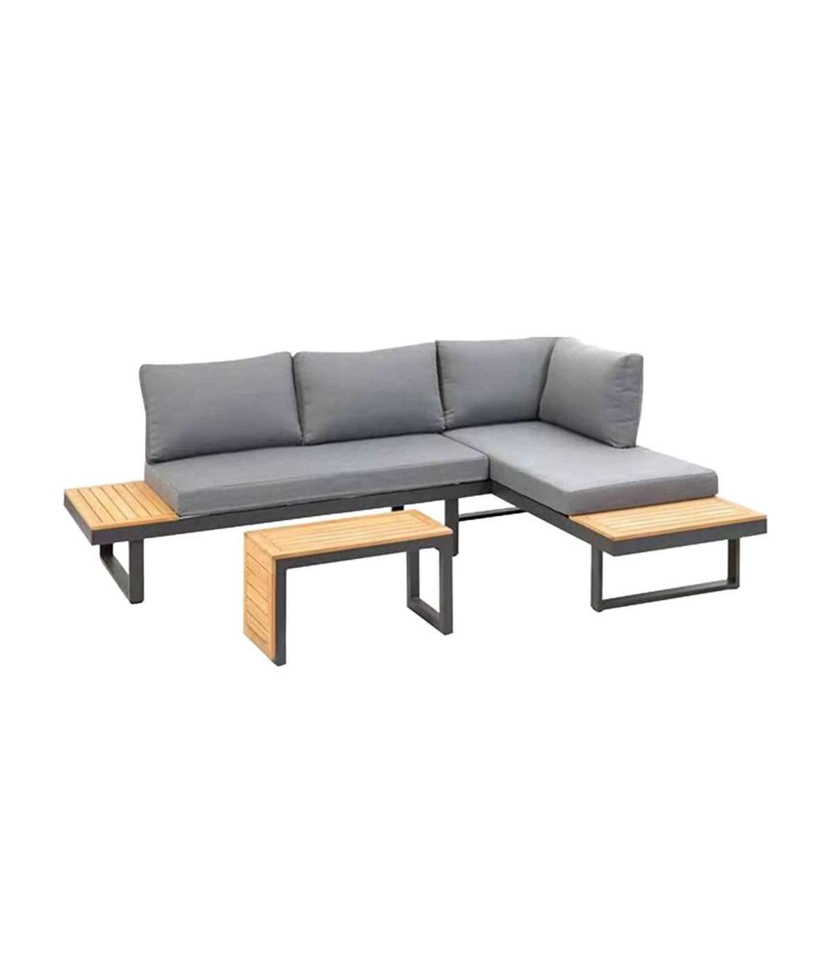 Luksuslik kombineeritav komplekt kahest diivanist ja ühest diivanilauast, mis on valmistatud komaksiitviimistlusega alumiiniumprofiilidest ja akaatsiapuust. Õlilakiga töödeldud puit, padjad kuuluvad komplekti.