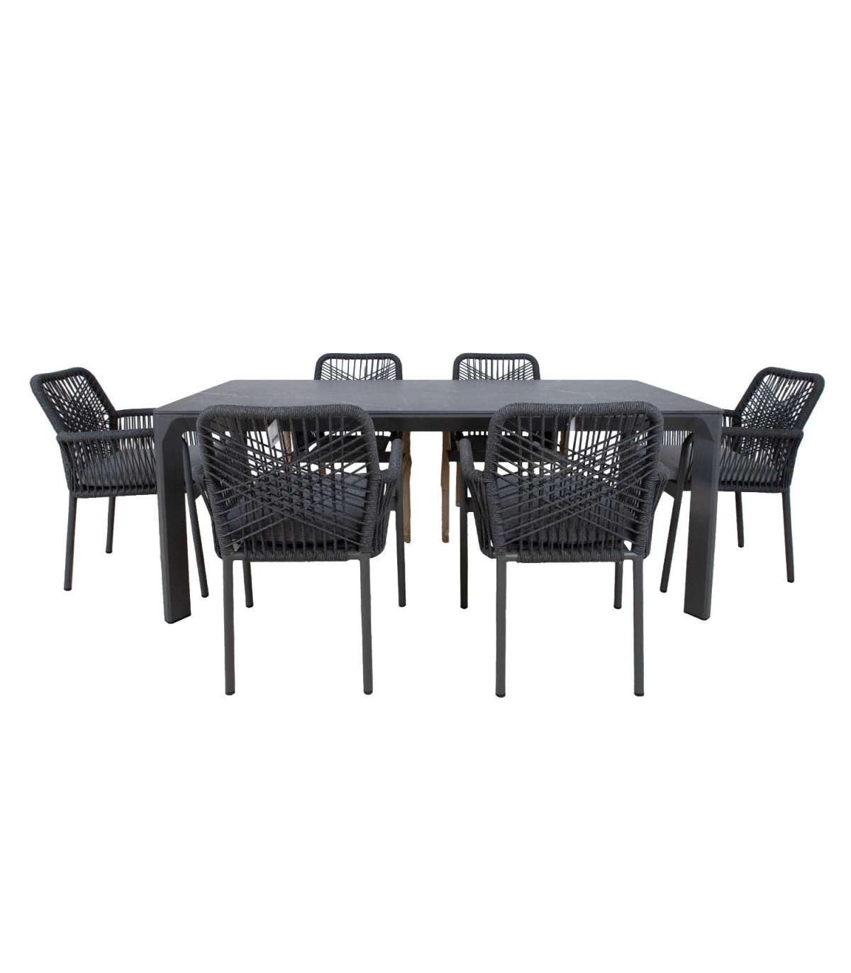 Aiamööblikomplekt CARVES laud ja 6 tooli. Laua mõõdud on 180x90xH75cm, lauaplaadi paksud 11mm. Jalad ja raam on valmistatud alumiiniumist (48x25x1,2mm) ja viimistletud halli pulbervärviga. Paagutatud kivist (sintered stone) lauaplaadi valmistamisel on kasutatud innovatiivset tehnoloogiat, mis jäljendab loodusliku kivi moodustumise protsessi sügaval maakoores. Kaoliini ehk portselansavi osakesed töödeldakse 1200 kraadises kuumuses, mille tulemusena moodustub materjal, mis oma omadustel ja välimuselt sarnaneb naturaalse kiviga. Lauaplaat on küll õhuke, kuid väga tugev (suhteline kõvadus Mohsi skaalal 7), kulumiskindel, talub hästi kõrget temperatuuri ja erinevaid ilmastikutingimusi, ei ima plekke ja seda on väga lihtne puhastada ja hooldada. Kuna keemilisi sideaineid ei ole kasutatud on materjal hügieeniline. TÄHELEPANU! Vältige lööke, põrutusi ja kukkumist. Tooli raam on valmistatud alumiiniumist ja viimistletud halli pulbervärviga. Tooli selja- ja käetoed on kaetud pilkupüüdva olefin nöörist punutisega. Istmepadi kuulub komplekti. Padjakate on valmistatud polüesterkangast. Padja paksus 5cm. Istmepõhi on toestatud alumiiniumliistudega. Tooli mõõdud 57x60xH89cm, istmekõrgus 44cm. Kaalupiirang 100kg. Toolid on virnastatavad ning nende hoiustamine on lihtne ja ruumi säästev. HOIUSTAMINE: suvehooaja lõppedes soovitame aiamööblit hoiustada siseruumides. Puhastage ja kuivatage mööbel enne hoiule panekut. Kasutage hoiustamiseks jahedat, kuiva ning hea ventilatsiooniga.