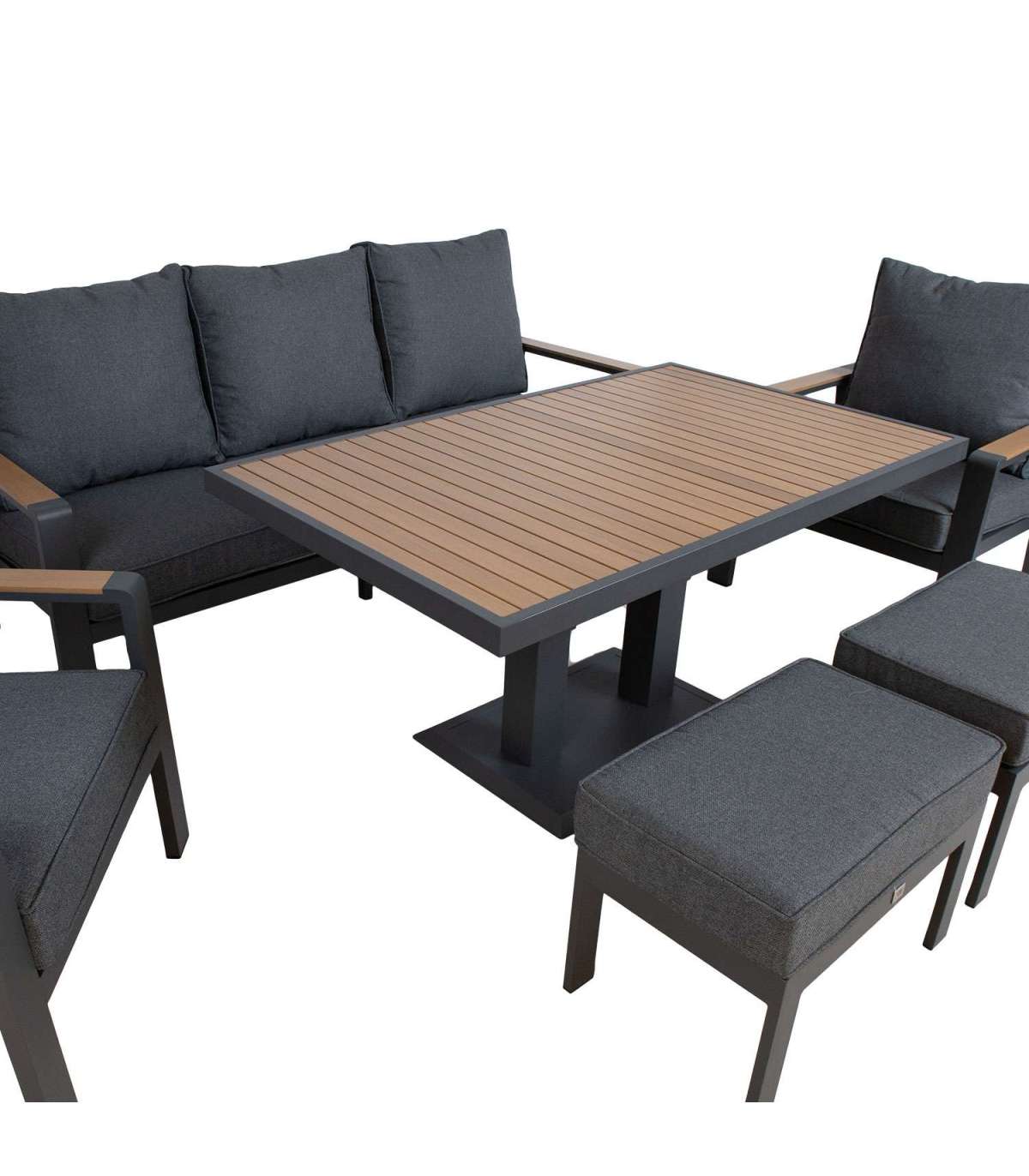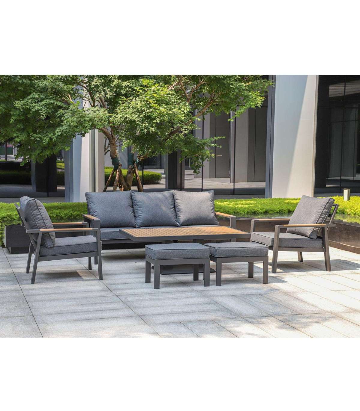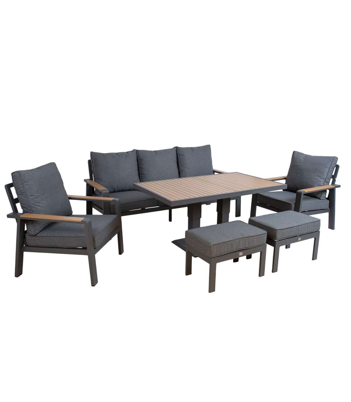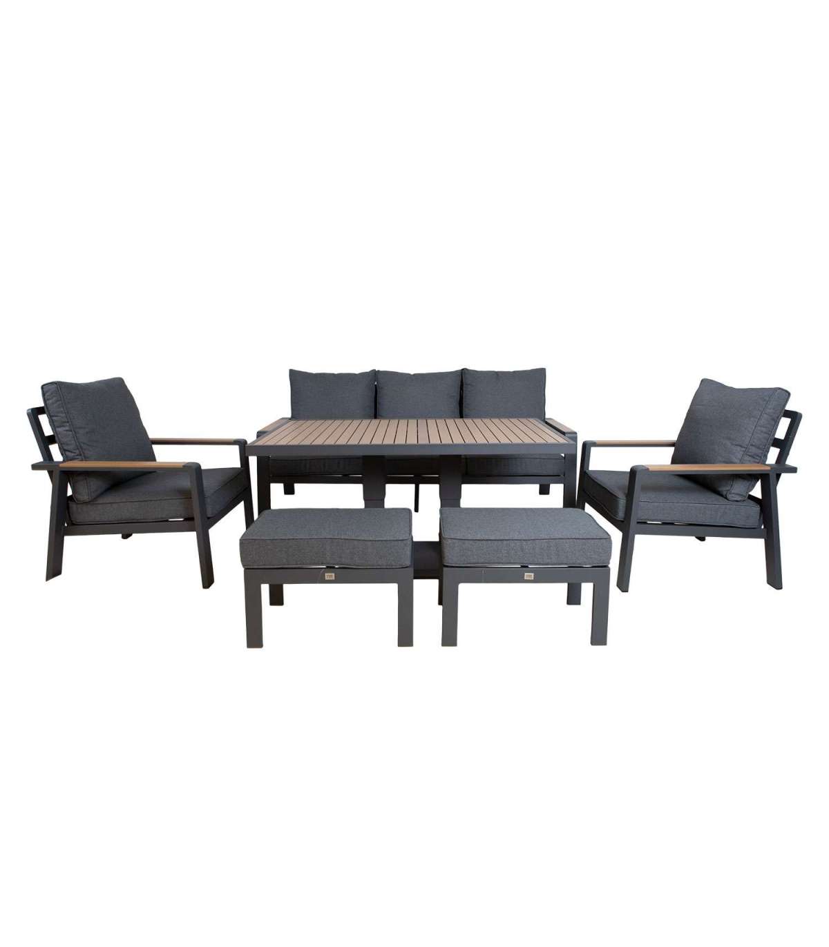 Aiamööblikomplekt PARKER laud, diivan, 2 tugitooli ja 2 tumbat, hall