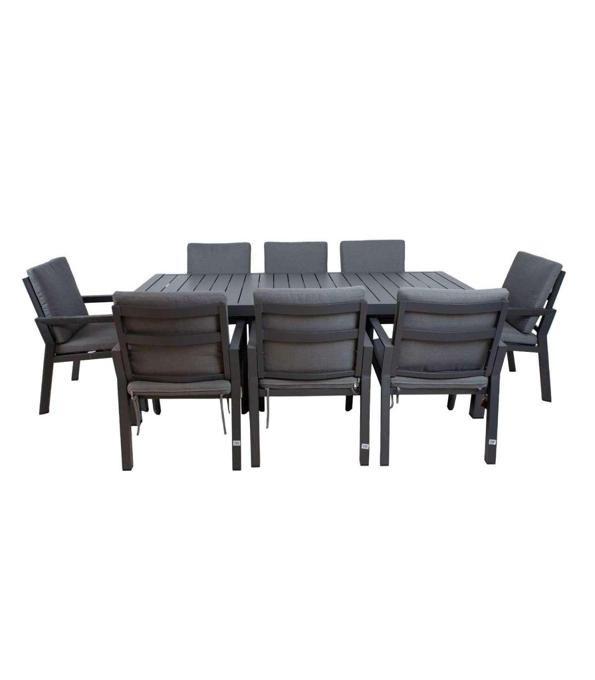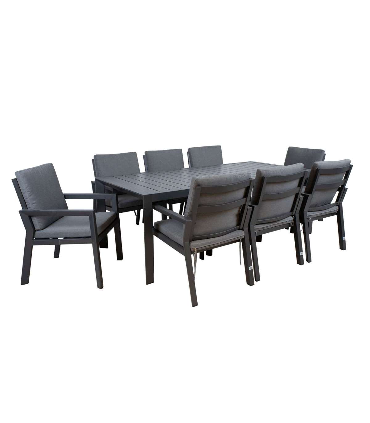 Aiamööblikomplekt TOMSON laud ja 8 tooli. Laua mõõdud on 216x100xH73cm. Lauaplaat ja jalad ning toolide jalad ja raam on valmistatud alumiiniumist ja viimistletud tumehalli pulbervärviga. Toolide istmepadjad kuuluvad komplekti. Padjakatted on valmistatud hallist olefin kangast. Katted on eemaldatavad ja pestavad. Istmepadja mõõdud on 51x54xH5cm, seljatoepadja mõõdud on 51x48x4cm. Tooli üldmõõdud on 61,5x68xH85cm. Istme laius 51cm, istme sügavus 45cm, istme kõrgus koos padjaga 47cm, käetoe kõrgus maast 63,5cm. Kaalupiirang 120kg. Toode on muutlikes ilmastikutingimustes väga hästi vastupidav ja lihtsalt hooldatav. Kaitset ilmastikuolude eest vajavad ainult padjad. HOIUSTAMINE: suvehooaja lõppedes soovitame aiamööblit hoiustada siseruumides. Puhastage ja kuivatage mööbel enne hoiule panekut. Kasutage hoiustamiseks kuiva ning hea ventilatsiooniga ruumi.