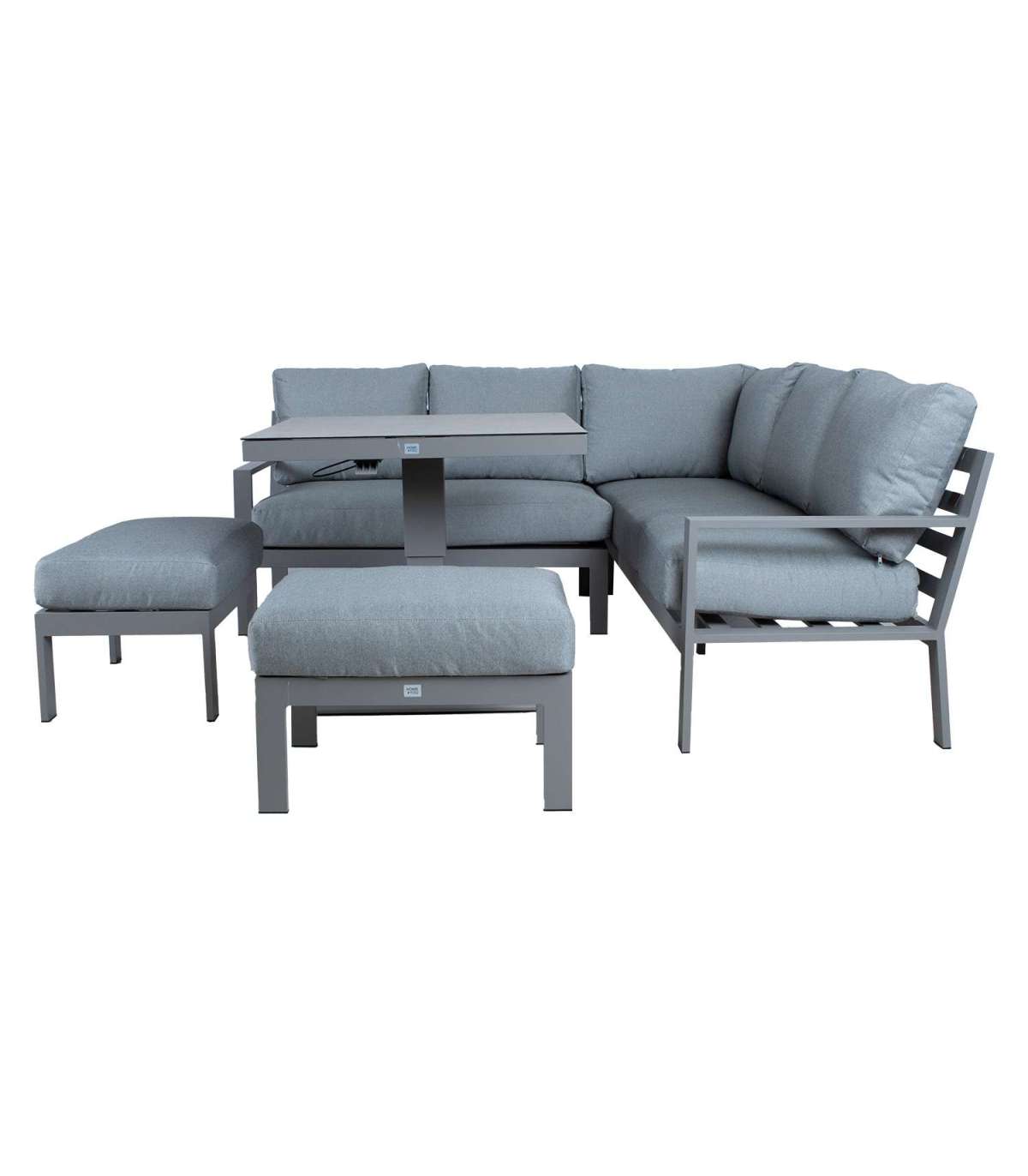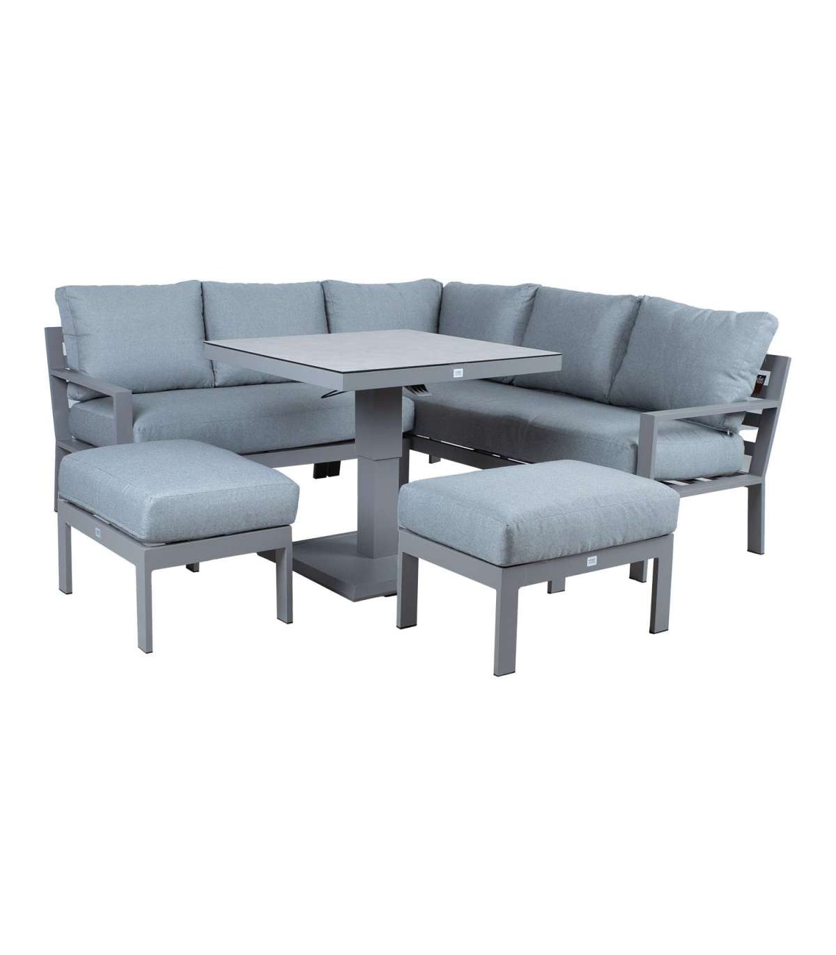 Komplekti kuulub muudetava kõrgusega laud, nurgadiivan ja 2 tumbat. Komplekti kõigi osade raamid on valmistatud alumiiniumist ja viimistletud hallikasbeeži pulbervärviga.