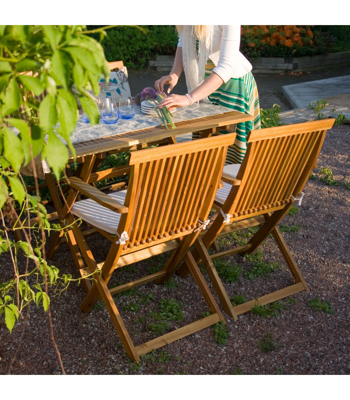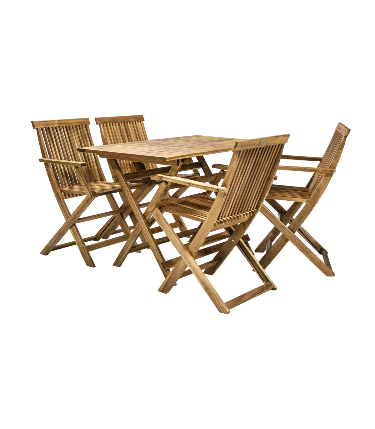 Aiamööblikomplekt FINLAY laud ja 4 käetugedega tooli. Laud ja toolid on valmistatud akaatsiapuidust ja viimistletud puidukaitseõliga. Laua mõõdud on 110x70xH74,5cm. Tooli üldmõõdud on 54x57xH86cm. Istme laius on 43cm, istme sügavus 39cm ja istme kõrgus 45,5cm. Kaalupiirang 90kg. Toode on muutlikes ilmastikuoludes vastupidav. HOOLDUS: puit on elav looduslik materjal, mille välisilme ilmastikutingimuste tõttu muutub. Puhastage mööblit regulaarselt, kaitske liigniiskuse ja UV kiirguse eest. Kerge lihvimine ja uus õlikiht vähemalt korra aastas on piisav värskenduskuur mööblile uue näo andmiseks. HOIUSTAMINE: suvehooaja lõppedes soovitame aiamööblit hoiustada siseruumides. Puhastage ja kuivatage mööbel enne hoiule panekut. Kasutage hoiustamiseks kuiva ning hea ventilatsiooniga ruumi. Kaitske mööblit hoiustamise ajal otsese päikesevalguse eest.