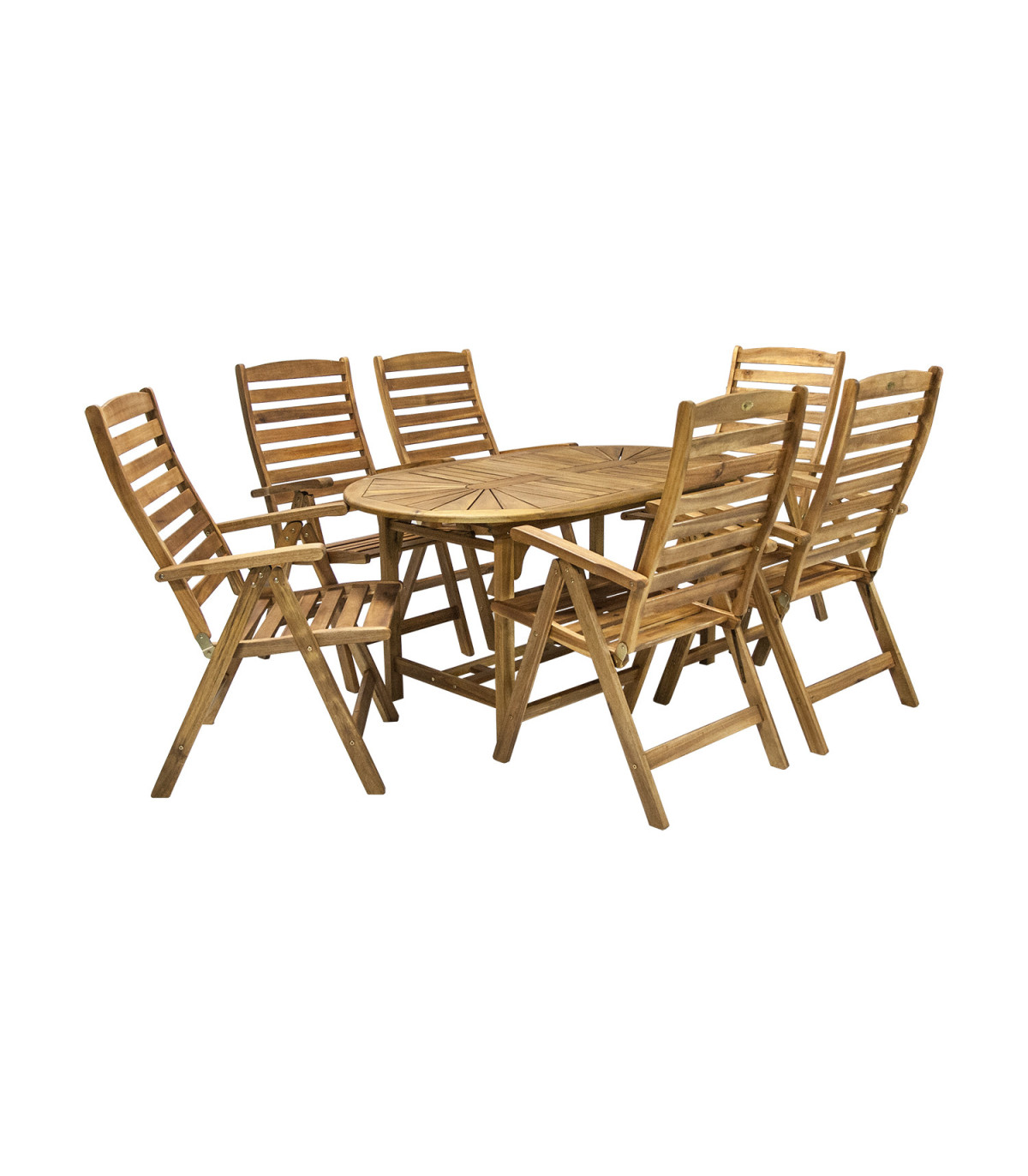Aiamööblikomplekt FINLAY laud ja 6 käetugedega tooli. Laud ja toolid on valmistatud akaatsiapuidust ja viimistletud puidukaitseõliga. Pikendatava laua mõõdud on 153/195x90xH72cm. Laua keskel on 3,5cm auk päikesevarju jaoks. Laud on keskelt pikendatav. Keskelt kokku klapitav 41,5cm lai pikendusosa on paigutatud lauaplaadi alla. Tooli üldmõõdud on 62x66xH110cm, istme laius 51cm, istme sügavus 47cm, istme kõrgus 44cm, seljatoe kõrgus 69cm. Käetoe kõrgus maast 68cm. Kaalupiirang 100kg. Toode on muutlikes ilmastikuoludes vastupidav. HOOLDUS: puit on elav looduslik materjal, mille välisilme ilmastikutingimuste tõttu muutub. Puhastage mööblit regulaarselt, kaitske liigniiskuse ja UV kiirguse eest. Kerge lihvimine ja uus õlikiht vähemalt korra aastas on piisav värskenduskuur mööblile uue näo andmiseks. HOIUSTAMINE: suvehooaja lõppedes soovitame aiamööblit hoiustada siseruumides. Puhastage ja kuivatage mööbel enne hoiule panekut. Kasutage hoiustamiseks kuiva ning hea ventilatsiooniga ruumi. Kaitske mööblit hoiustamise ajal otsese päikesevalguse eest.
