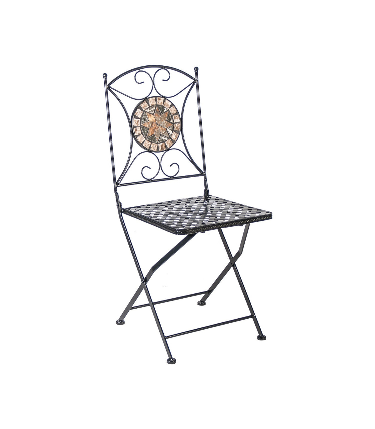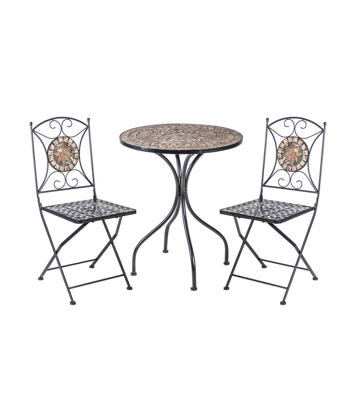 Rõdukomplekt MOSAIC laud ja 2 tooli. Laua mosaiikplaat ja kokkupandavate toolide seljatoed on kaunistatud pruunides ja hallides toonides keraamiliste plaatidega. Laua ja toolide jalad ja raam on valmistatud metallist ja viimistletud musta pulbervärviga. Laua mõõdud on D60xH70cm. Tooli üldmõõdud on 39x53xH90cm. Istme laius 37,5cm, istme sügavus 38cm, istme kõrgus 46cm. Kaalupiirang 90kg. Tooli mõõdud kokkupanduna on 38x100x11cm. HOOLDUS JA HOIUSTAMINE: metallist mööbel on praktiliselt hooldusvaba, piisab regulaarsest puhastamisest. Suvehooaja lõppedes soovitame aiamööblit hoiustada siseruumides. Puhastage ja kuivatage mööbel enne hoiule panekut. Kasutage hoiustamiseks kuiva ning hea ventilatsiooniga ruumi.