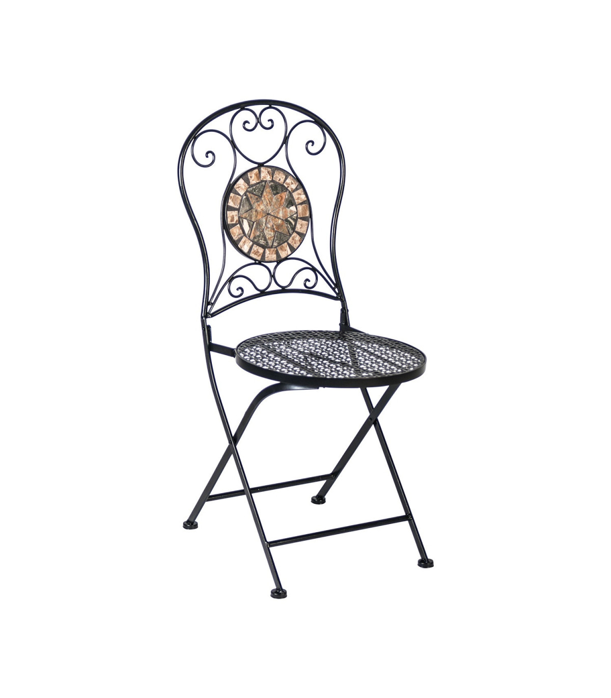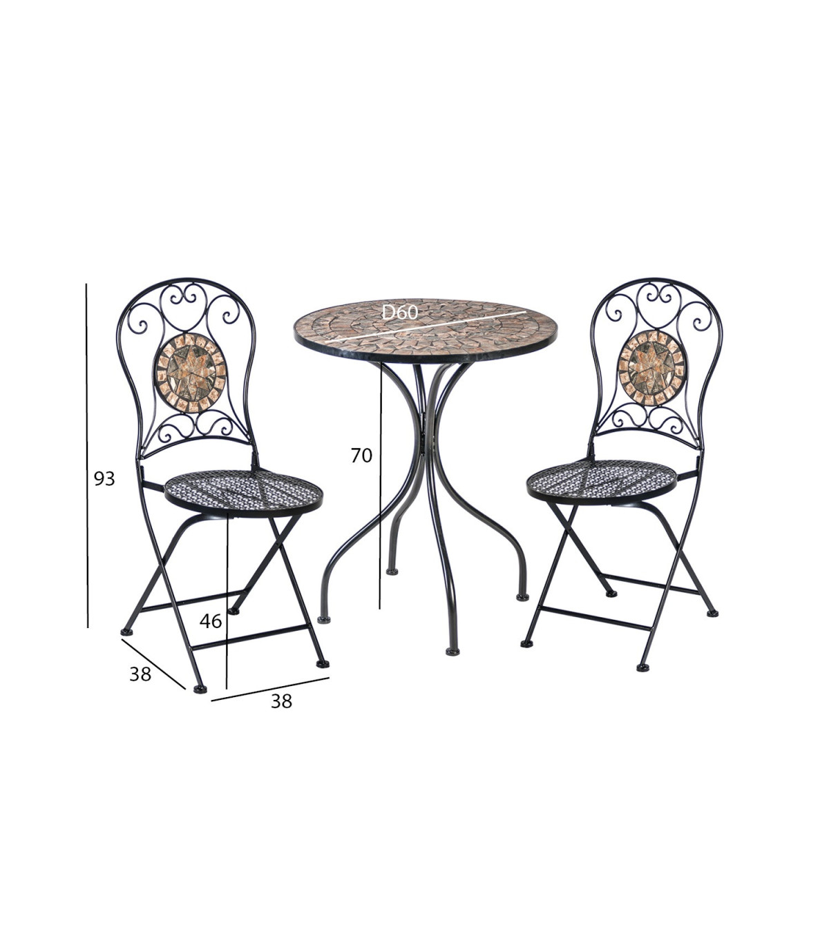 Rõdukomplekt MOSAIC laud ja 2 tooli. Laua mosaiikplaat ja kokkupandavate toolide seljatoed on kaunistatud pruunides ja hallides toonides keraamiliste plaatidega. Laua ja toolide jalad ja raam on valmistatud metallist ja viimistletud musta pulbervärviga. Laua mõõdud on D60xH70cm. Tooli üldmõõdud on 39x53xH90cm. Istme laius 37,5cm, istme sügavus 38cm, istme kõrgus 46cm. Kaalupiirang 90kg. Tooli mõõdud kokkupanduna on 38x100x11cm. HOOLDUS JA HOIUSTAMINE: metallist mööbel on praktiliselt hooldusvaba, piisab regulaarsest puhastamisest. Suvehooaja lõppedes soovitame aiamööblit hoiustada siseruumides. Puhastage ja kuivatage mööbel enne hoiule panekut. Kasutage hoiustamiseks kuiva ning hea ventilatsiooniga ruumi.