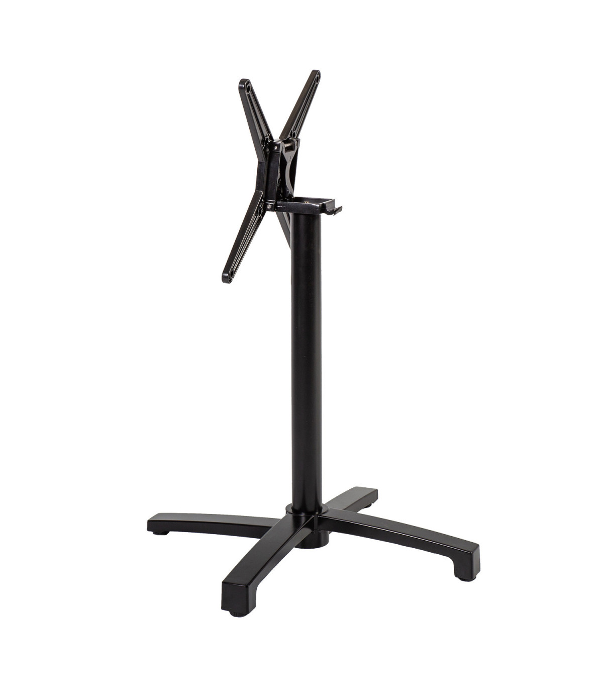 Lauajalg BISTRO 69x69xH72cm, must. Lauajalg on valmistatud alumiiniumist ja viimistletud musta pulbervärviga. Lauaplaadi kanduri mõõdud on 52x52cm. Kandur on küljele keeratav. Alusristi mõõdud on 69x69cm, tugipost D60x1,5mm. Lauajala juurde sobiva lauaplaadi maksimaalsed mõõdud on 90x90cm. Lauaplaadi kinnituskruvid ei kuulu komplekti. Toode on ilmastikukindel.