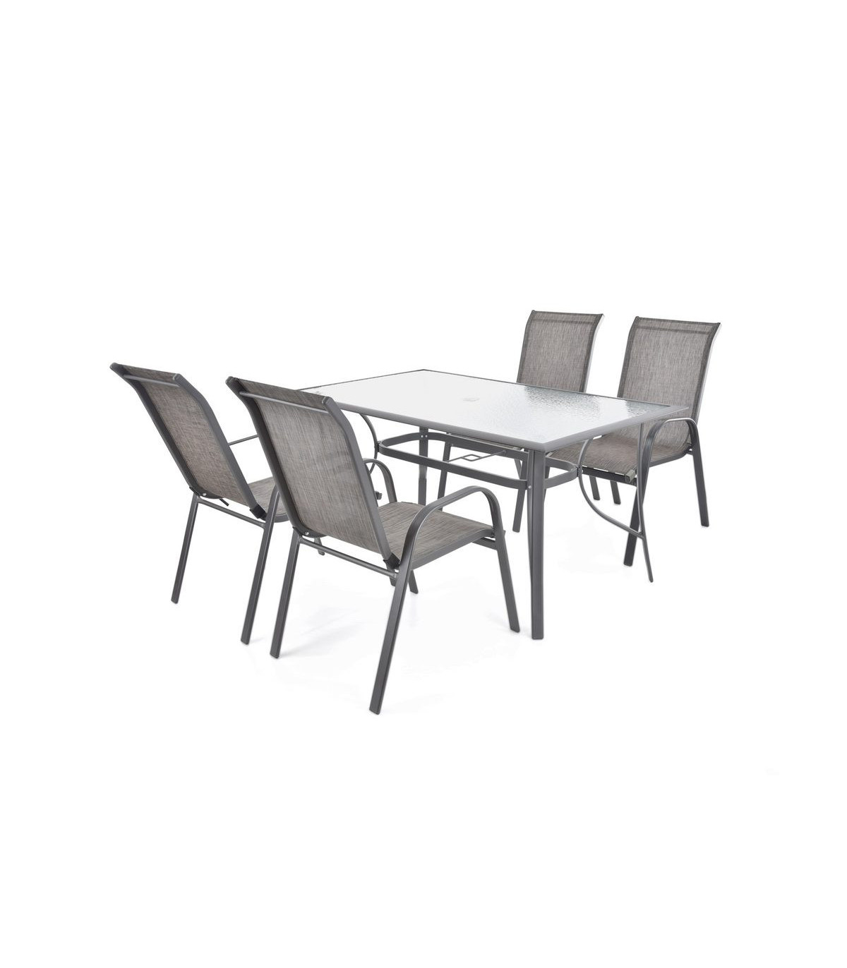 Valmistatud komposiit terasest ja alumiiniumprofiilidest. Laua tasapind karastatud klaas. Komplektis 4 tooli ja laud. Kandevõime 120 kg.