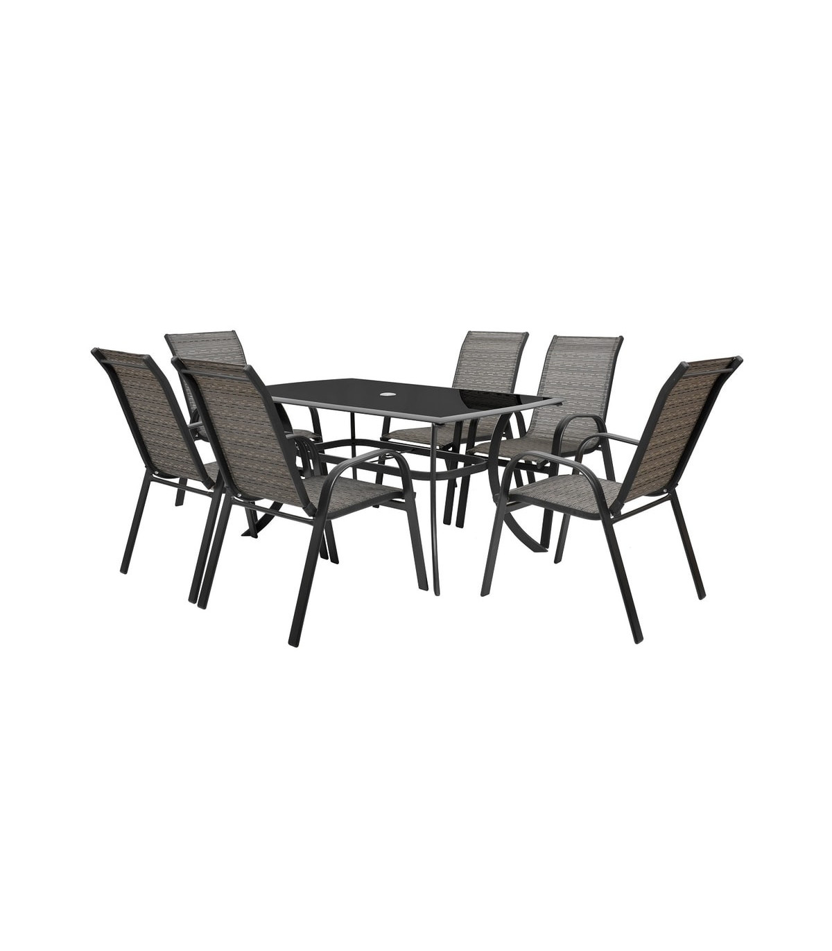 Kuus virnastavat tooli ja karastatud musta klaasiga alumiiniumprofiilidest laud. Sobib välis- ja siseruumides. Sobib kasutamiseks niiskes keskkonnas. Tooli kandevõime 120kg.