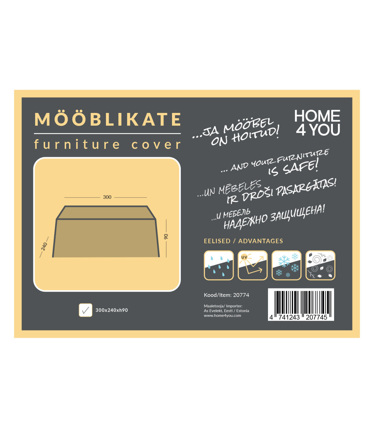 TÄHELEPANU! Mööblikate aitab pikendada mööbli eluiga ning on turvaline kaitse välimööblile, kuid ei taga samasuguseid tingimusi nagu siseruumides hoiustamine. Tugeva vihma korral võivad kattega kaetud mööblile koguneda veelombid. Eemaldage kogunenud vesi esimesel võimalusel. Peske katet vastavalt tootele kinnitatud hooldusjuhendile. Mööblikatte kasutamine ei ole sobiv lahendus aiamööbli ületalve õues hoidmiseks.