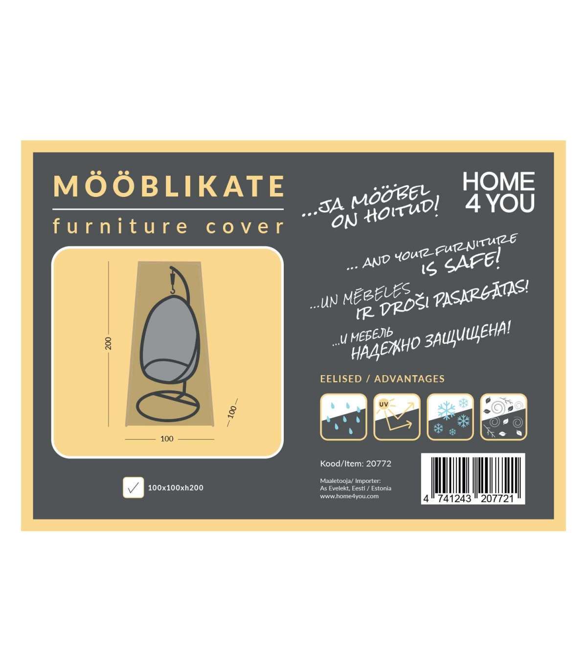 TÄHELEPANU! Mööblikate aitab pikendada mööbli eluiga ning on turvaline kaitse välimööblile, kuid ei taga samasuguseid tingimusi nagu siseruumides hoiustamine. Tugeva vihma korral võivad kattega kaetud mööblile koguneda veelombid. Eemaldage kogunenud vesi esimesel võimalusel. Peske katet vastavalt tootele kinnitatud hooldusjuhendile. Mööblikatte kasutamine ei ole sobiv lahendus aiamööbli ületalve õues hoidmiseks.