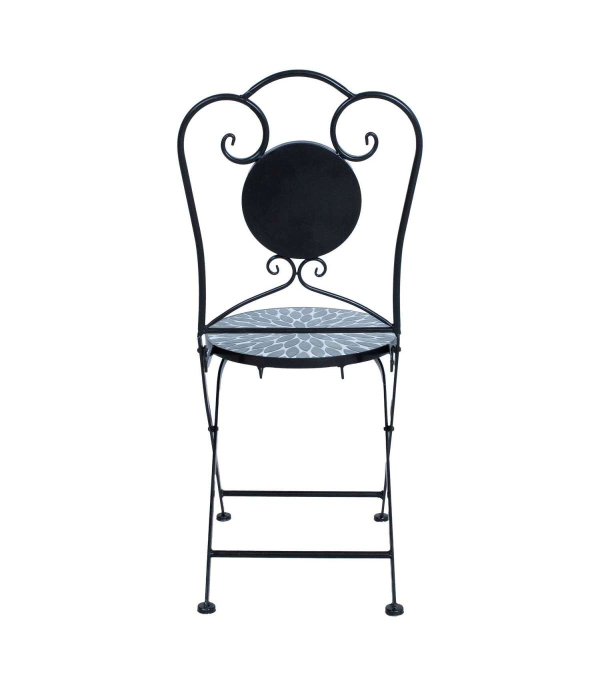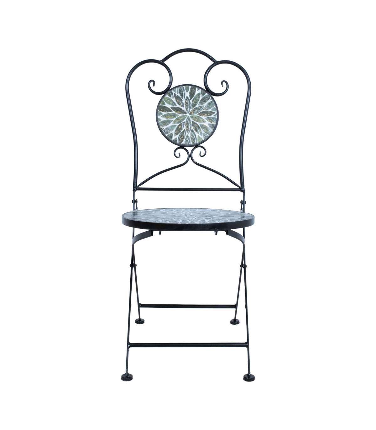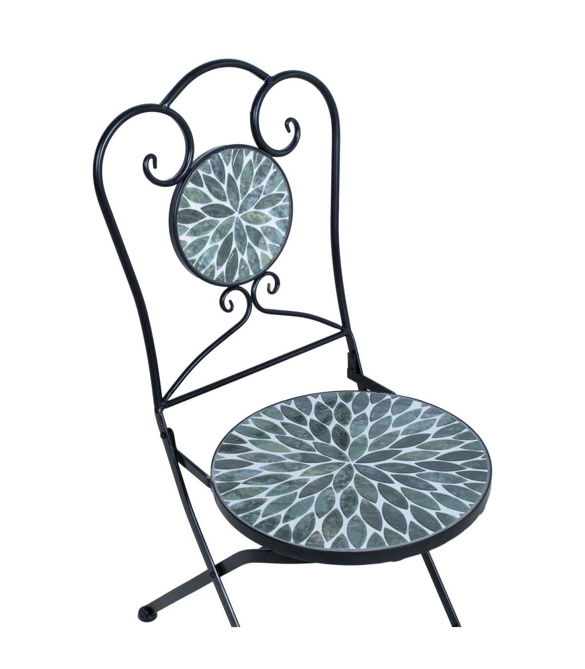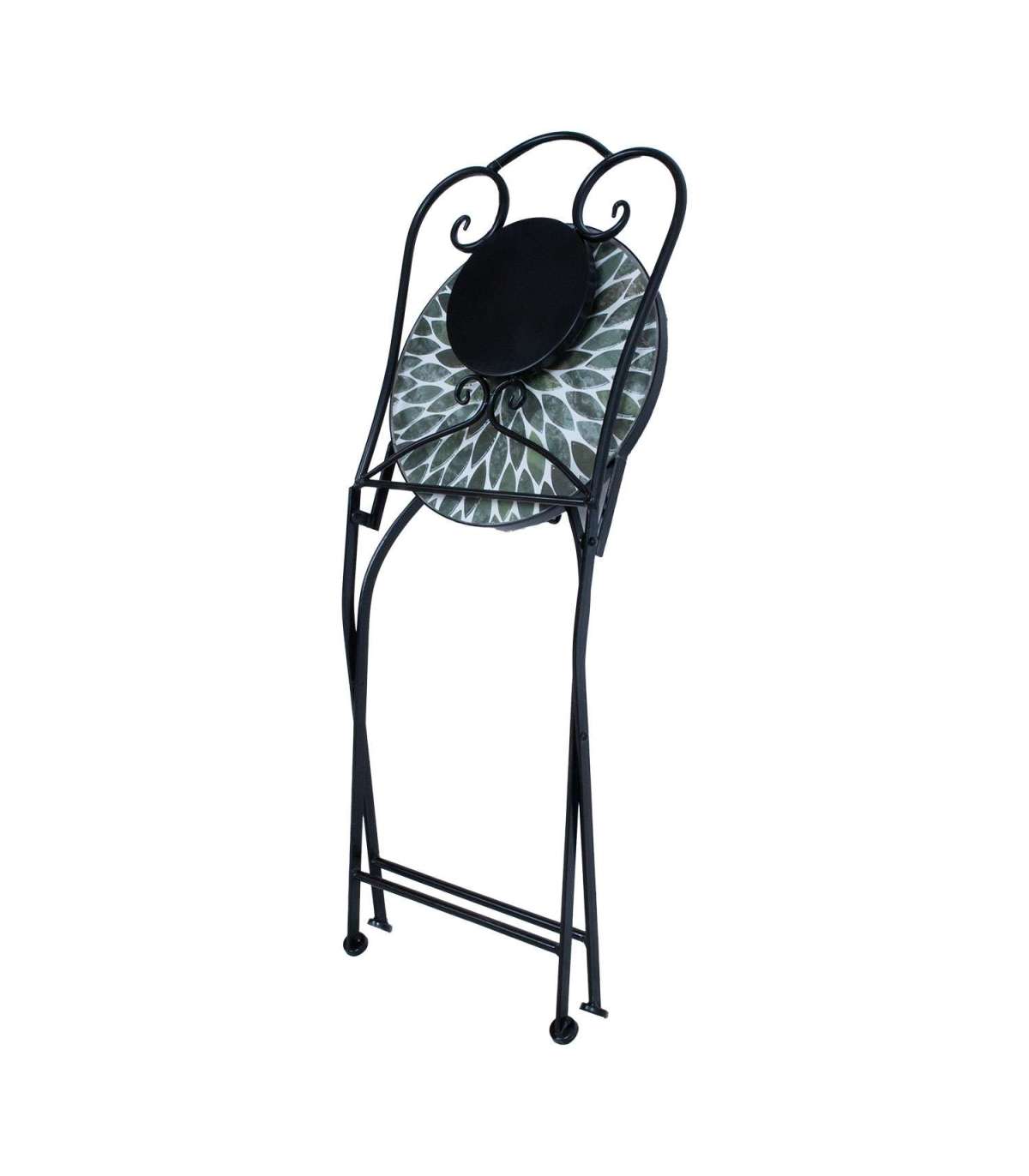 Tooli iste ja seljatugi: roheliste lehemotiividega keramiline plaat.