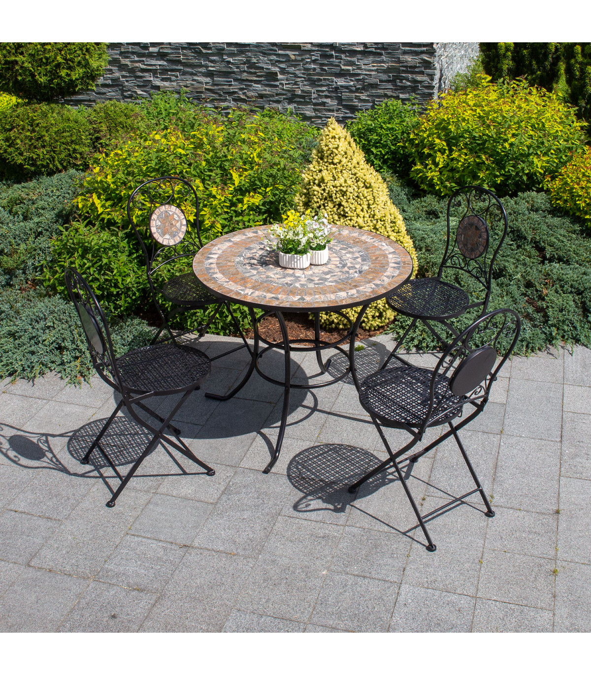 Tool MOSAIC kokkupandav. Tool on valmistatu metallist ja viimistletud musta pulbervärviga. Seljatuge kaunistab pruunides ja hallides toonides mosaiikplaat. Tool on kokkupandav. Tooli üldmõõdud on 40x51xH90cm. Istme laius 38cm, istme sügavus 38cm, istme kõrgus 46cm. Kaalupiirang 90kg. Tooli mõõdud kokkupanduna on 40x103x11cm.