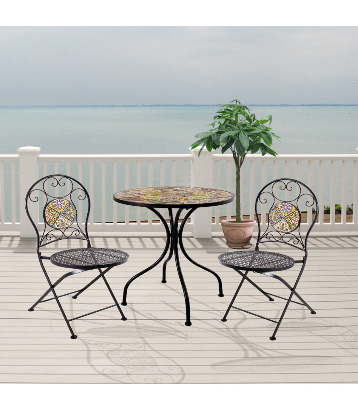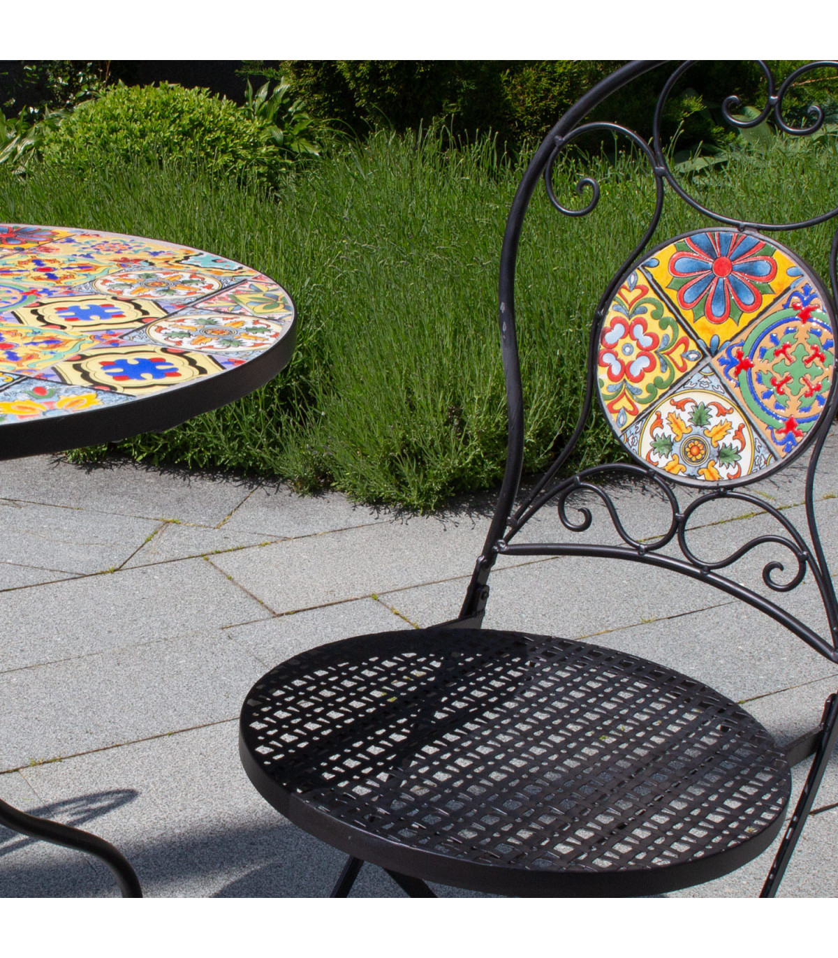 Tool MOROCCO kokkupandav. Tool on valmistatu metallist ja viimistletud musta pulbervärviga. Seljatuge kaunistab Morocco stiilis värviline mosaiikplaat. Tool on kokkupandav. Tooli üldmõõdud on 40x51xH90cm. Istme laius 38cm, istme sügavus 38cm, istme kõrgus 46cm. Kaalupiirang 90kg. Tooli mõõdud kokkupanduna on 40x103x11cm.