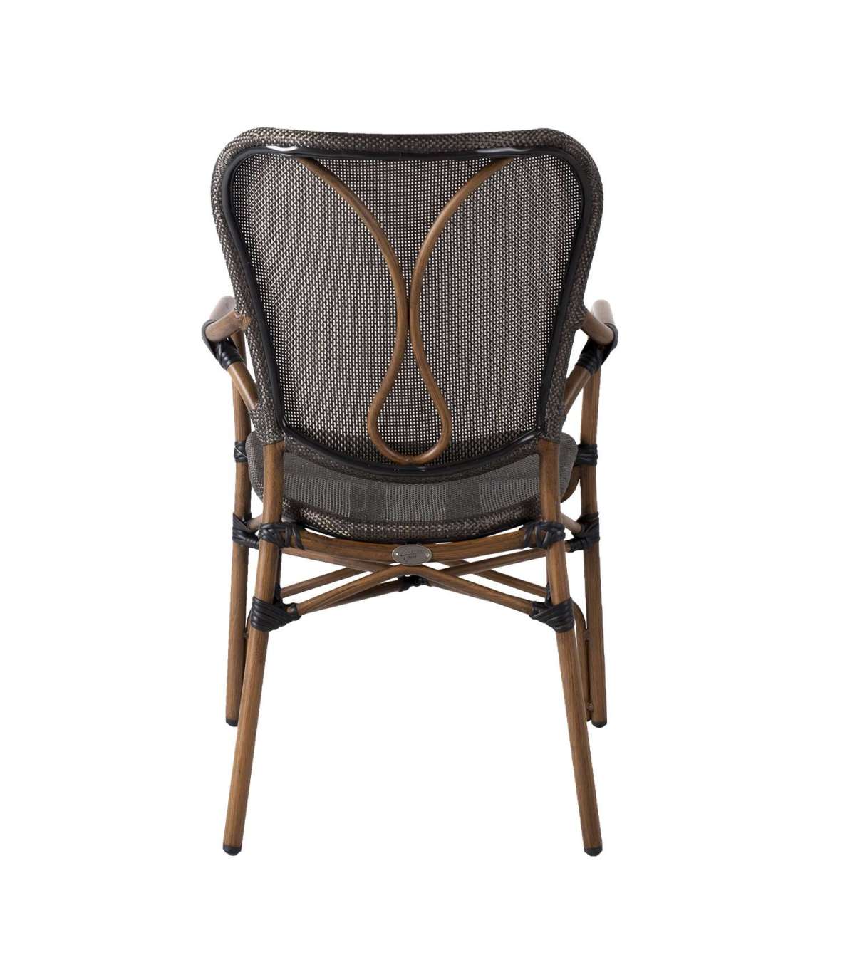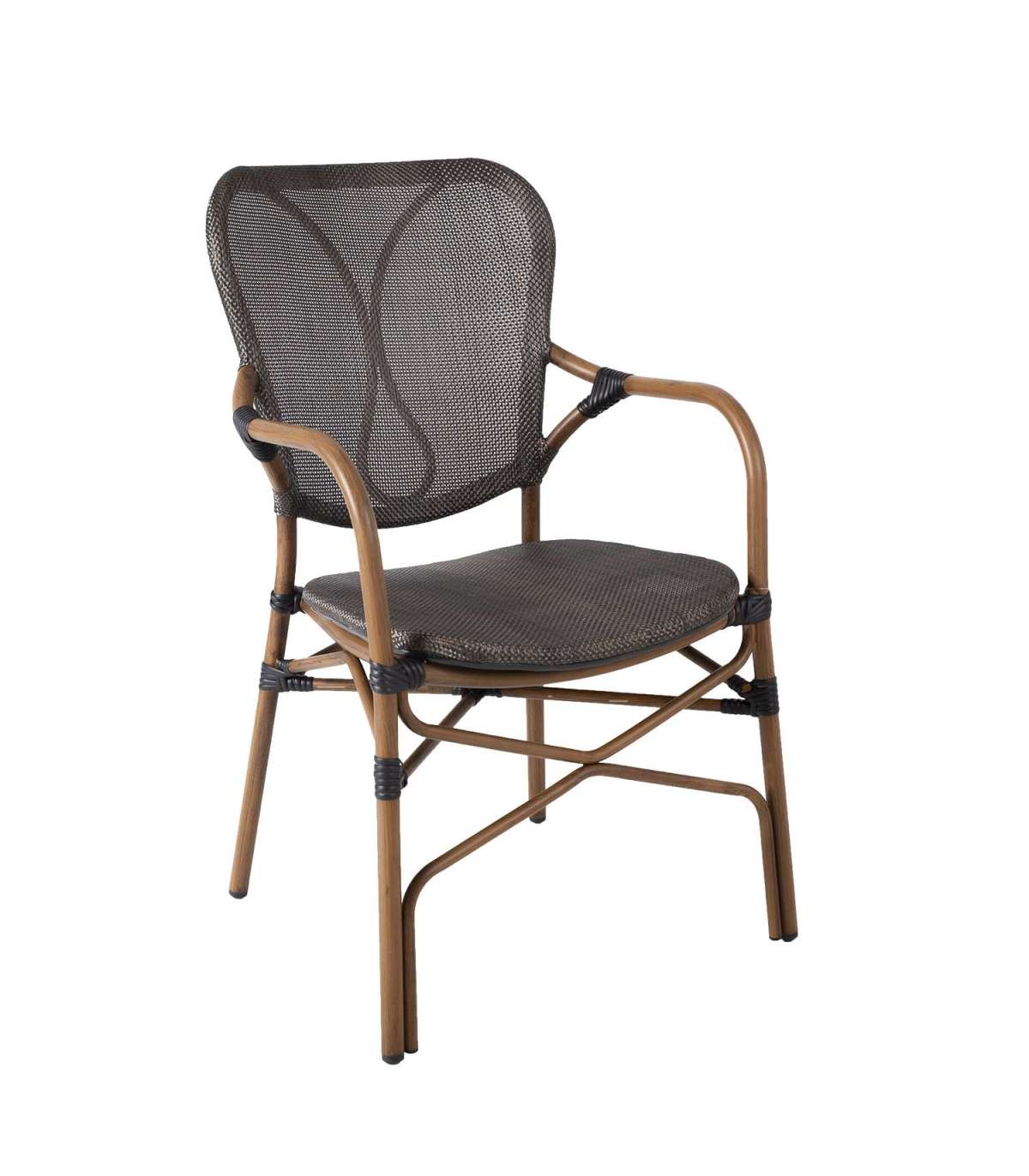 Tool BAMBUS käetugedega 55x62xH92,5cm, tumepruun. Prantsuse bistroo stiilist inspireeritud mugav ja vastupidav tool on suurepärane valik koduaeda või kohvikusse. Tool sobib hästi ka siseruumides kasutamiseks. Tooli raam on valmistatud alumiiniumist ja viimistletud bambust meenutava pruuni pulbervärviga. Alumiiniumtoru mõõdud on D28x1,5mm. Iste ja seljatugi on kaetud pruuni textilenega, mis laseb hästi õhku läbi ja kuivab kiiresti. Tooli üldmõõdud on 55x62xH92,5cm, istme laius 46cm, istme sügavus 45cm, istme kõrgus 47cm, seljatoe kõrgus 52cm. Käetoe kõrgus maast 67cm. Kaalupiirang 120kg. Toolid on virnastatavavad ning nende hoiustamine on lihtne ja ruumisäästev. Toode on muutlikes ilmastikutingimustes hästi vastupidav ja lihtsalt hooldatav.