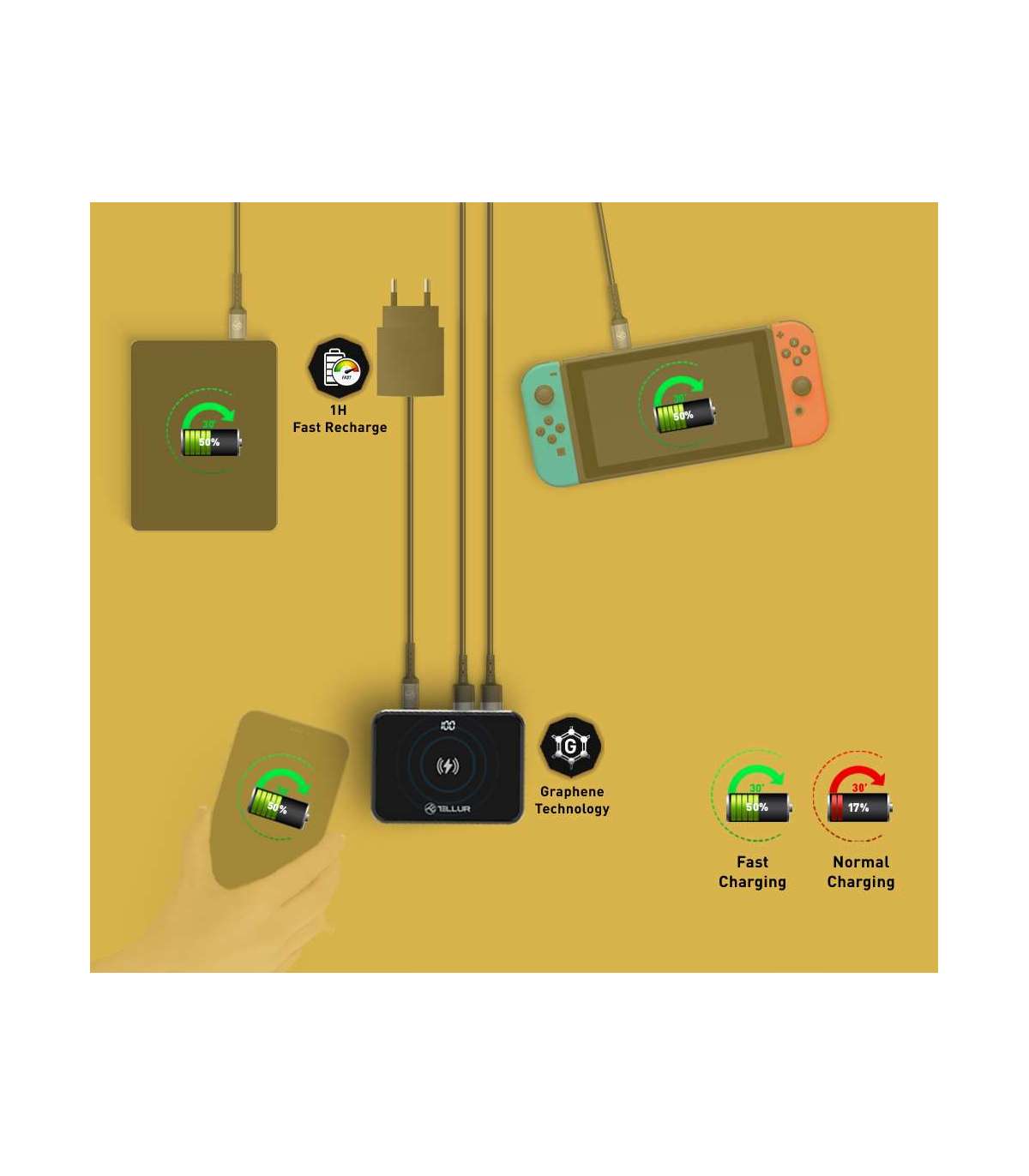 Omadused: revolutsiooniline grafeenitehnoloogia, digitaalne ekraan, kiire laadimine, 3 telefoni samaaegne laadimine – üks juhtmevabalt ja kaks kiirlaadimist, seinalaadija USA, EL ja Ühendkuningriigi pistikutega