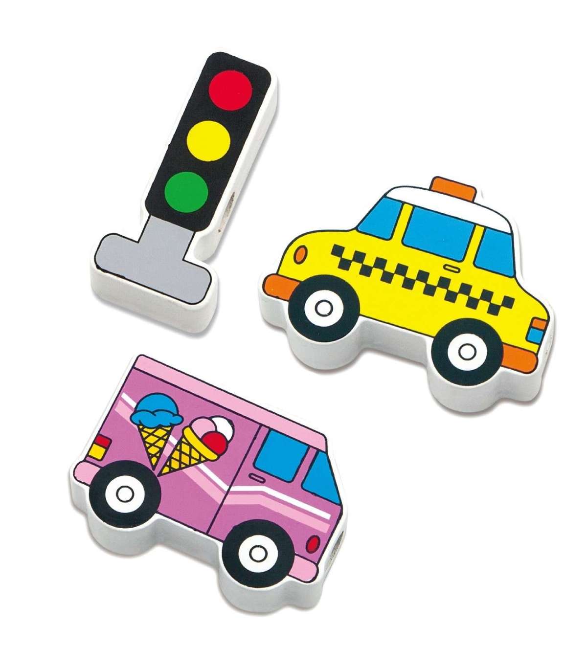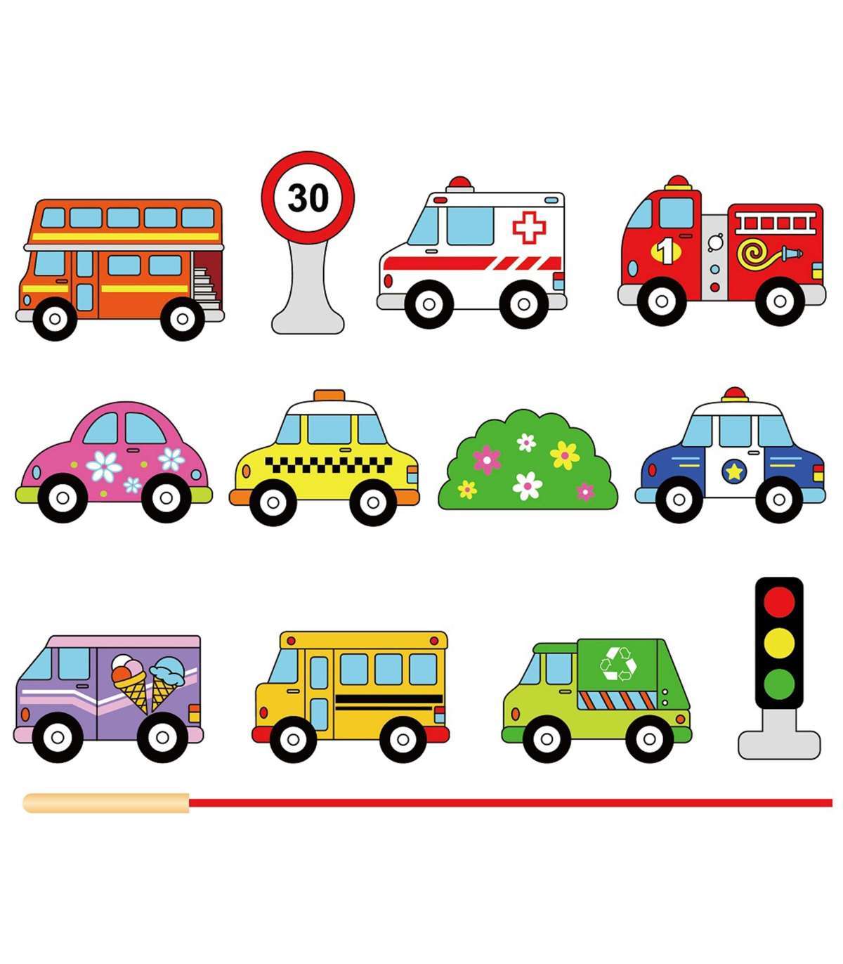 Komplektis on 12 elementi, sh bussid, värvilised autod, politseiauto, liiklusmärk, valgusfoor ja muud. Mänguasi stimuleerib kujutlusvõimet ning arendab motoorseid ja nägemisoskusi.