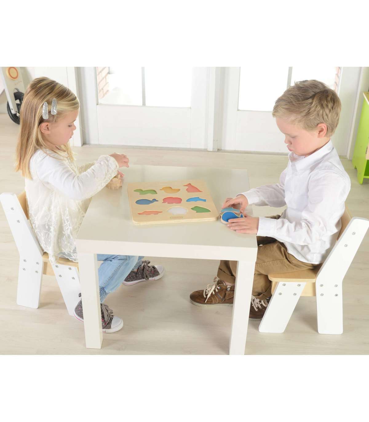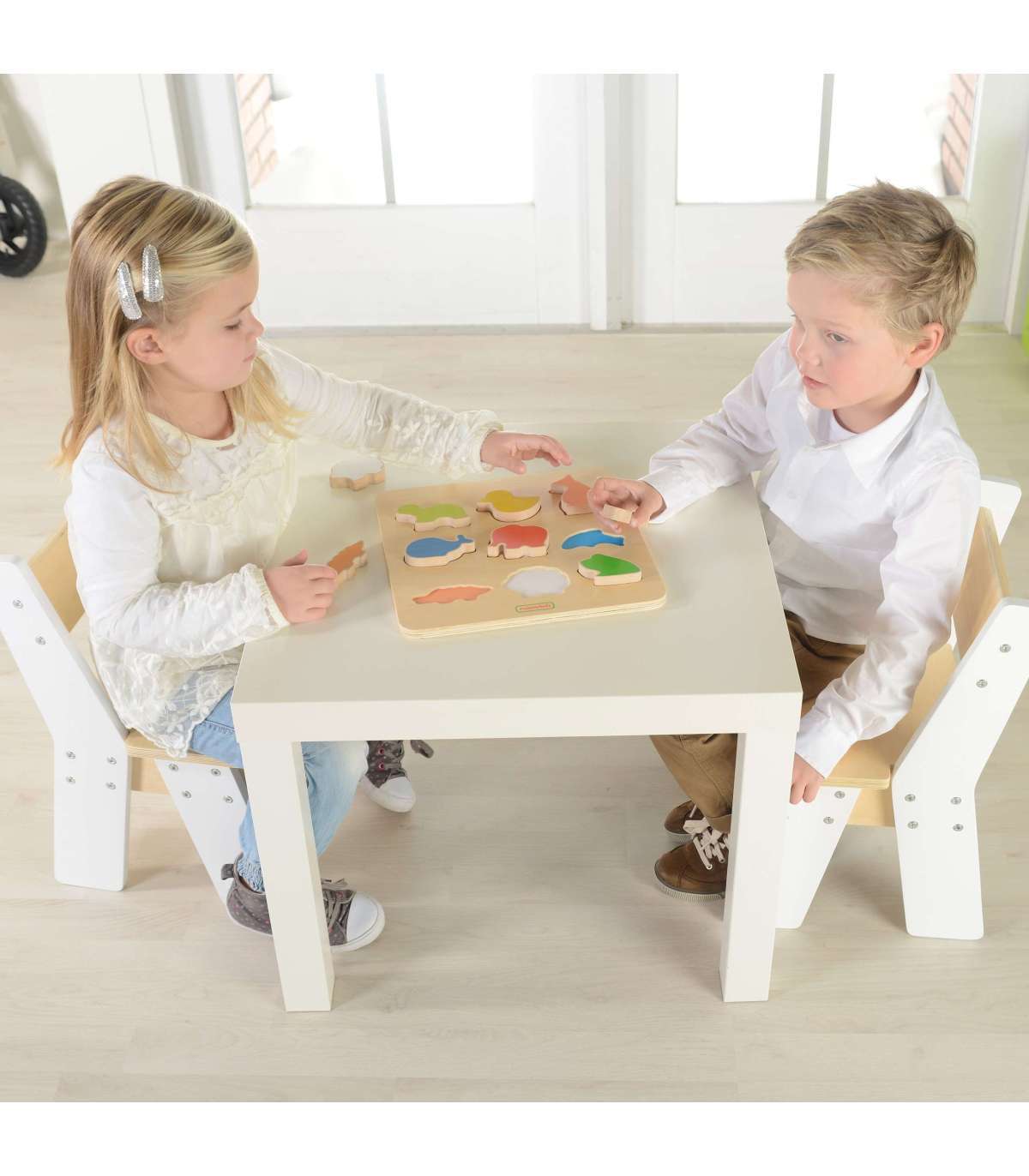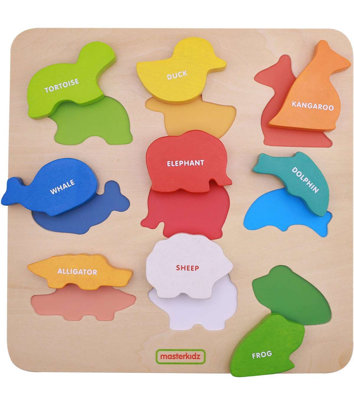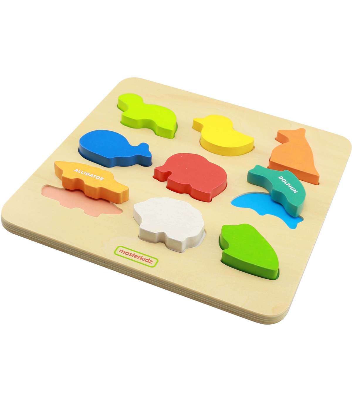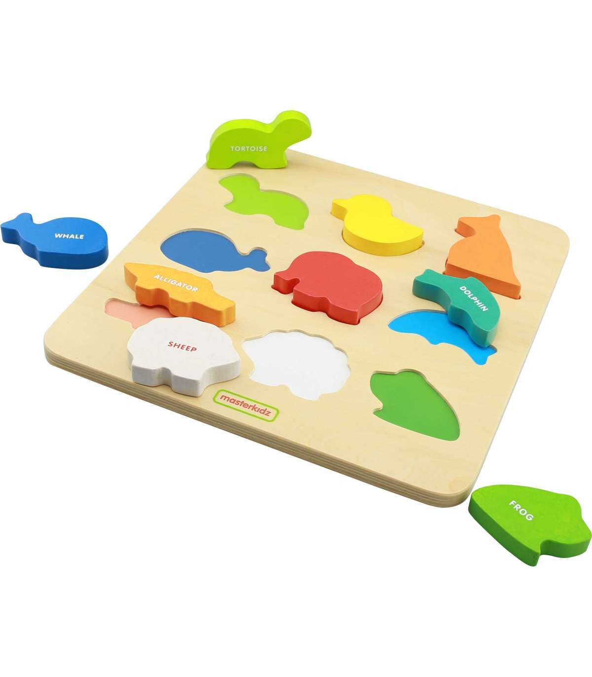 Masterkidz Colorful Animals kujundite sorter on suurepärane puidust mänguasi lastele, millel on palju kasutusvõimalusi. See mänguasi sobib suurepäraselt mitte ainult lapse lõbustamiseks. Tänu puidust klotsidele, mis on kujundatud värvilisteks loomadeks, saab väikelaps õppida nende nimesid inglise keeles. Mänguasja teine funktsioon on loogilise mõtlemise arendamine. Laps peab sobitama tegelased vastavatesse avadesse puidust plaadil, mis nõuab keskendumist ja kujundite analüüsimist. Kui õnnestub leida kujund, mis sobib õigesse auku, on lapse ülesanne see sinna asetada, mis nõuab silma-käe koordinatsiooni.