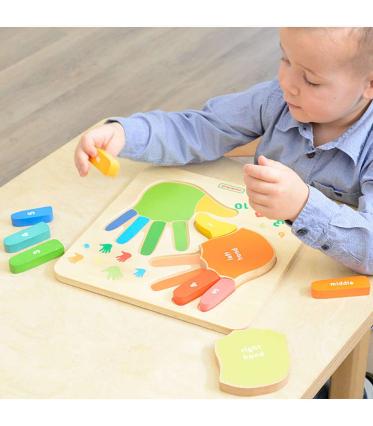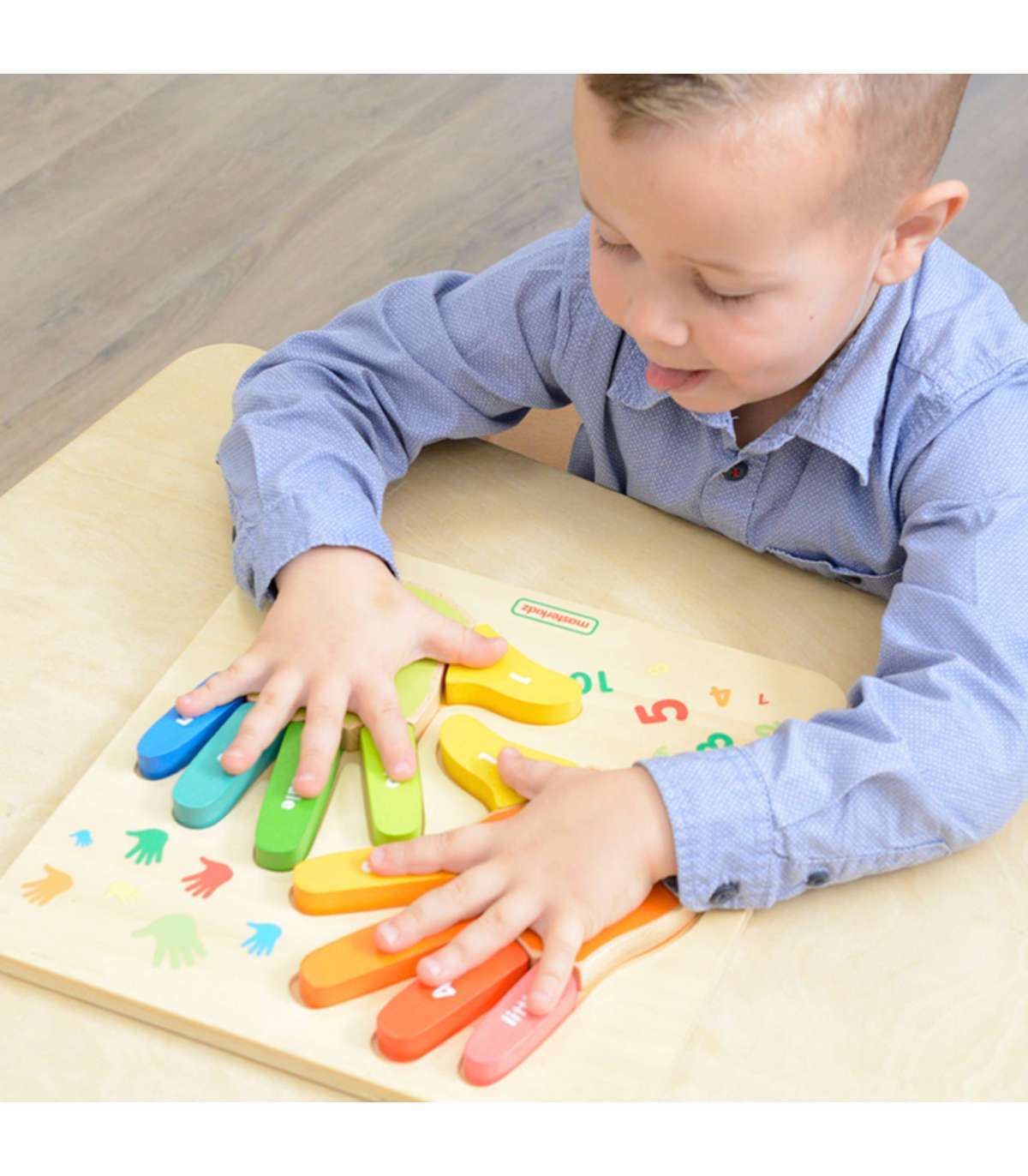 Tänu imelisele laste haridustahvlile õpivad nad sõrmedel loendamist ilma igasuguse probleemita. Mänguasi koosneb kahest värvilisest käsist, mis on paigutatud puidust tahvlile.