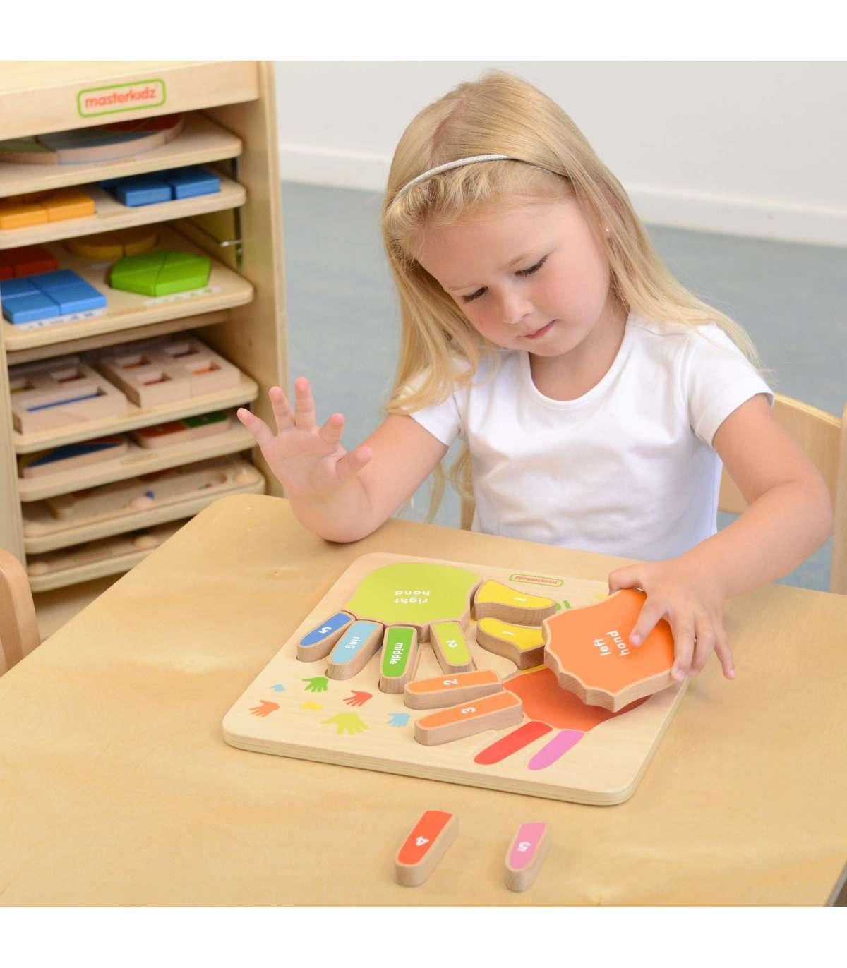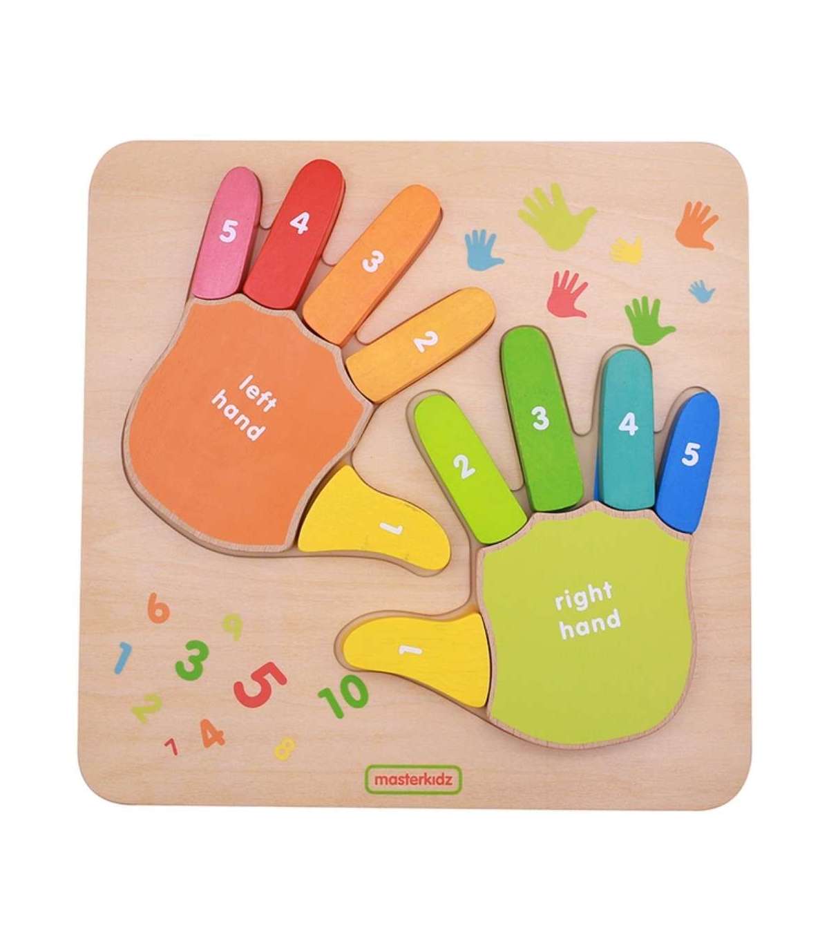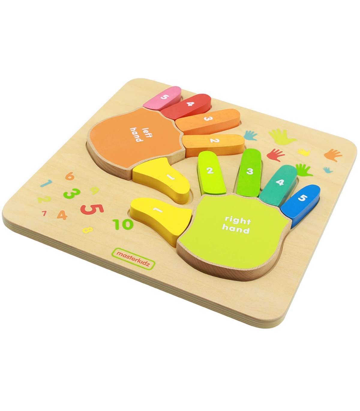 Puidust tahvel sõrmede lugemiseks brändilt MASTERKIDZ on suurepärane abi väikestele, kes alustavad oma matemaatilist seiklust. Värvilised käed tahvlil on selgelt märgistatud sõrmede nimetustega ja külgede järgi: parem ja vasak. Igal sõrmel on ka määratud number, nii et laps saab õpitut rakendada oma sõrmedel lugemisel, kui ta mõistab põhimõtet.