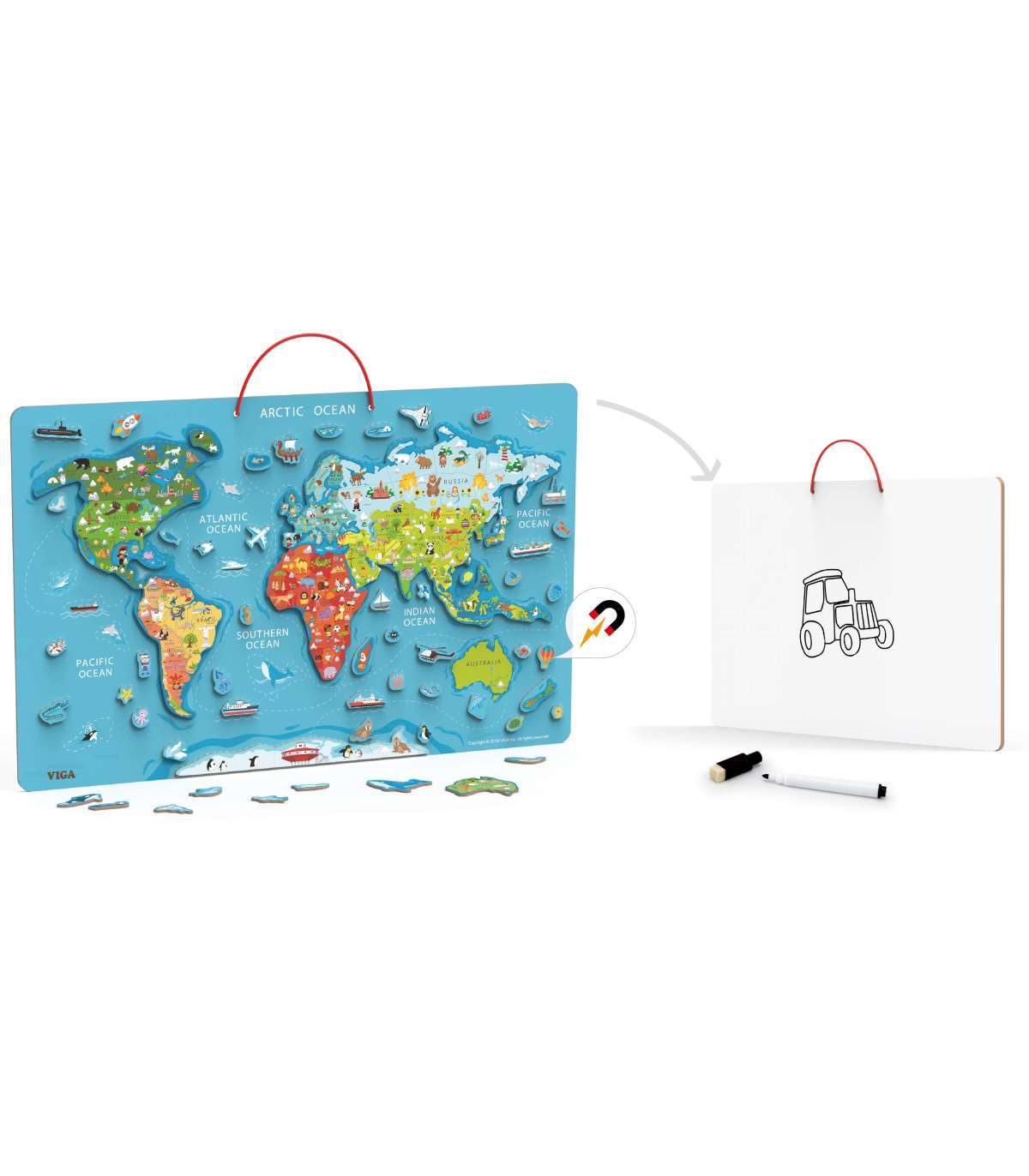 Hariduslik tahvel 2-ühes magnetilise maailma kaardiga Viga, mis on samas ka joonistamistahvel, on ideaalne mänguasi maailma vastu uudishimulikele noortele avastajatele! Kaunilt valmistatud tahvel magnetiliste osadega ühendab hariduslikud väärtused lõbusa mänguga. Aseta puidust osad – kontinendid, laevad, lennukid, raketid ja ookeanipõhjas elavad loomad. Kaart on märgistatud inglise keeles ja toetab suurepäraselt inglise keele õppimist.
