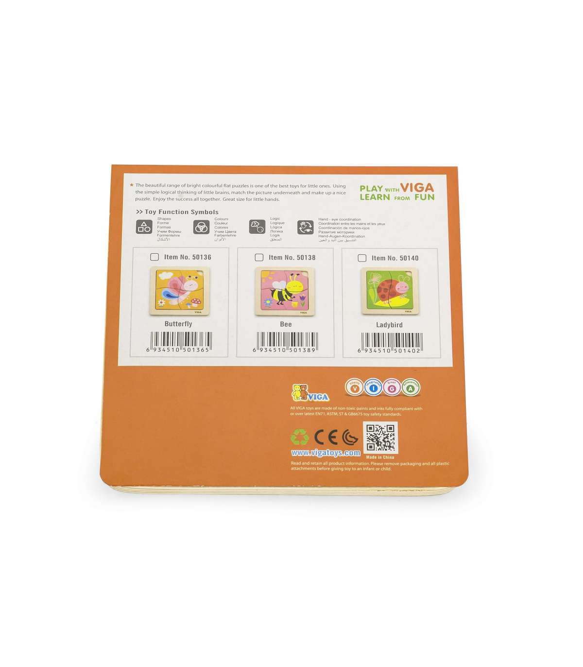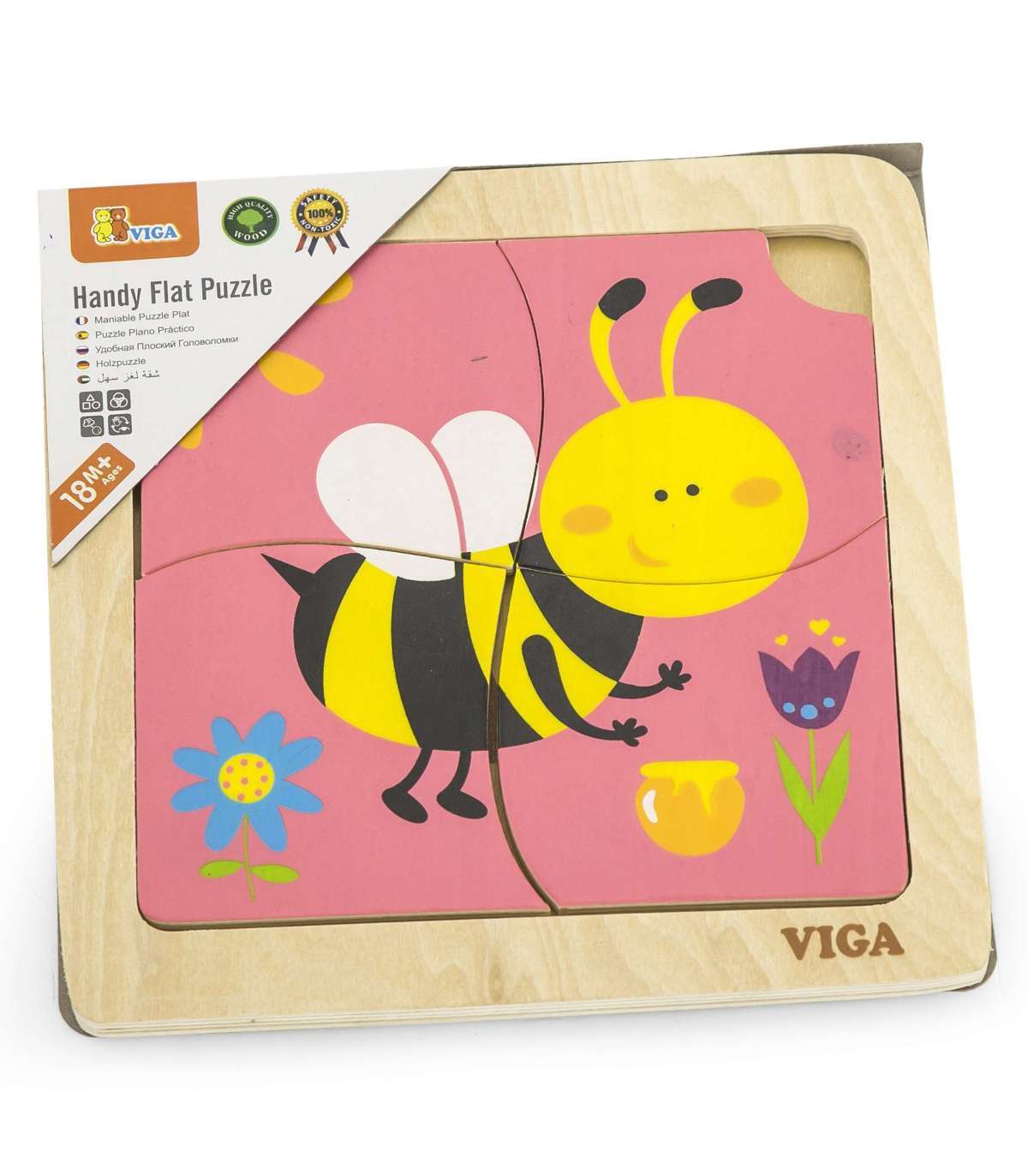 Drewniane Puzzle od Viga dla dzieci od 12 miesiąca życia to idealne rozwiązanie do domu, jak i do przedszkola. Składa się z planszy, oraz 4 elementów tematycznych, które należy do niej zamontować. Na drewnianej podstawce znajduje się narysowany gotowy obrazek, dzięki czemu dziecku jest łatwiej dopasować obrazek. Całość wykonana została z drewna i pomalowana bezpiecznymi dla dziecka farbami w żywe barwy, które zadowolą każdego użytkownika i dadzą mnóstwo radości z zabawy.