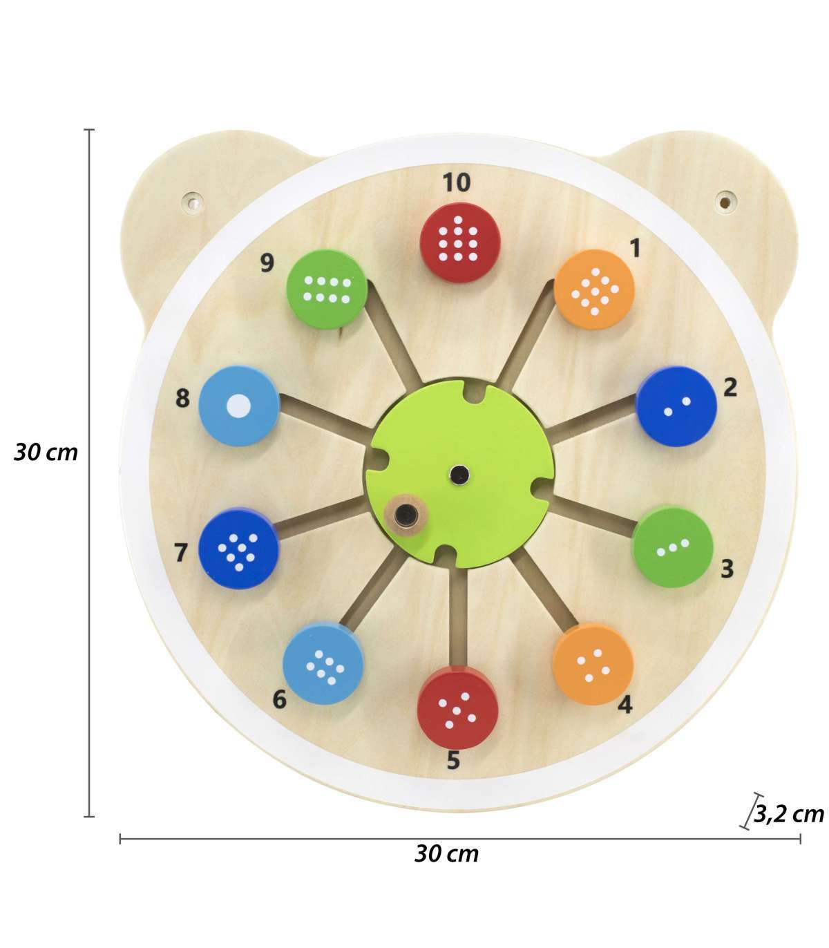 Üks sarja puidust tahvleid armsa karu peaga. Tahvel ümmarguste klotsidega, millel on vastav arv täpikesi, mida tuleb sobitada tahvlile märgitud vastava numbriga. Mänguasi aitab lastel arendada loogilist mõtlemist ning samuti aitab värvide ja numbrite õppimisel. Toode sobib ideaalselt nii koduseks kasutamiseks kui ka haridusasutustesse ja algklassidesse. Tahvli huvitav kuju püüab kindlasti iga lapse tähelepanu. Kogu on valmistatud lakkitud puidust ja värvitud mittetoksiliste erksate värvidega, mis rõõmustavad iga kasutajat ja annavad palju mängurõõmu. Toode on mõeldud lastele alates 18 kuu vanusest. Meie valikus on terve sari karu pea kujulisi tahvleid.