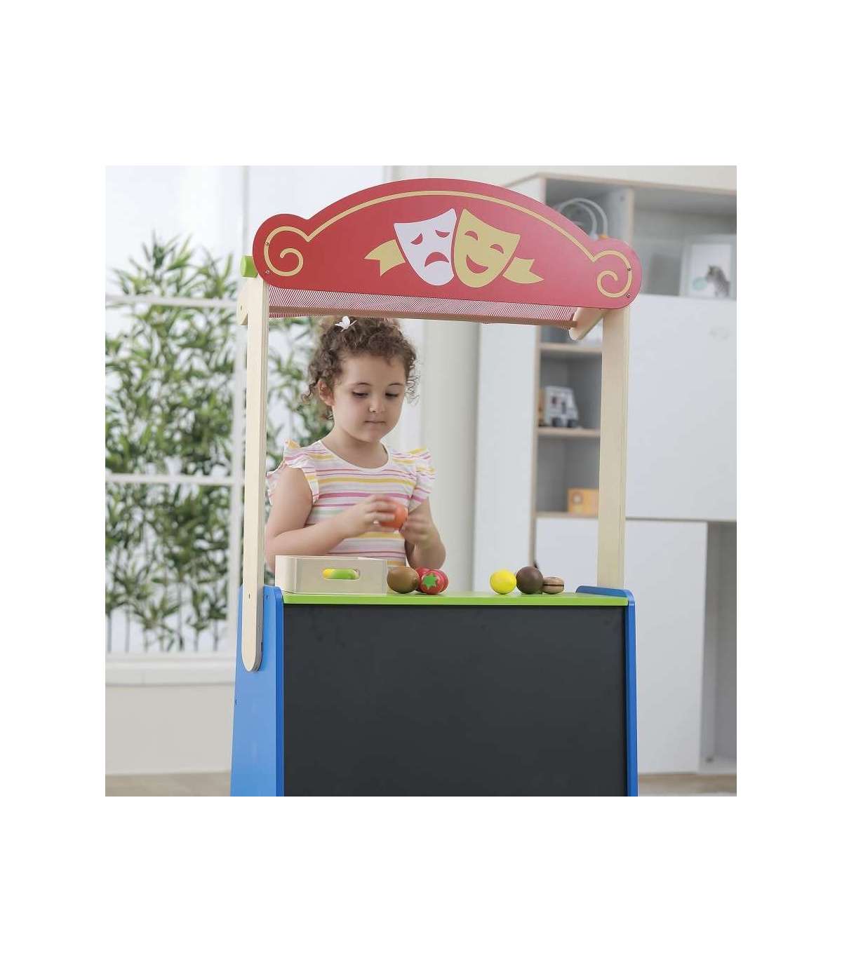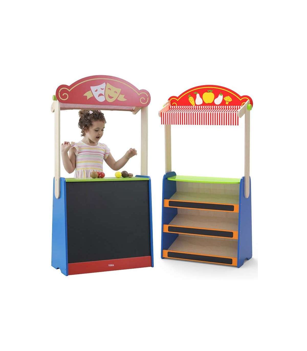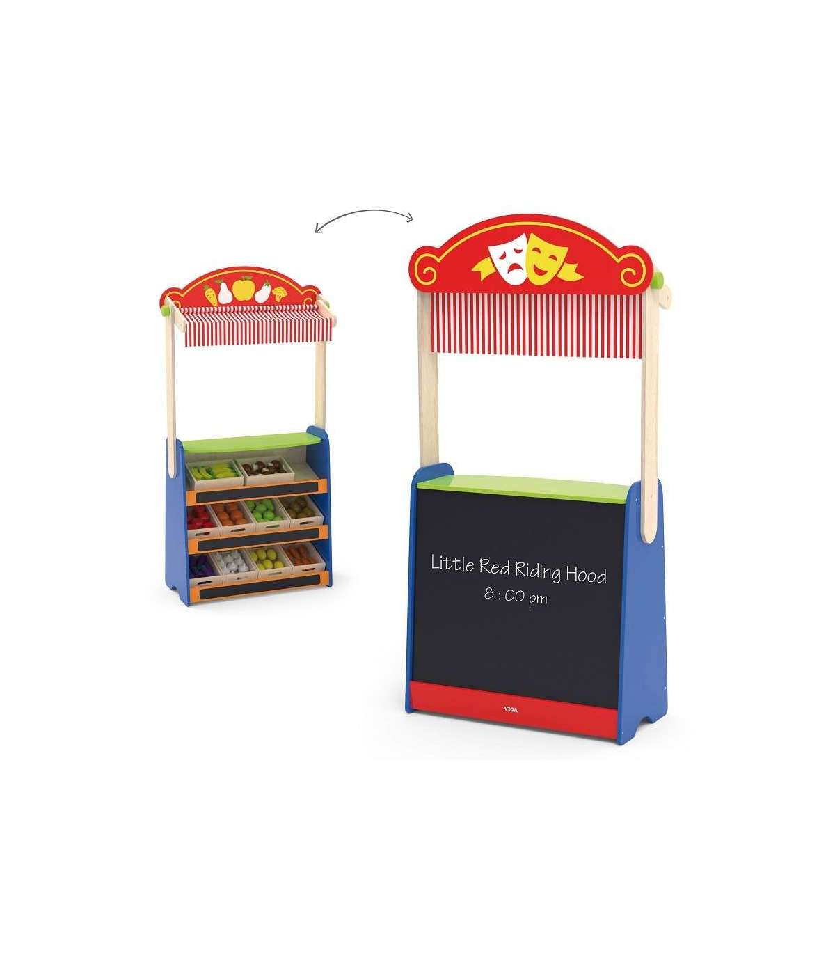 See kvaliteetne Viga Toysi mänguasi on teatri ja toidupoe kombinatsioon. Lihtsalt pöörake mänguasi ümber ja saate võtta täiesti uusi rolle.
