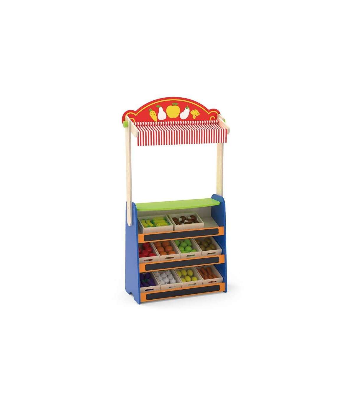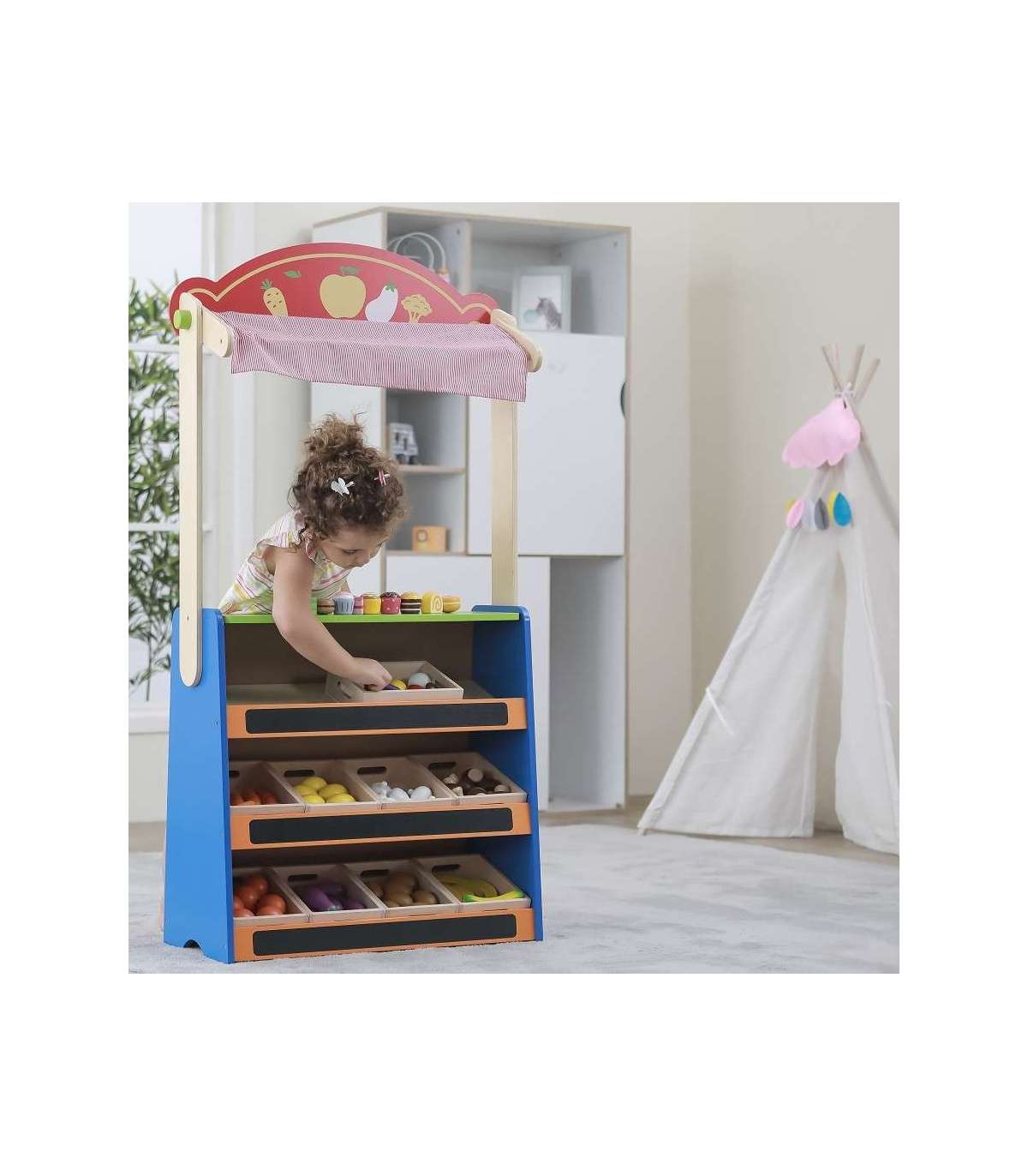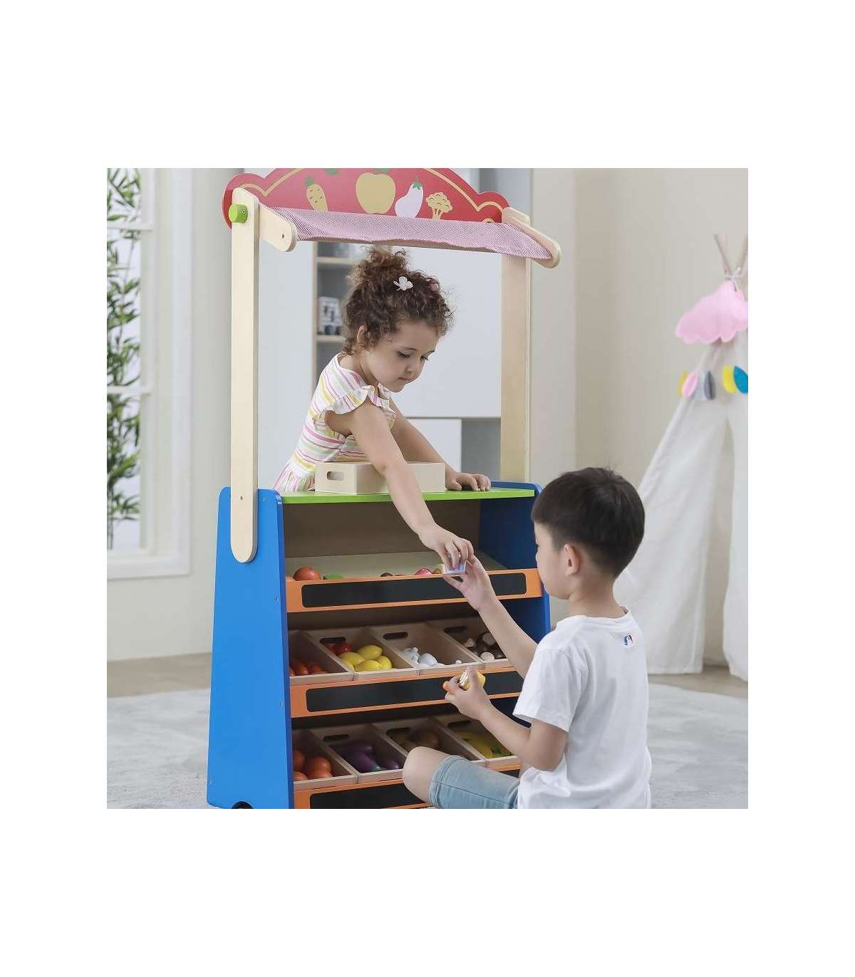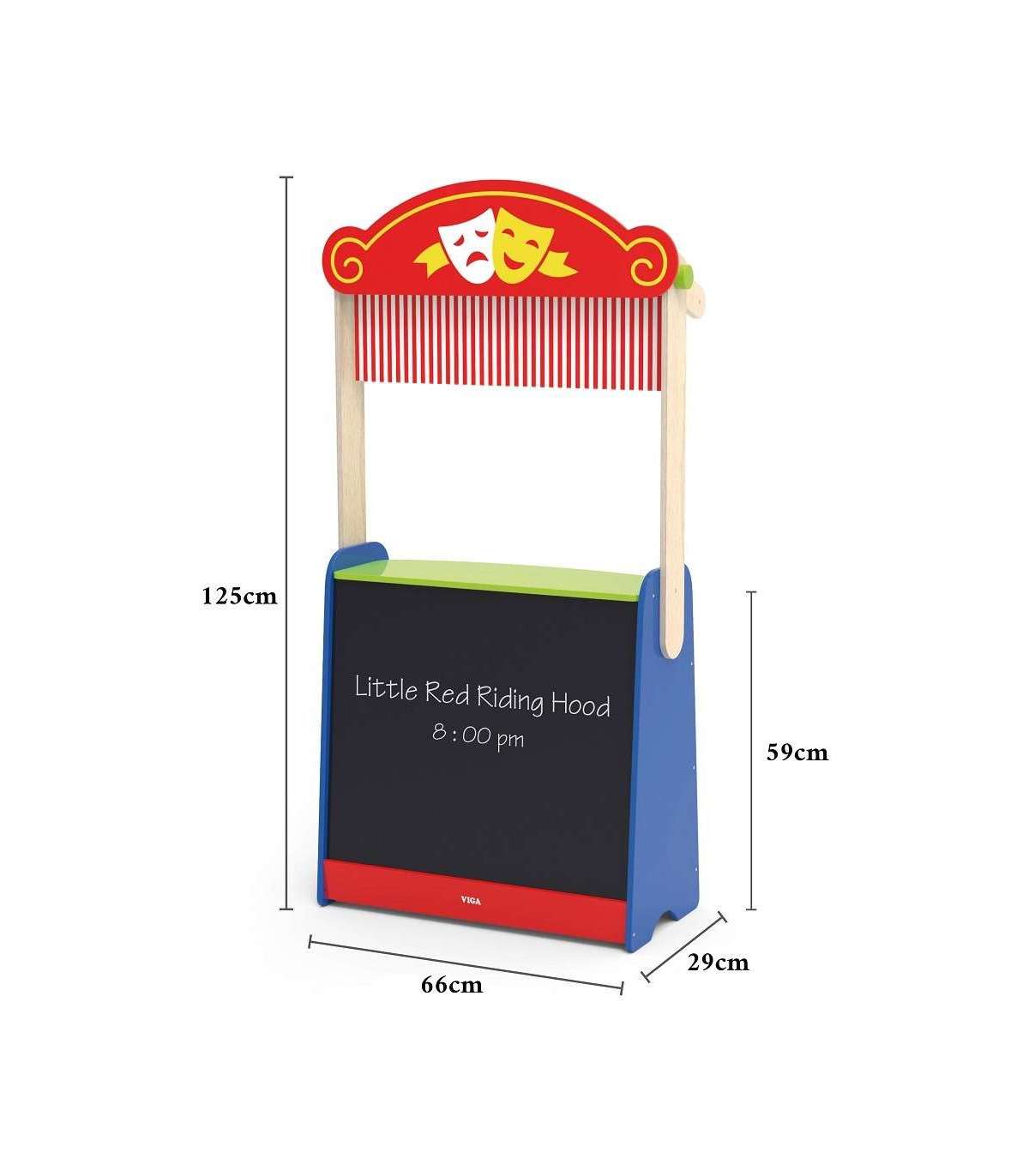 See kvaliteetne Viga Toysi mänguasi on teatri ja toidupoe kombinatsioon. Lihtsalt pöörake mänguasi ümber ja saate võtta täiesti uusi rolle.