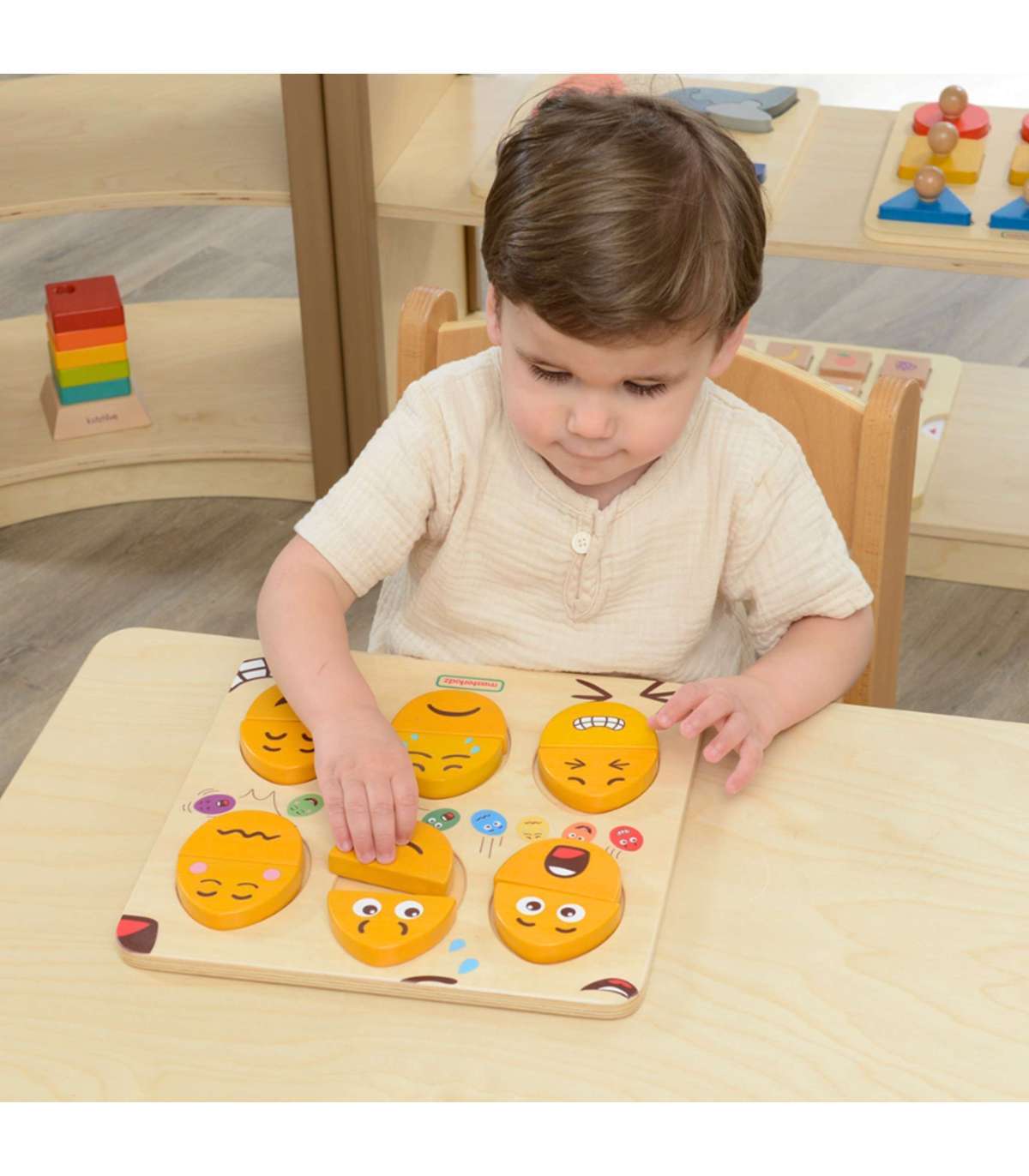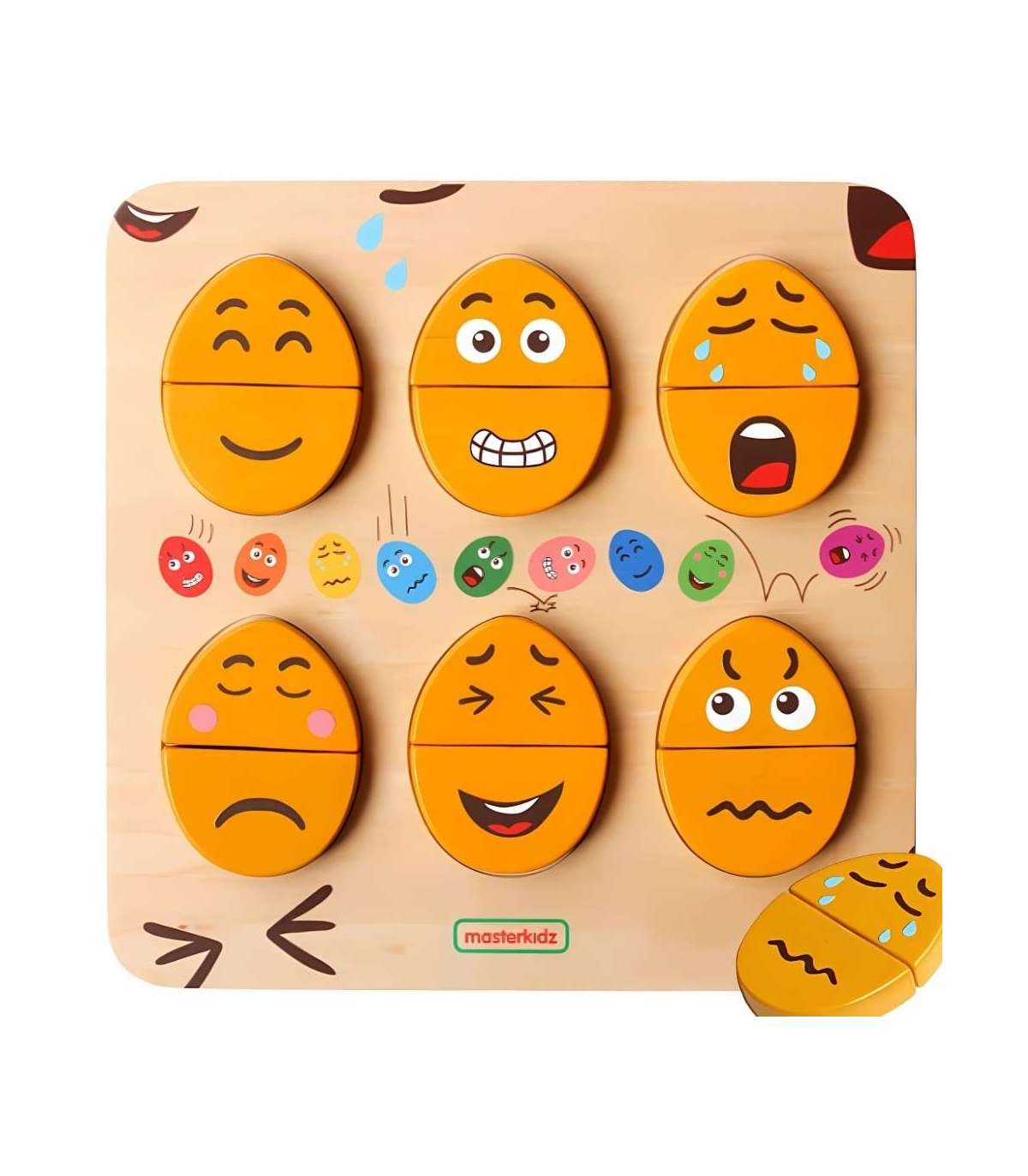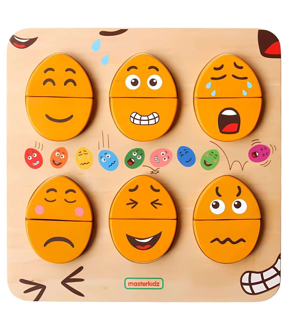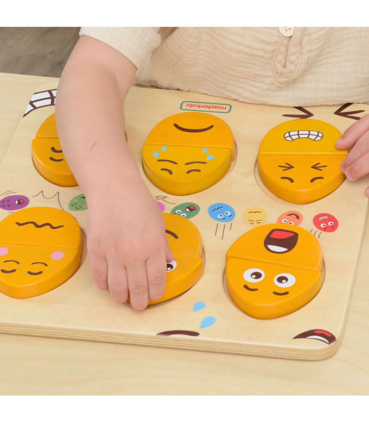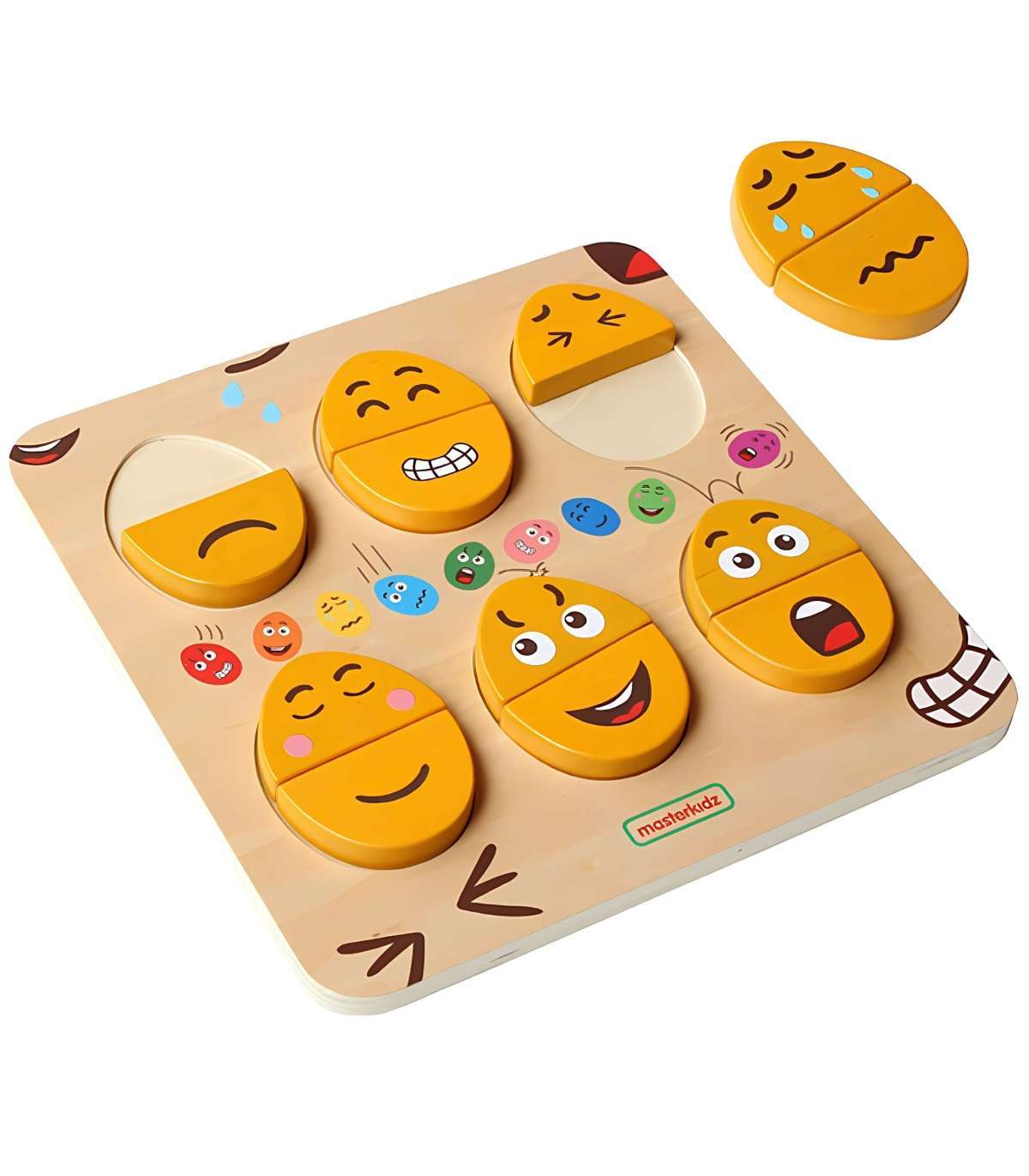 Puidust tahvel emotsioonide õppimiseks marki MASTERKIDZ. Tahvel on mõeldud aitama lastel arendada emotsionaalset teadlikkust ja sotsiaalseid oskusi. Lapsed saavad üla- ja alaosa kombineerida erinevatel viisidel, et luua näoilme. See on eriti kasulik vahend, mis julgustab lapsi mitteverbaalselt väljendama oma tundeid. Seda saab kasutada ka vahendina õpetamaks lapsi empaatiast, paludes neil nende klotside abil ära arvata või järele teha teiste tundeid.