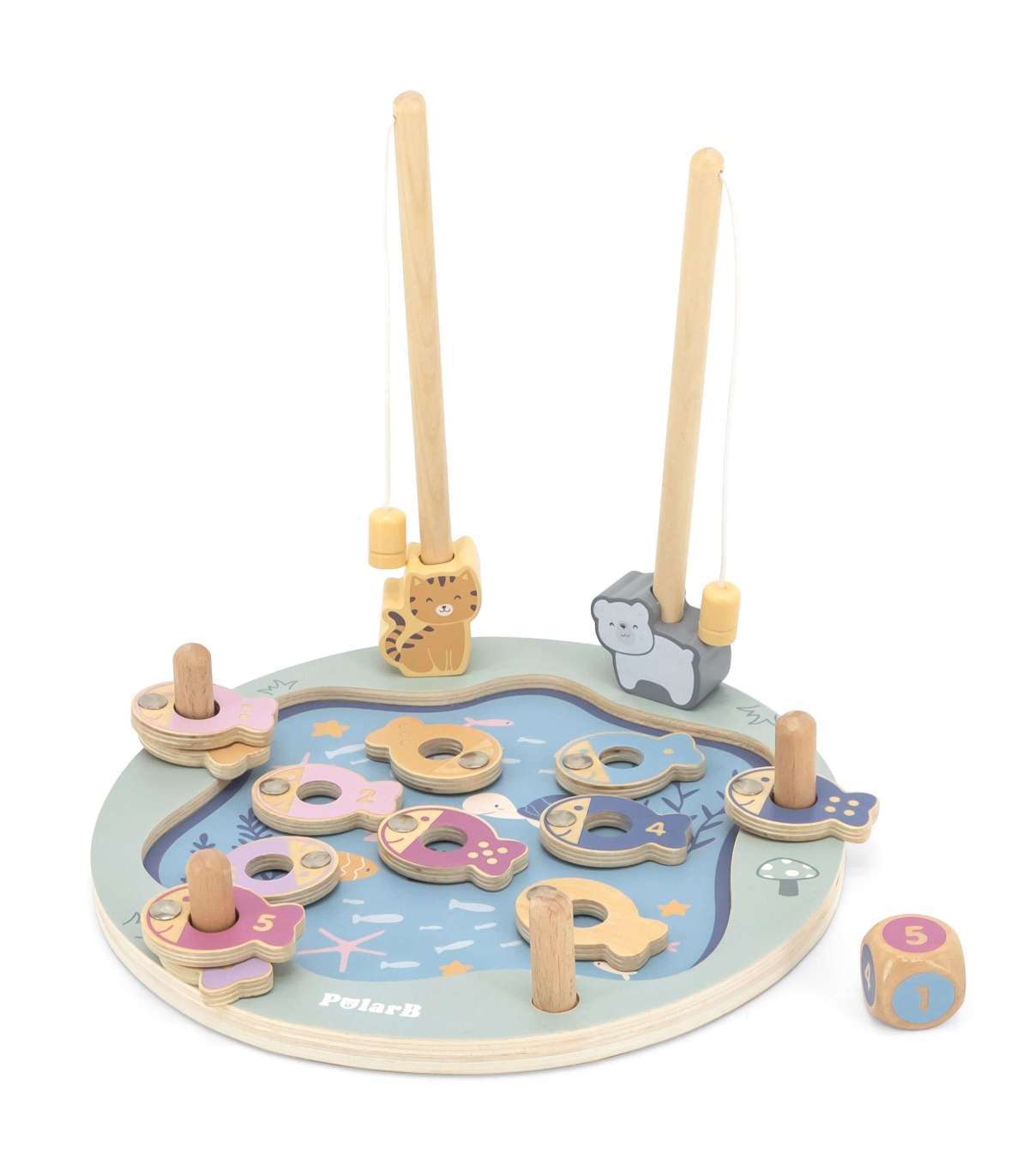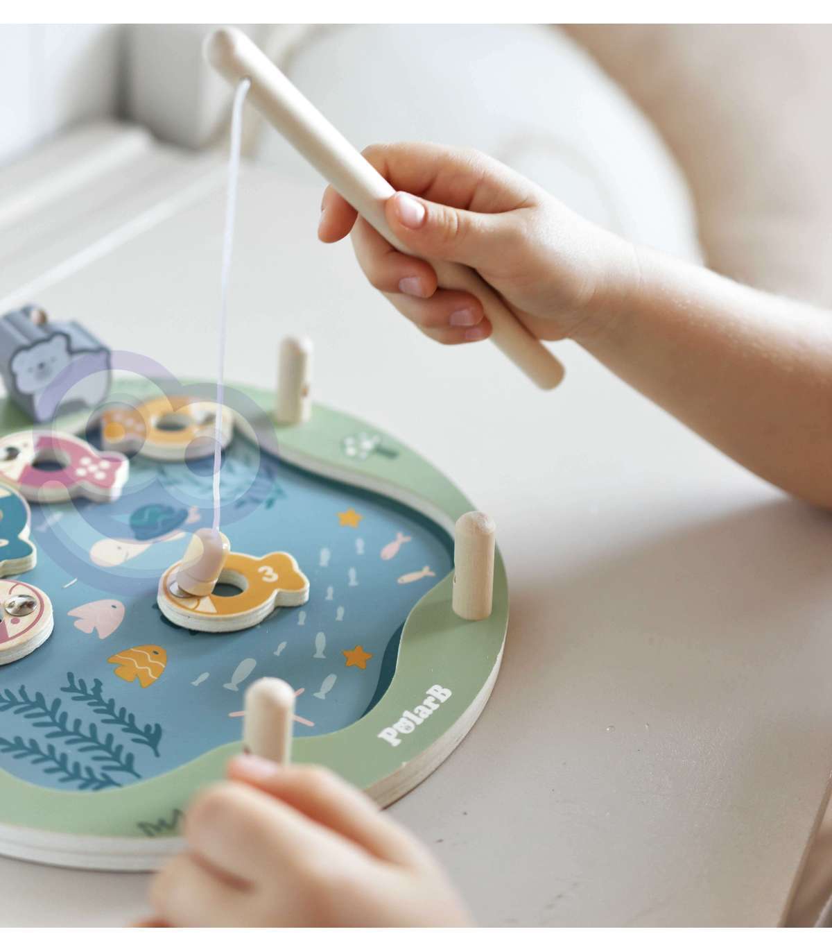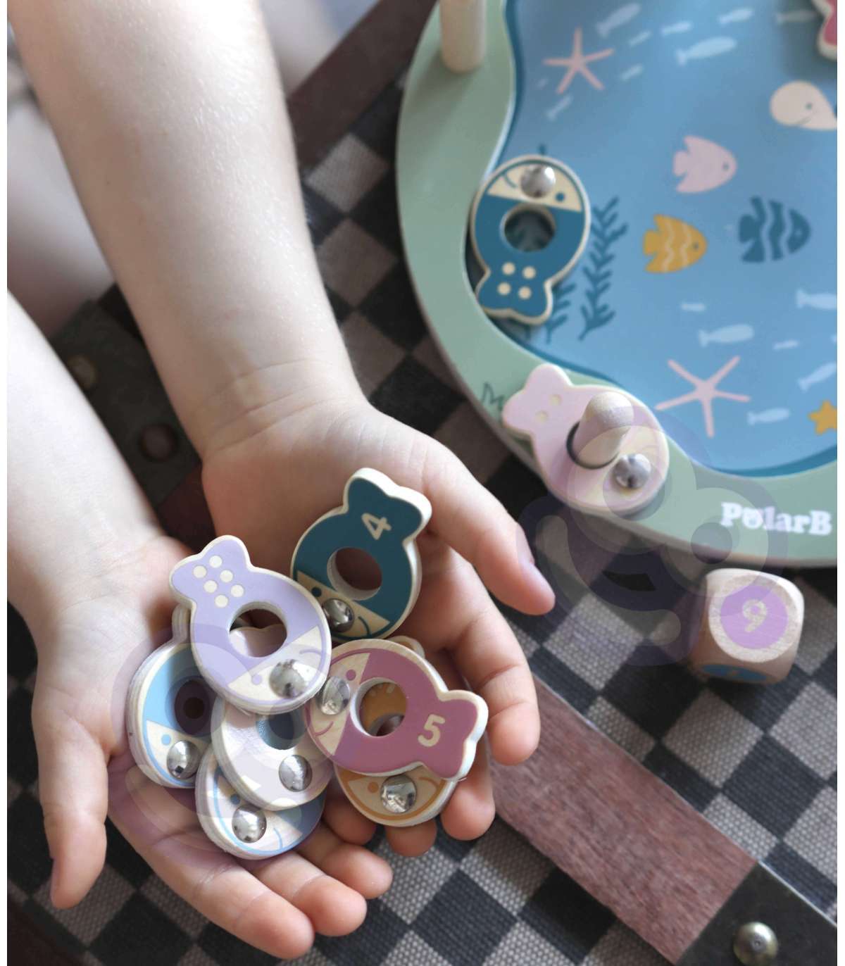 - Värvilised puidust kalad numbrite või punktidega – õpetavad loendamist ja märkide äratundmist