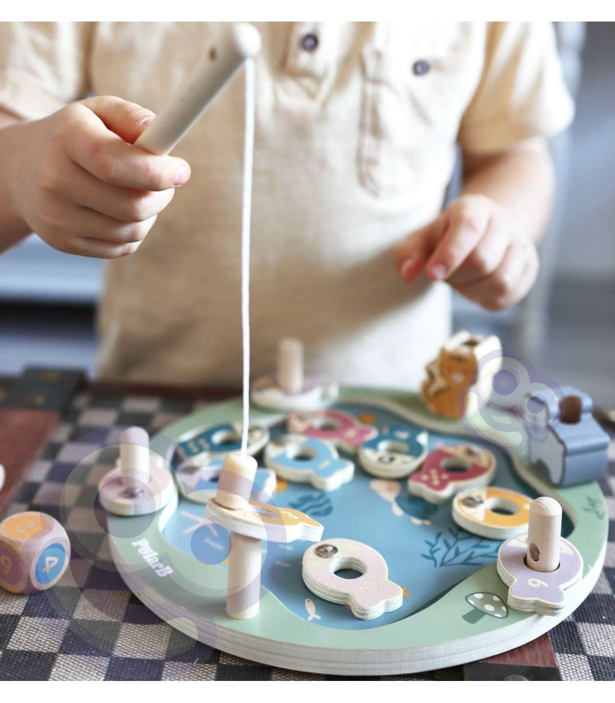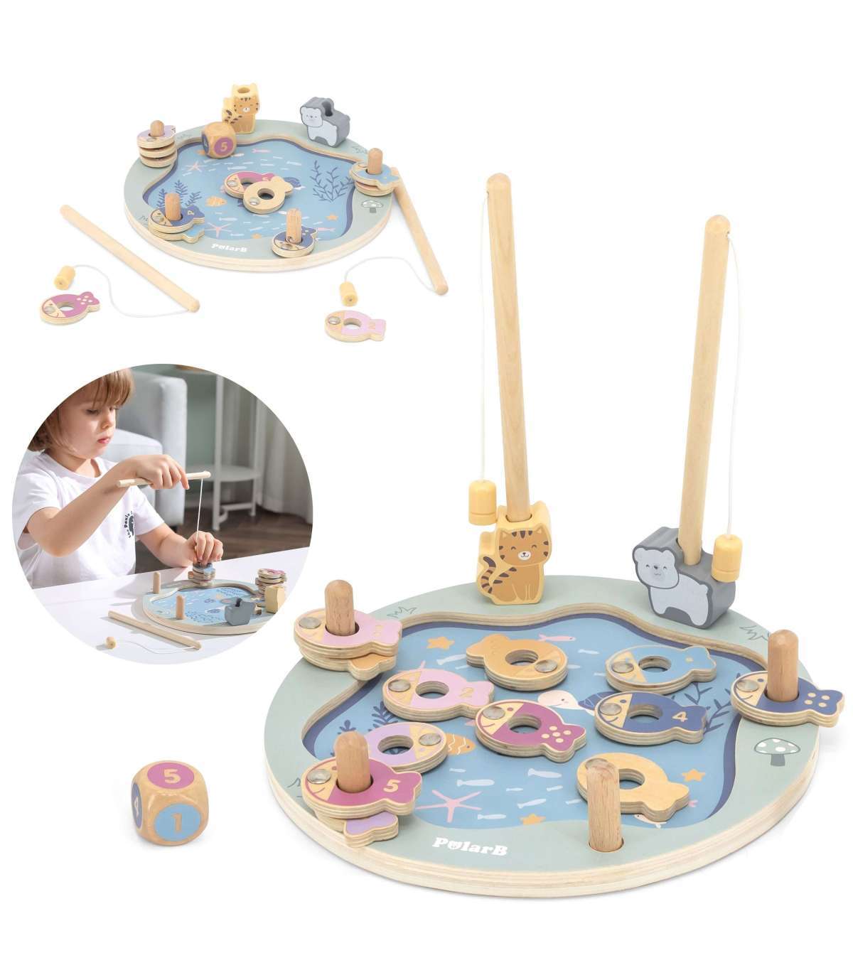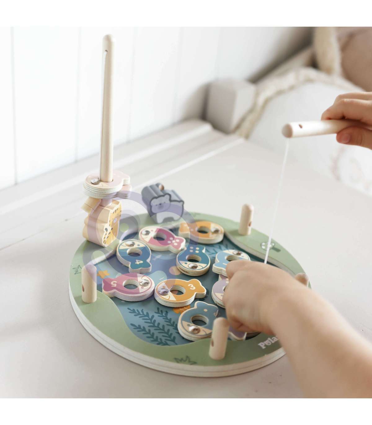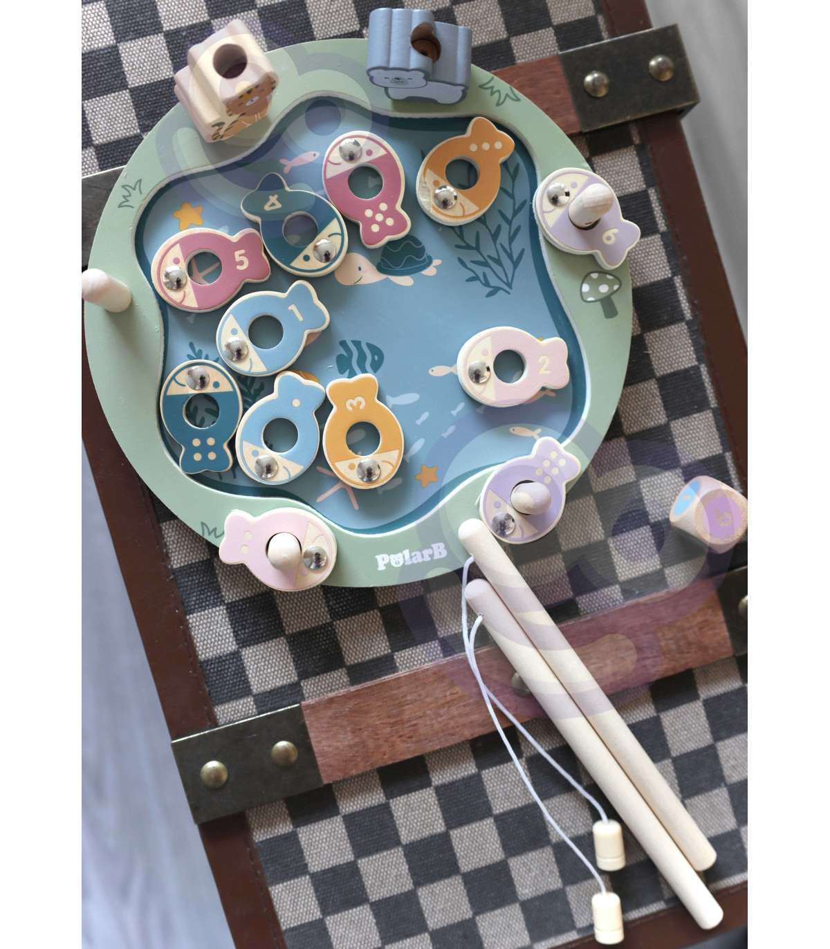 - Värvilised puidust kalad numbrite või punktidega – õpetavad loendamist ja märkide äratundmist