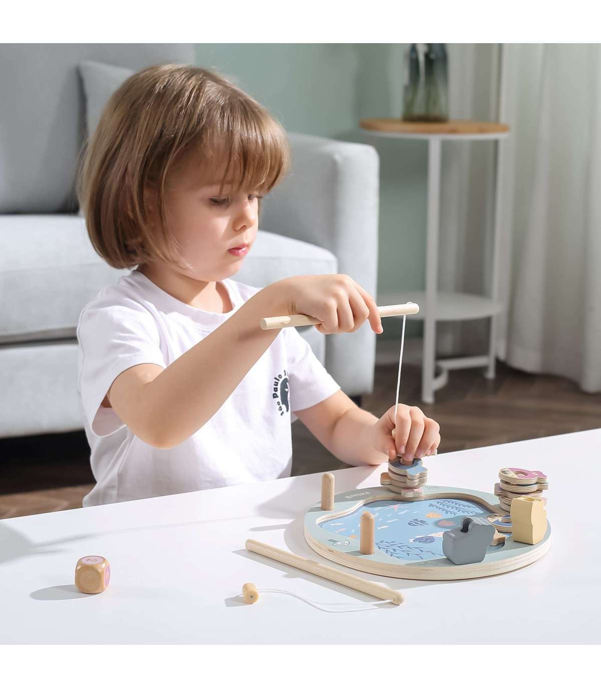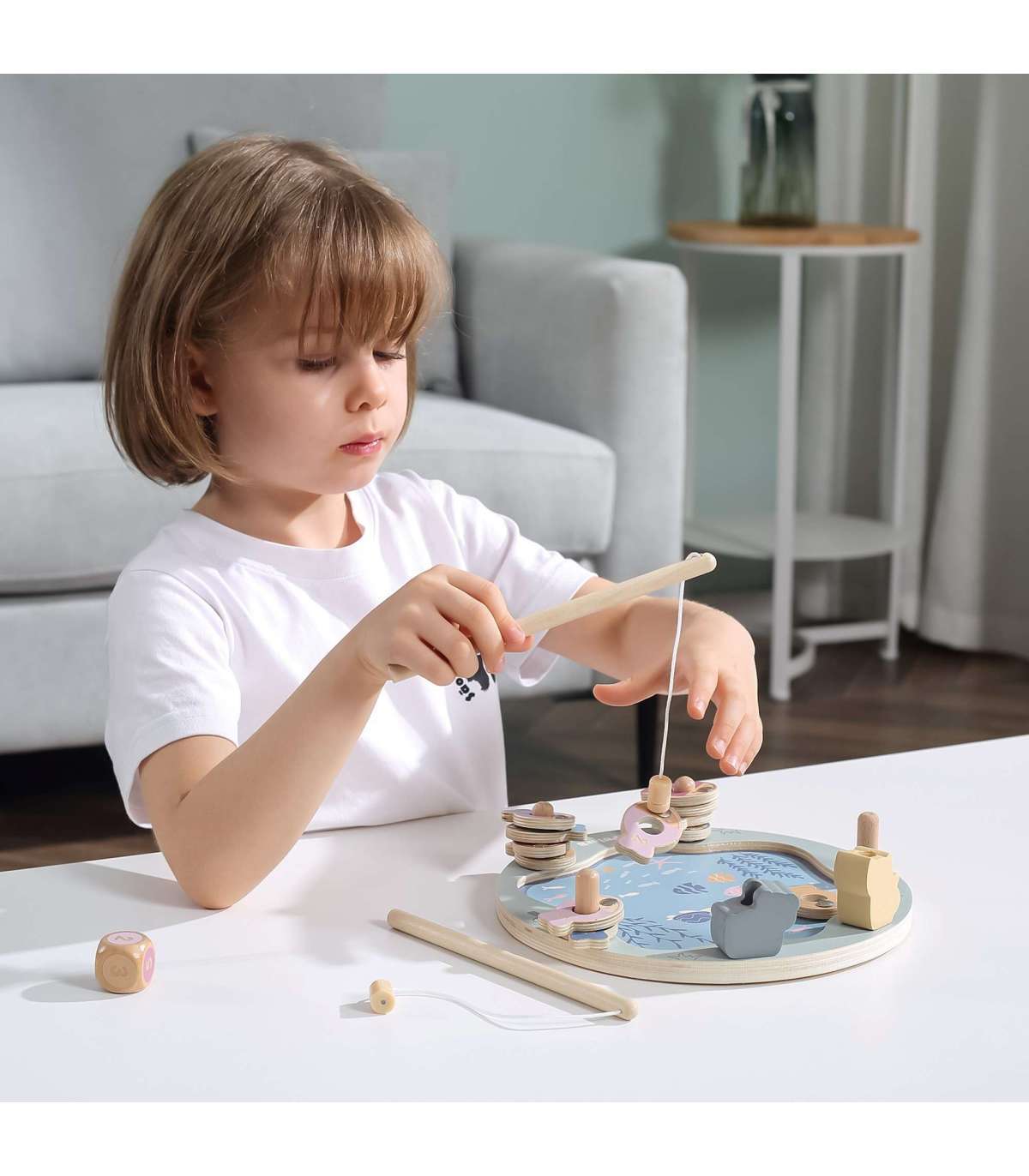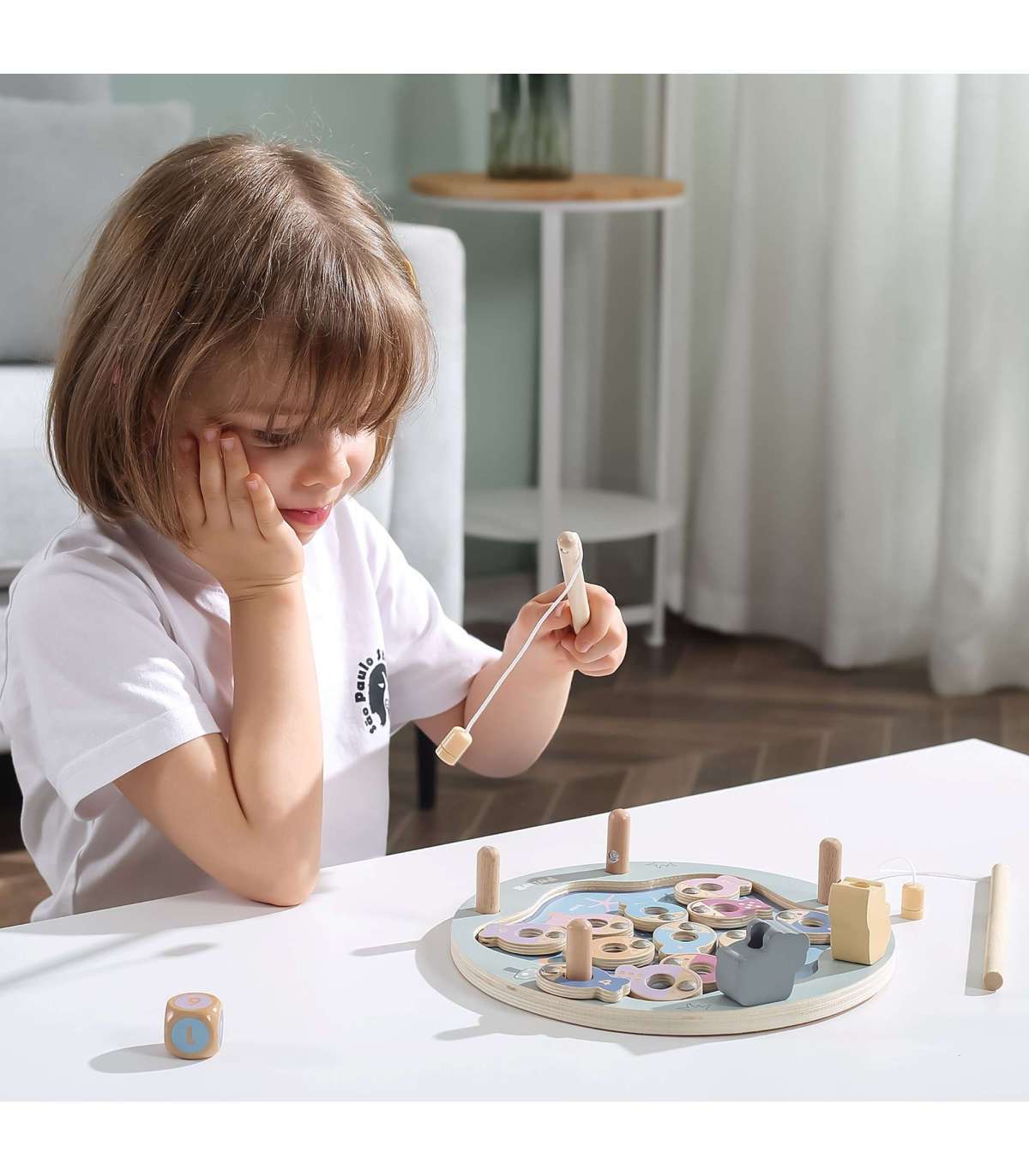 Viige laps värvikasse kalapüügiseiklusesse tänu puidust osavusmängule Kalade püüdmine brändilt Viga. See mänguasi ühendab mängurõõmu käeliste oskuste, täpsuse ja keskendumise arendamisega. Mäng võimaldab lastel harjutada käe-silma koordinatsiooni, püüdes puidust kalu magnetiga õnge abil, mis köidab väikelapsi ja pakub palju tunde lõbu. Komplektis on 12 värvilist kala, millest igal on numbrid või punktikesed, mis võimaldab peale osavusmängu ka loendamise ja märkide äratundmise õppimist. Lisaks sisaldab komplekt puidust kuubik-täringut, mis võimaldab mängu tuua juhuselemente ja liigutuste planeerimist. Sõltuvalt veeretatud väärtusest peab laps selle kala püüma. Plaadil on õngahoidjad, mis võimaldavad lastel õnged voorude vahel alla panna või korraldada oma kalapüügi-jaama. Puidust osad on siledalt viimistletud, ohutud ja kohandatud väikestele kätele, värvitud mittetoksiliste värvidega kaunites pastelltoonides. Õngel olev magnet võimaldab kalu püüda, arendades osavust ja täpsust. Kalapüük on samuti ideaalne rühmamäng – lapsed saavad võistelda, kes püüab kõige rohkem kalu, või luua oma mängustsenaariume, arendades loovust, kujutlusvõimet ja sotsiaalseid oskusi. See on kaasahaarav viis õppimiseks mängu kaudu, mis ühendab lõbu väärtusliku käeliste ja kognitiivsete oskuste arendamisega.