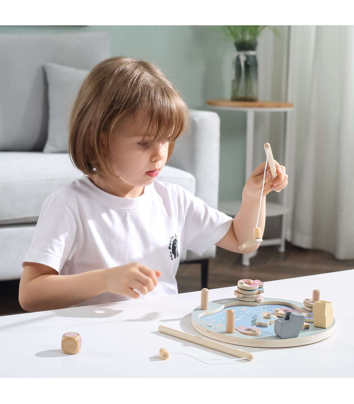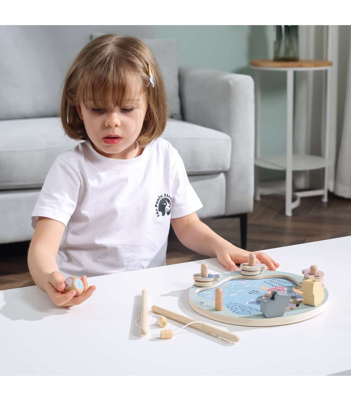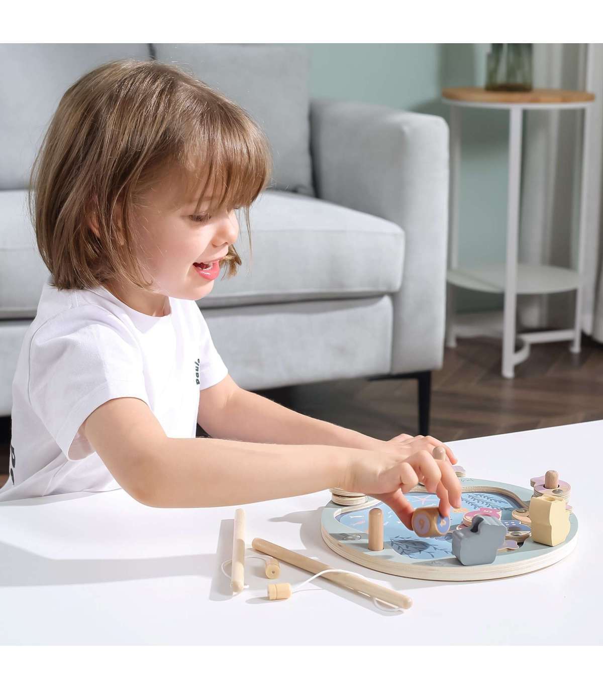 Viige laps värvikasse kalapüügiseiklusesse tänu puidust osavusmängule Kalade püüdmine brändilt Viga. See mänguasi ühendab mängurõõmu käeliste oskuste, täpsuse ja keskendumise arendamisega. Mäng võimaldab lastel harjutada käe-silma koordinatsiooni, püüdes puidust kalu magnetiga õnge abil, mis köidab väikelapsi ja pakub palju tunde lõbu. Komplektis on 12 värvilist kala, millest igal on numbrid või punktikesed, mis võimaldab peale osavusmängu ka loendamise ja märkide äratundmise õppimist. Lisaks sisaldab komplekt puidust kuubik-täringut, mis võimaldab mängu tuua juhuselemente ja liigutuste planeerimist. Sõltuvalt veeretatud väärtusest peab laps selle kala püüma. Plaadil on õngahoidjad, mis võimaldavad lastel õnged voorude vahel alla panna või korraldada oma kalapüügi-jaama. Puidust osad on siledalt viimistletud, ohutud ja kohandatud väikestele kätele, värvitud mittetoksiliste värvidega kaunites pastelltoonides. Õngel olev magnet võimaldab kalu püüda, arendades osavust ja täpsust. Kalapüük on samuti ideaalne rühmamäng – lapsed saavad võistelda, kes püüab kõige rohkem kalu, või luua oma mängustsenaariume, arendades loovust, kujutlusvõimet ja sotsiaalseid oskusi. See on kaasahaarav viis õppimiseks mängu kaudu, mis ühendab lõbu väärtusliku käeliste ja kognitiivsete oskuste arendamisega.