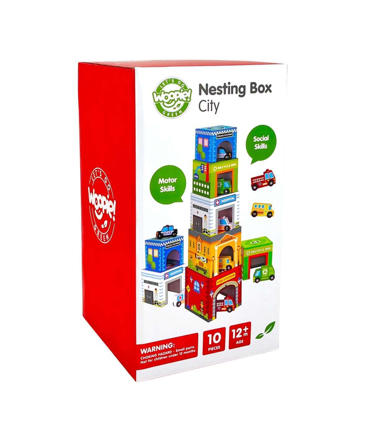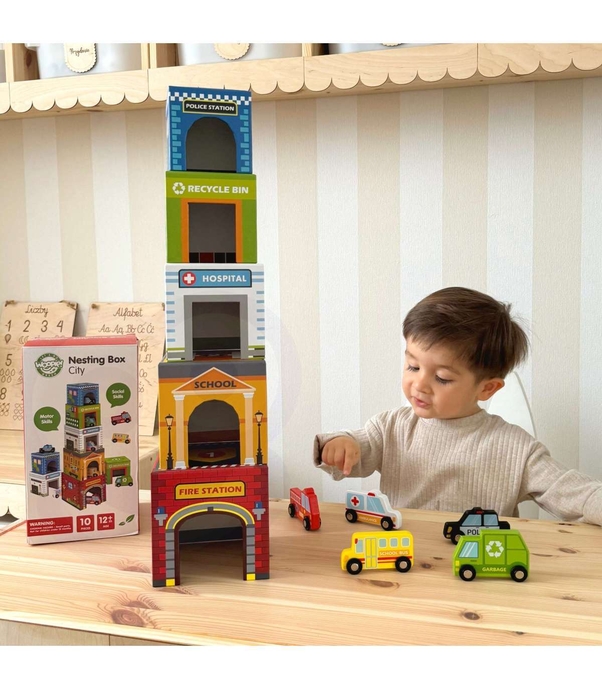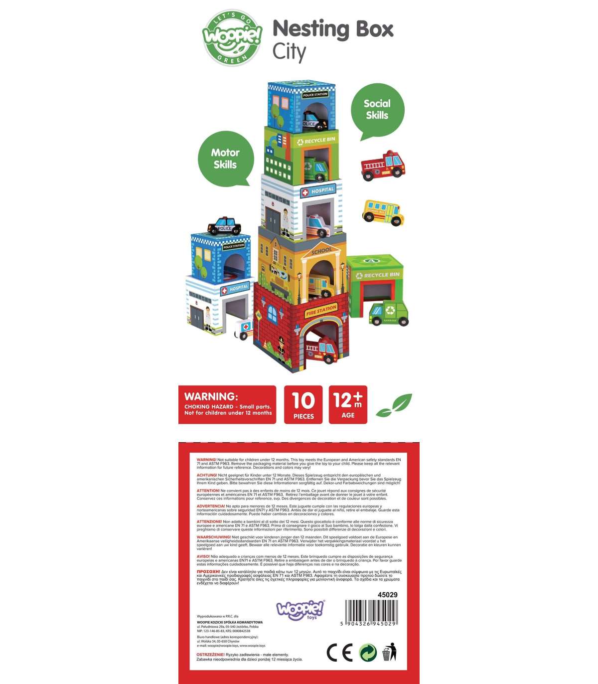 Linnapusle WOOPIE kaubamärgi GREEN seeriast on suurepärane alternatiiv traditsioonilistele klotsidele ja pusledelementidele. Värvikad kuubikud hoonetega ja nummerdusega tutvustavad last numbrite, linnainstitutsioonide ja sõidukite maailmaga, pakkudes mängu, mis samaaegselt õpetab ja arendab. Iga kuup sobib teistega nagu linnapusletükk – nendest saab ehitada torne, sobitada sõidukeid õige hoone juurde ja isegi kasutada neid väikeste esemete hoiustamiseks.