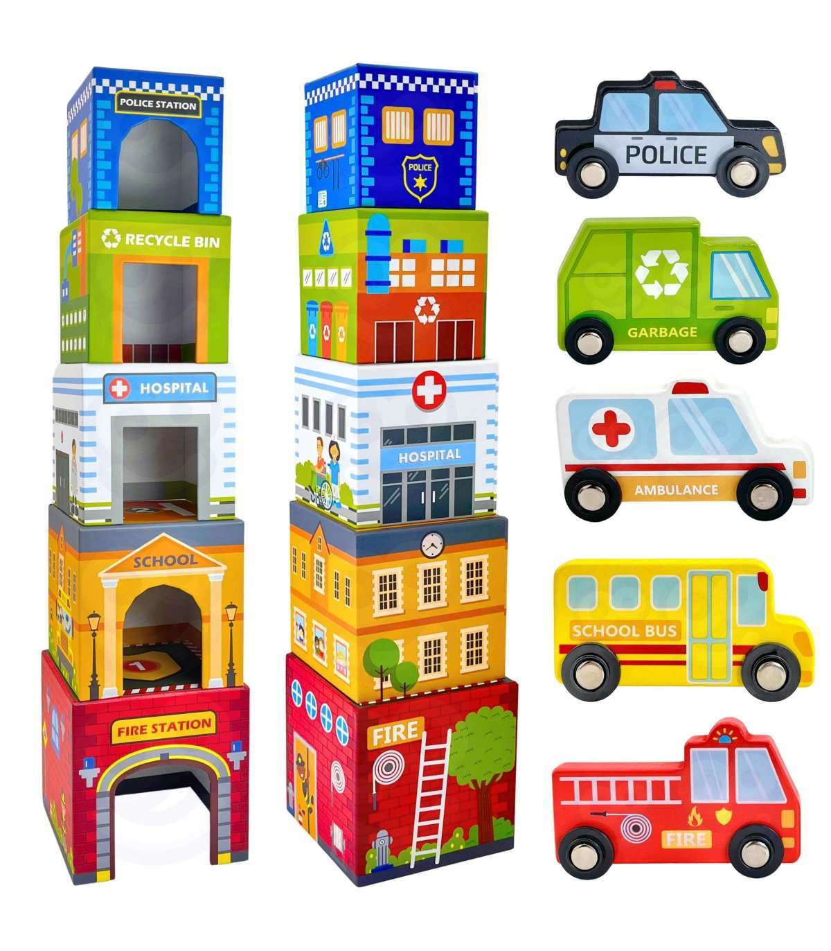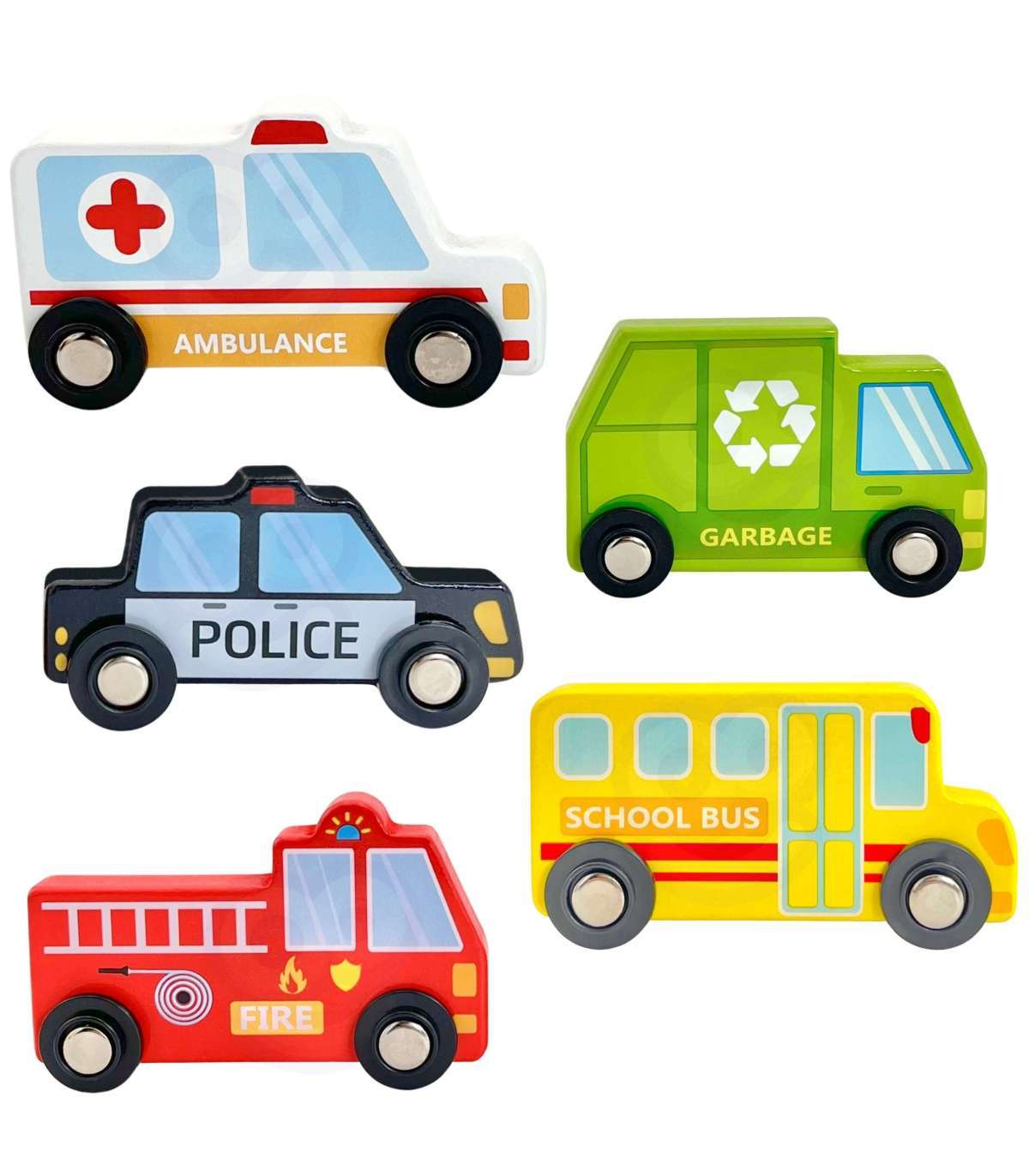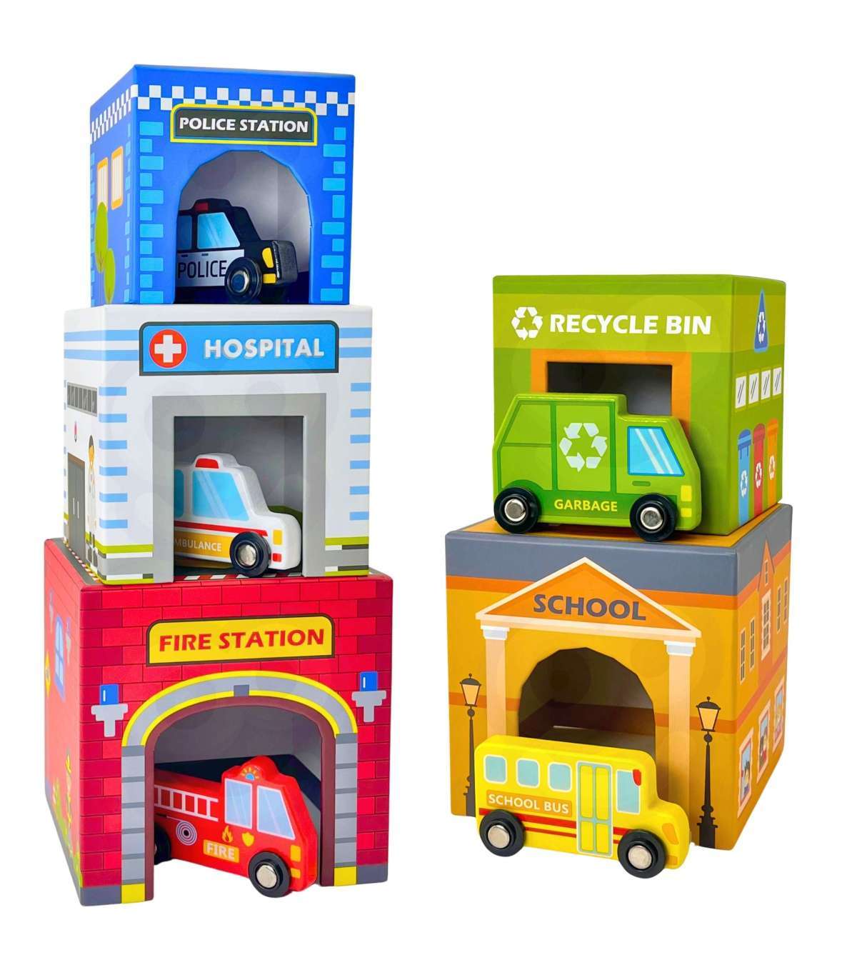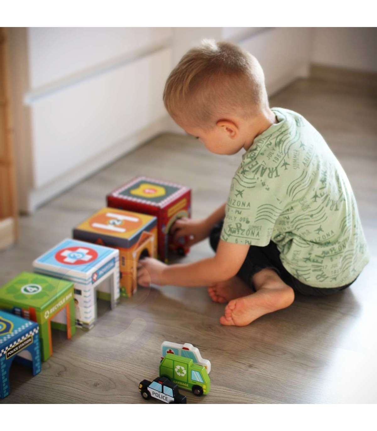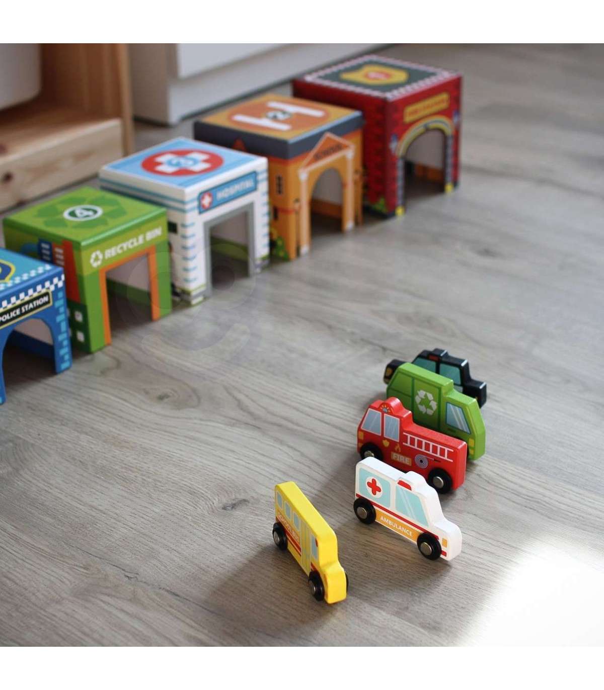 Komplekt sisaldab ka armsaid puidust autosid kummist ratastel, mida lapsed saavad spetsiaalsete avade kaudu hoonetesse viia. See on ideaalne võimalus luua oma lugusid ja mängida igapäevaseid linnalisi stseene!