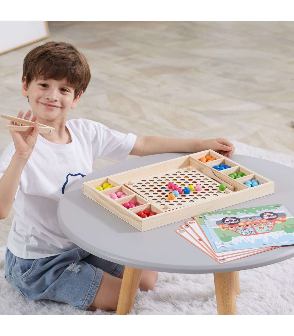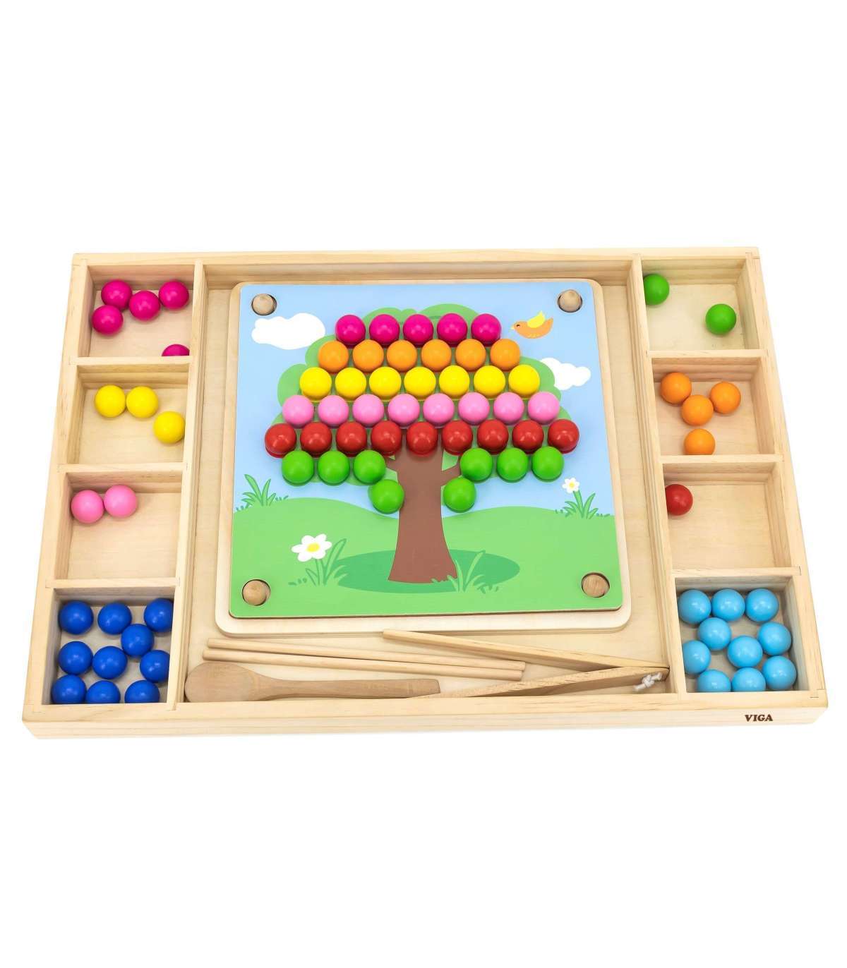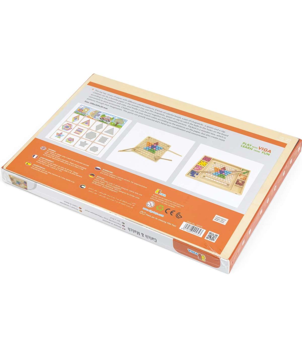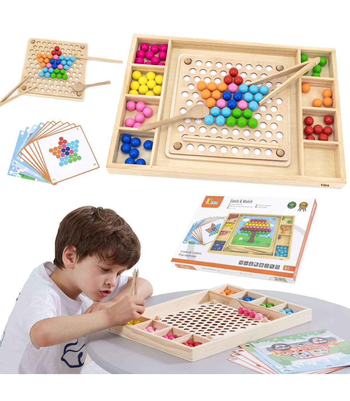Puidust mäng Püüa ja sobita brändilt Viga. Laste ülesanne ei ole ainult värve paberil oleva mustri järgi sobitada, vaid ka luua oma kujutlusvõime abil rohkem mustreid. See mäng võib arendada käe-silma koordinatsiooni ja kontsentratsiooni. Lapsed võivad kinnitada oma lemmikpaberi puidust alusele. Pulkade, lusika või klambri abil kinnitage pallikesed laua aukudesse vastavalt mustritele ja värvidele ning lõpuks paigutage need kauniks pildiks.