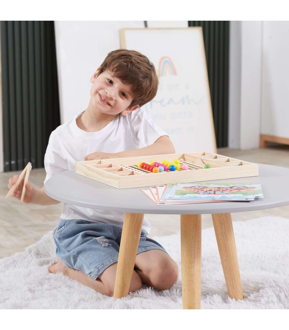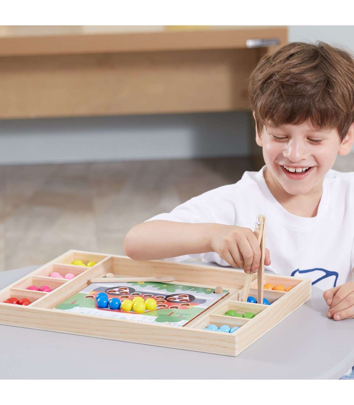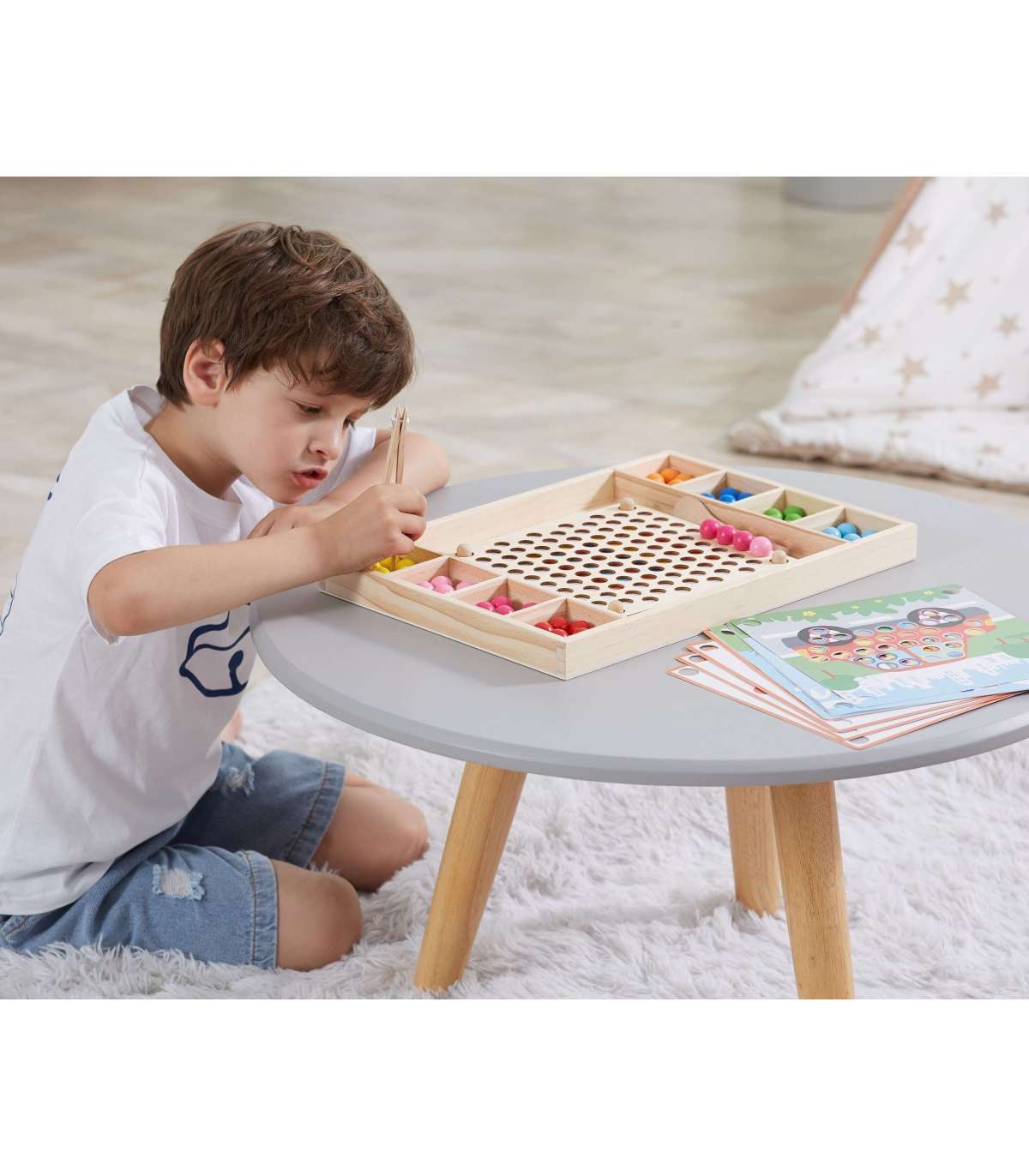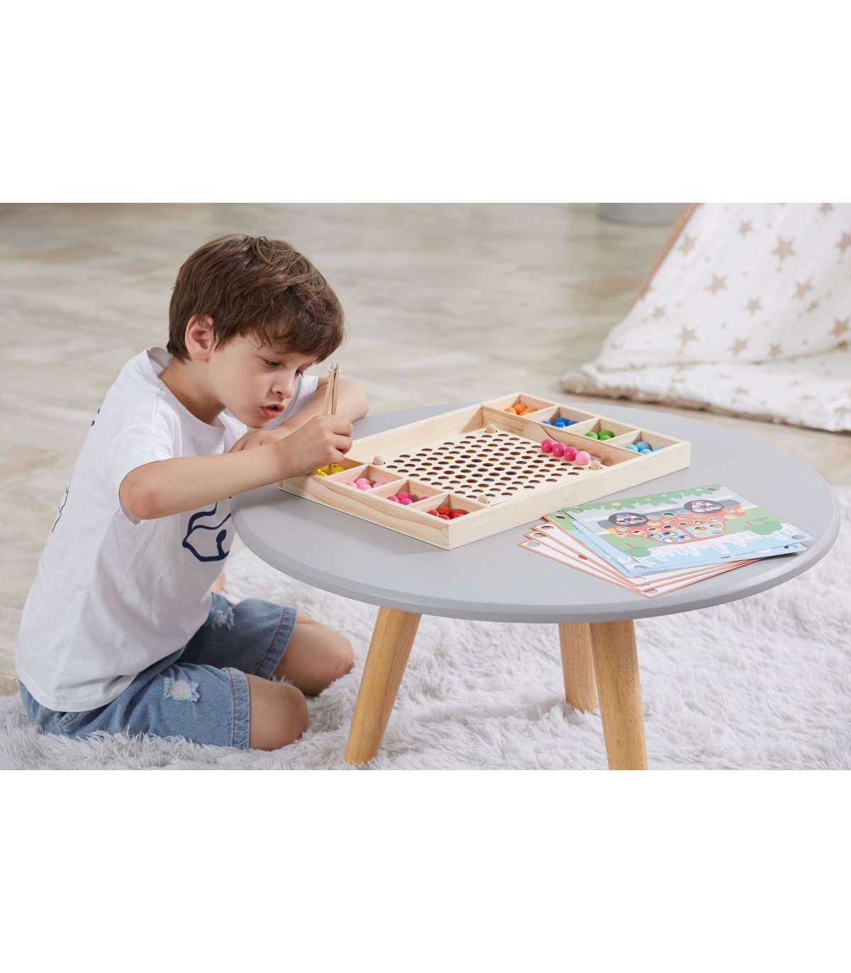 Puidust mäng Püüa ja sobita brändilt Viga. Laste ülesanne ei ole ainult värve paberil oleva mustri järgi sobitada, vaid ka luua oma kujutlusvõime abil rohkem mustreid. See mäng võib arendada käe-silma koordinatsiooni ja kontsentratsiooni. Lapsed võivad kinnitada oma lemmikpaberi puidust alusele. Pulkade, lusika või klambri abil kinnitage pallikesed laua aukudesse vastavalt mustritele ja värvidele ning lõpuks paigutage need kauniks pildiks.