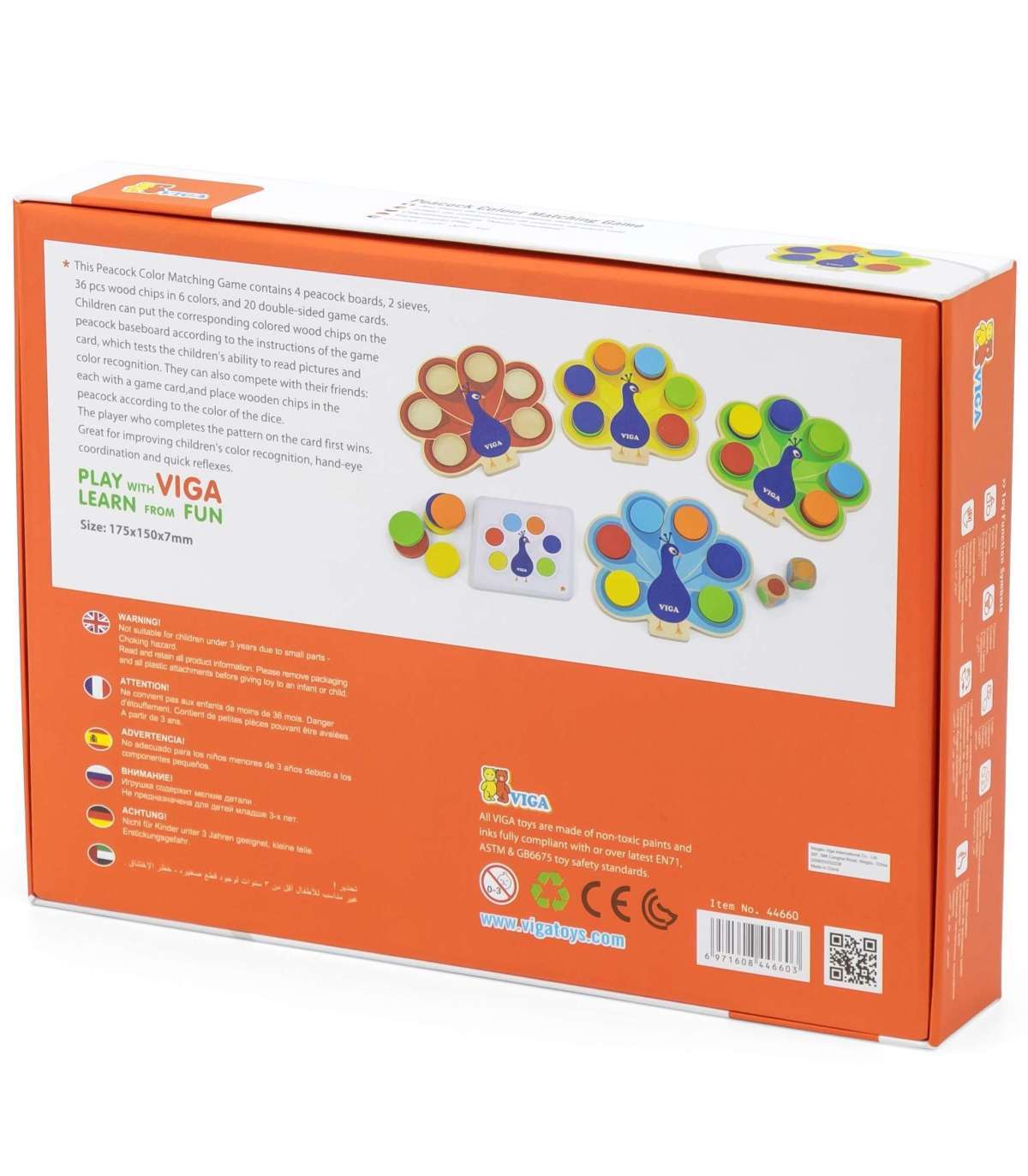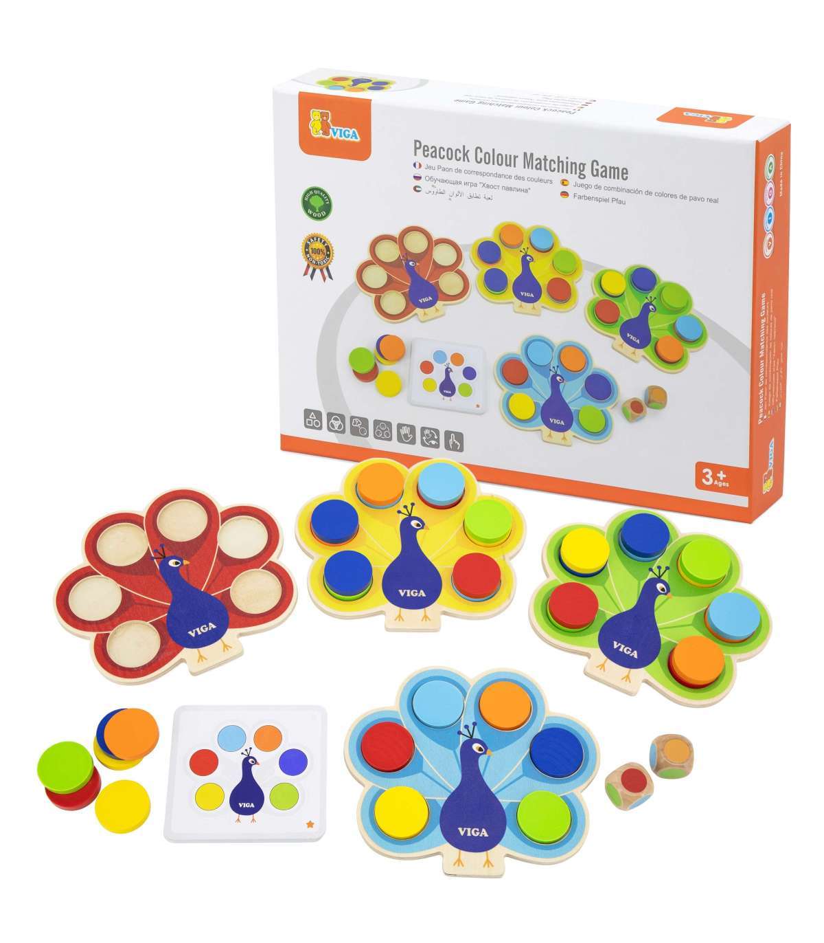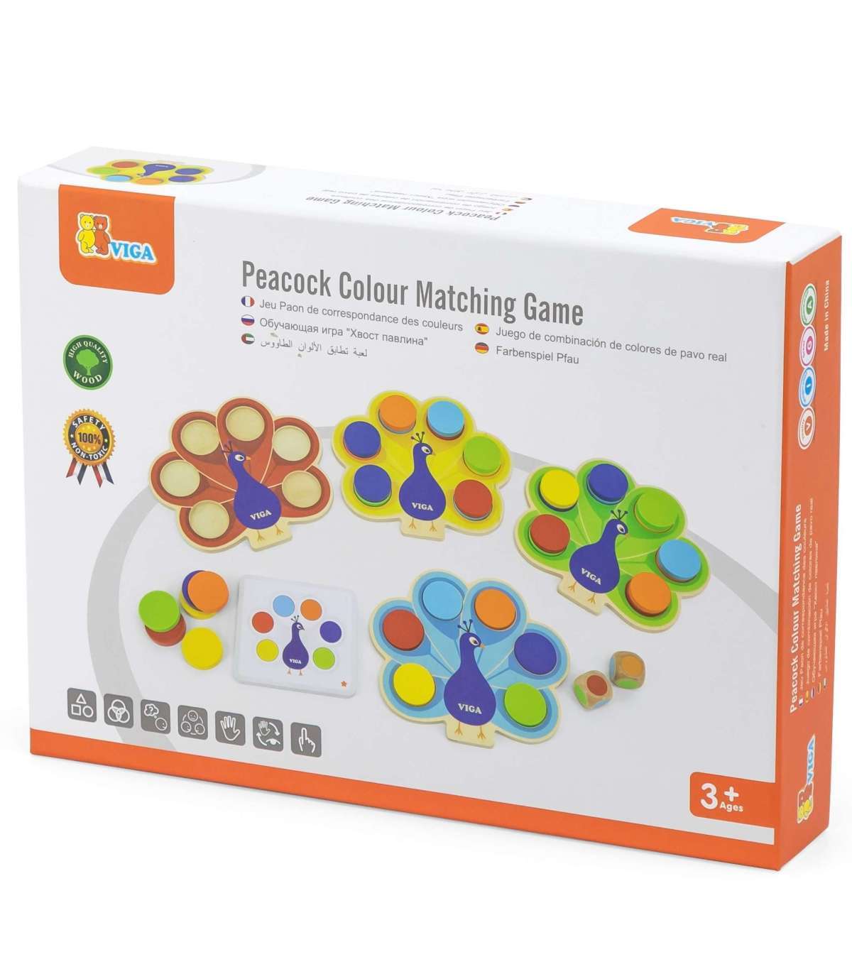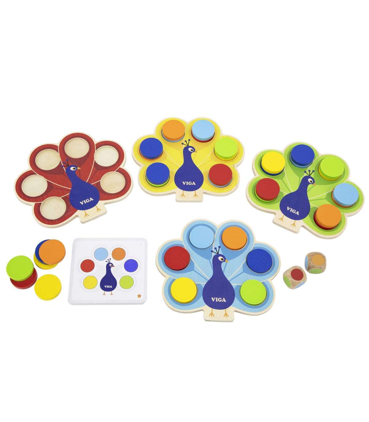 Mänguasi 'Sobita värvid - Paabulinnu saba' kaubamärgilt Viga seisneb kettade asetamises paabulinnu sabasse vastavalt komplektiga kaasas olevate kaartide juhistele või aukude täitmises värviliste klotsidega vastavalt täringul saadud vihjele. See mäng aitab õppida värve, arendab peenmotoorikat ja visuaal-motoorset koordinatsiooni lapsel, ühendades mängu ja õppimist vastavalt Montessori lähenemisele. Ühine mäng arendab kõige paremini sellel eas olulist kujutlusvõimet ning valmistab samal ajal last suurepäraselt ette tulevaks lasteaiaõpinguks.