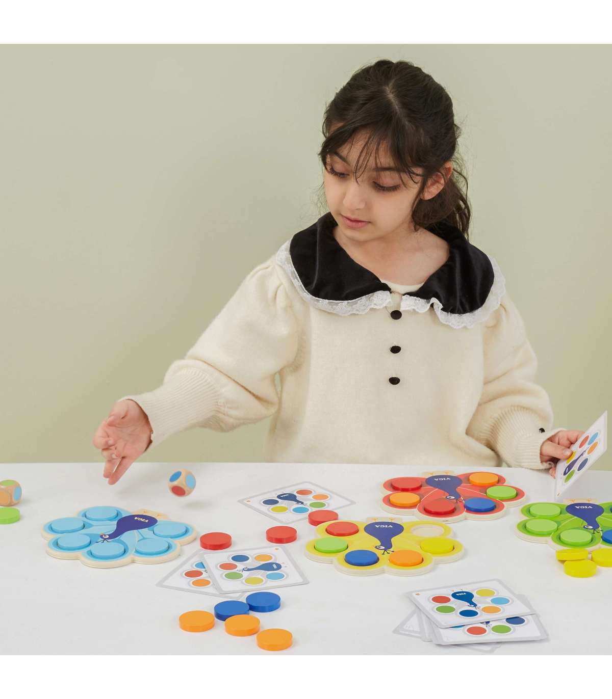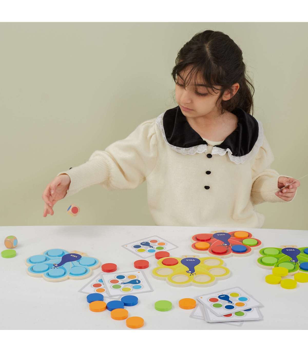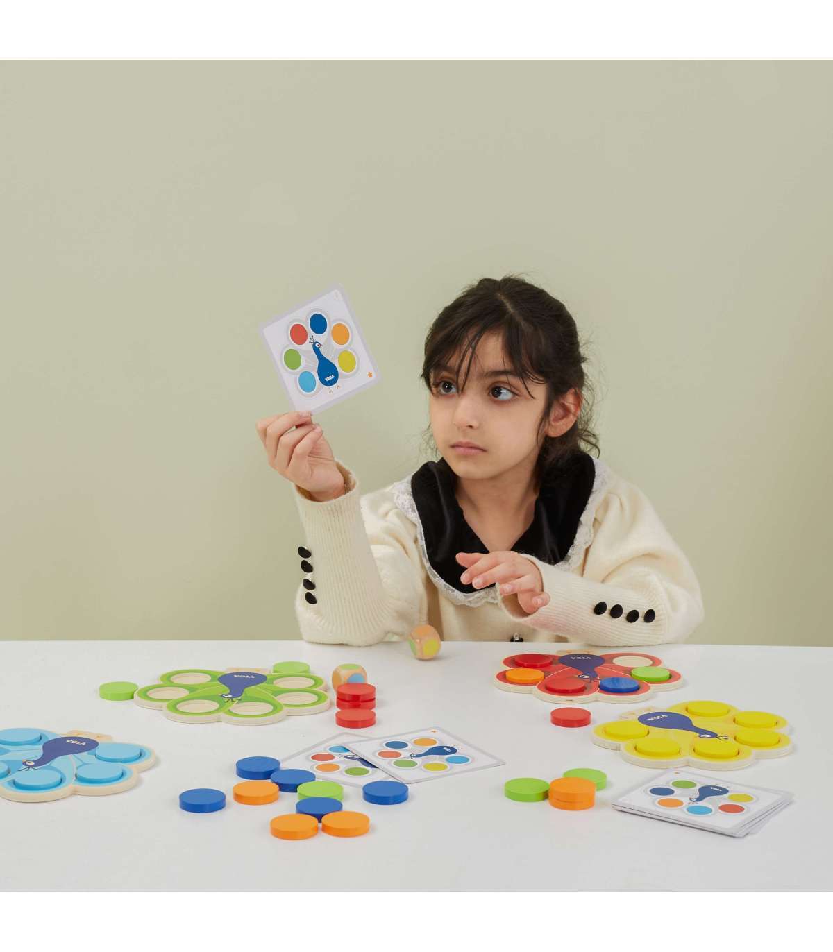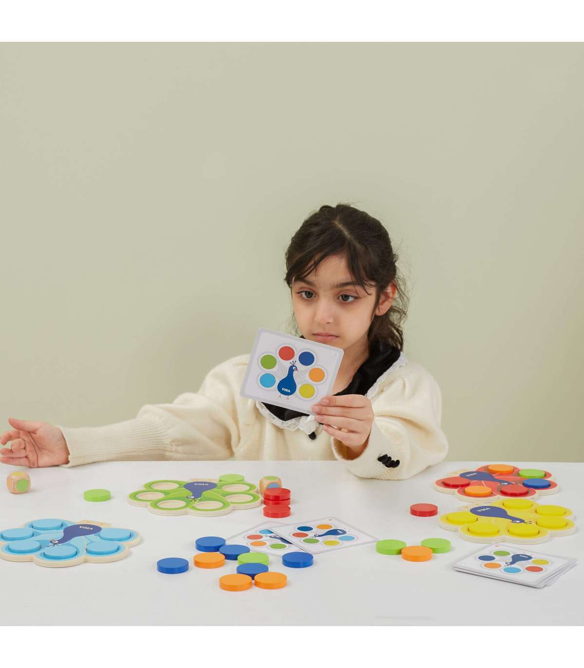 Mänguasi 'Sobita värvid - Paabulinnu saba' kaubamärgilt Viga seisneb kettade asetamises paabulinnu sabasse vastavalt komplektiga kaasas olevate kaartide juhistele või aukude täitmises värviliste klotsidega vastavalt täringul saadud vihjele. See mäng aitab õppida värve, arendab peenmotoorikat ja visuaal-motoorset koordinatsiooni lapsel, ühendades mängu ja õppimist vastavalt Montessori lähenemisele. Ühine mäng arendab kõige paremini sellel eas olulist kujutlusvõimet ning valmistab samal ajal last suurepäraselt ette tulevaks lasteaiaõpinguks.