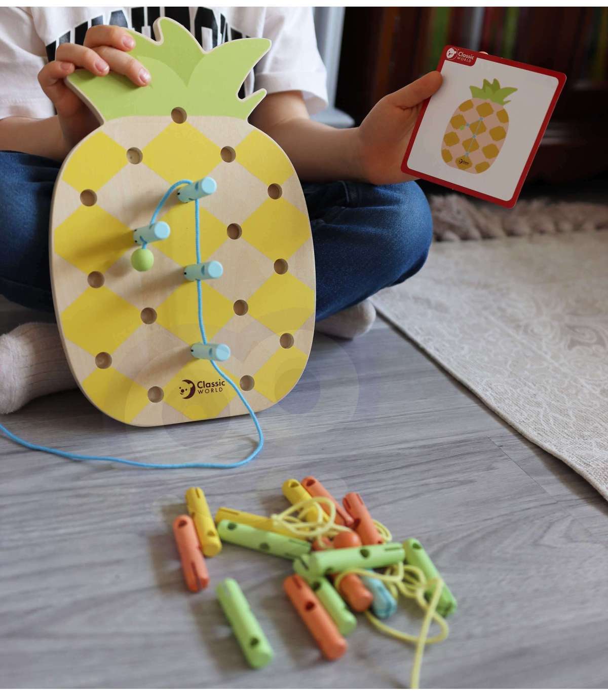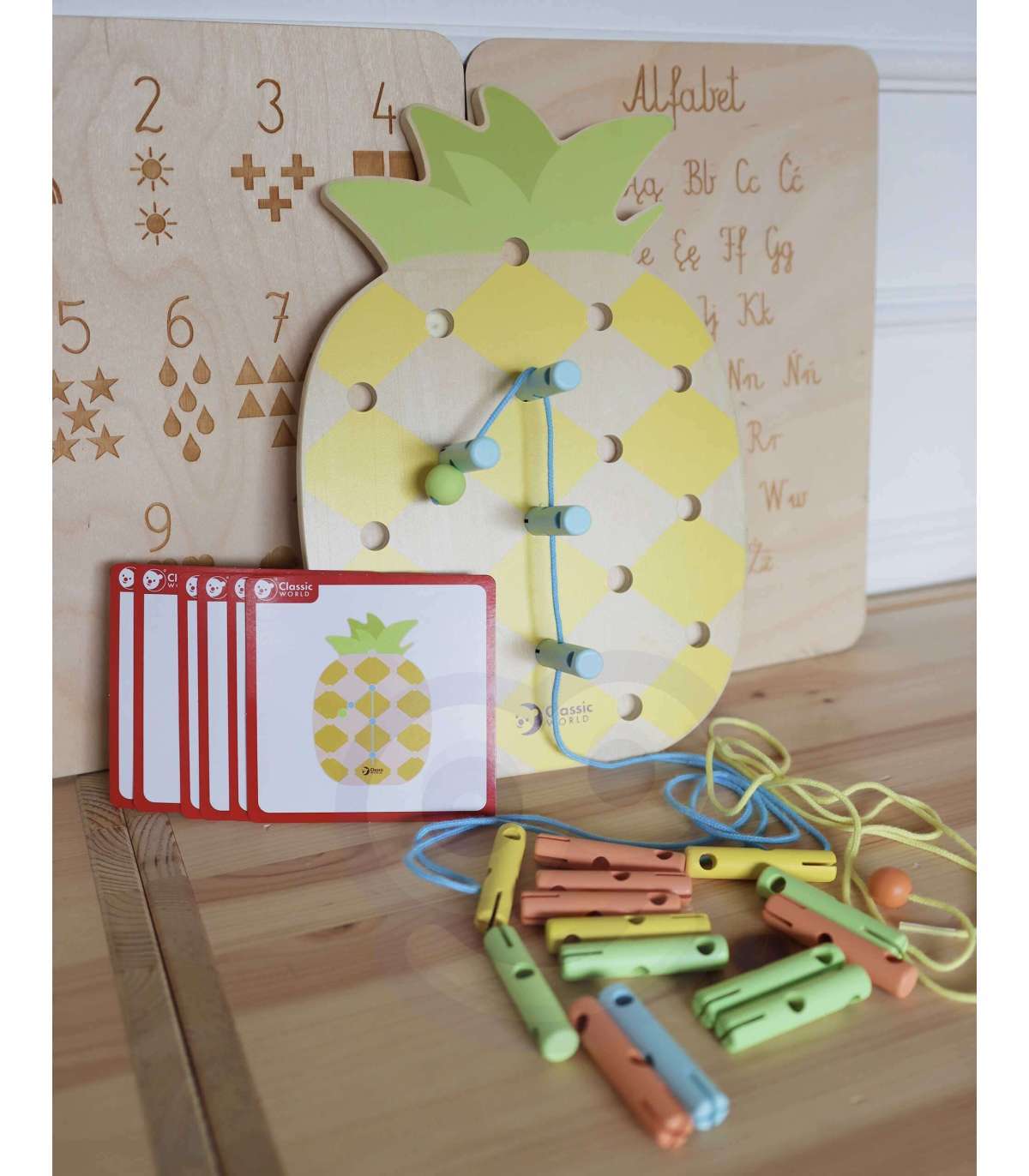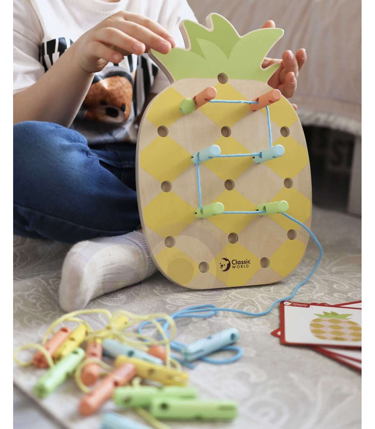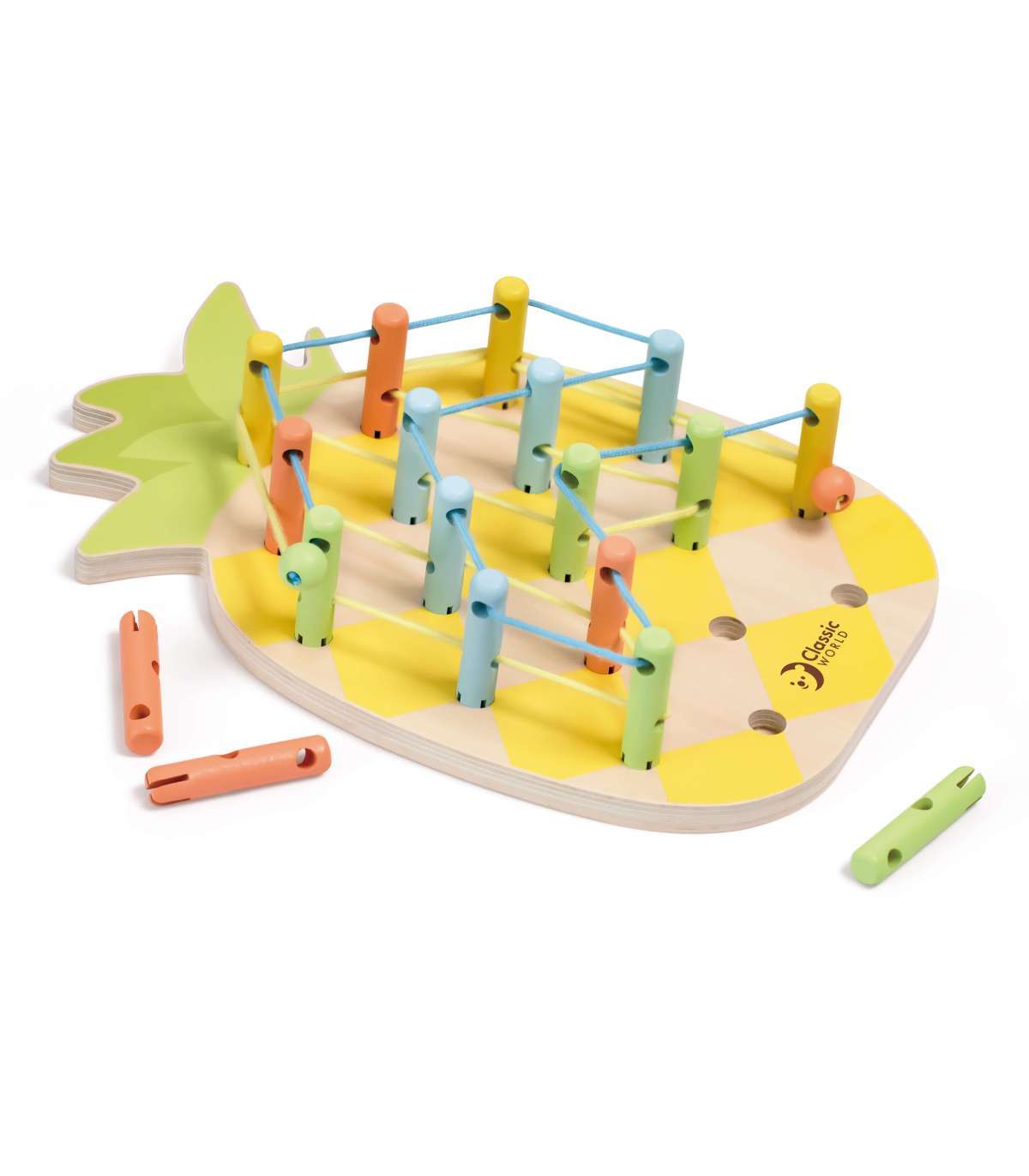 Puidust nöörimismäng – ananassi tihvtid brändilt Classic World on klassikaline mitmevärviliste tihvtide komplekt aukudega, mille kaudu laps saab paela läbi tõmmata. Tihvte saab paigutada suvaliste mustritena, mis avaldavad positiivset mõju lapse loomingulisusele ja ergutavad tema kujutlusvõimet. Mänguasi pakub lapsele palju mängutunde ja arendab samal ajal tema tähelepanu ja kontsentreerumisvõimet. Iga ese on valmistatud kvaliteetsest puust ja värvitud mittemürkiva värviga, mistõttu on toode lapsele täiesti ohutu.