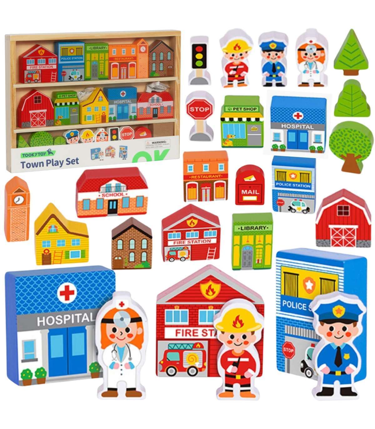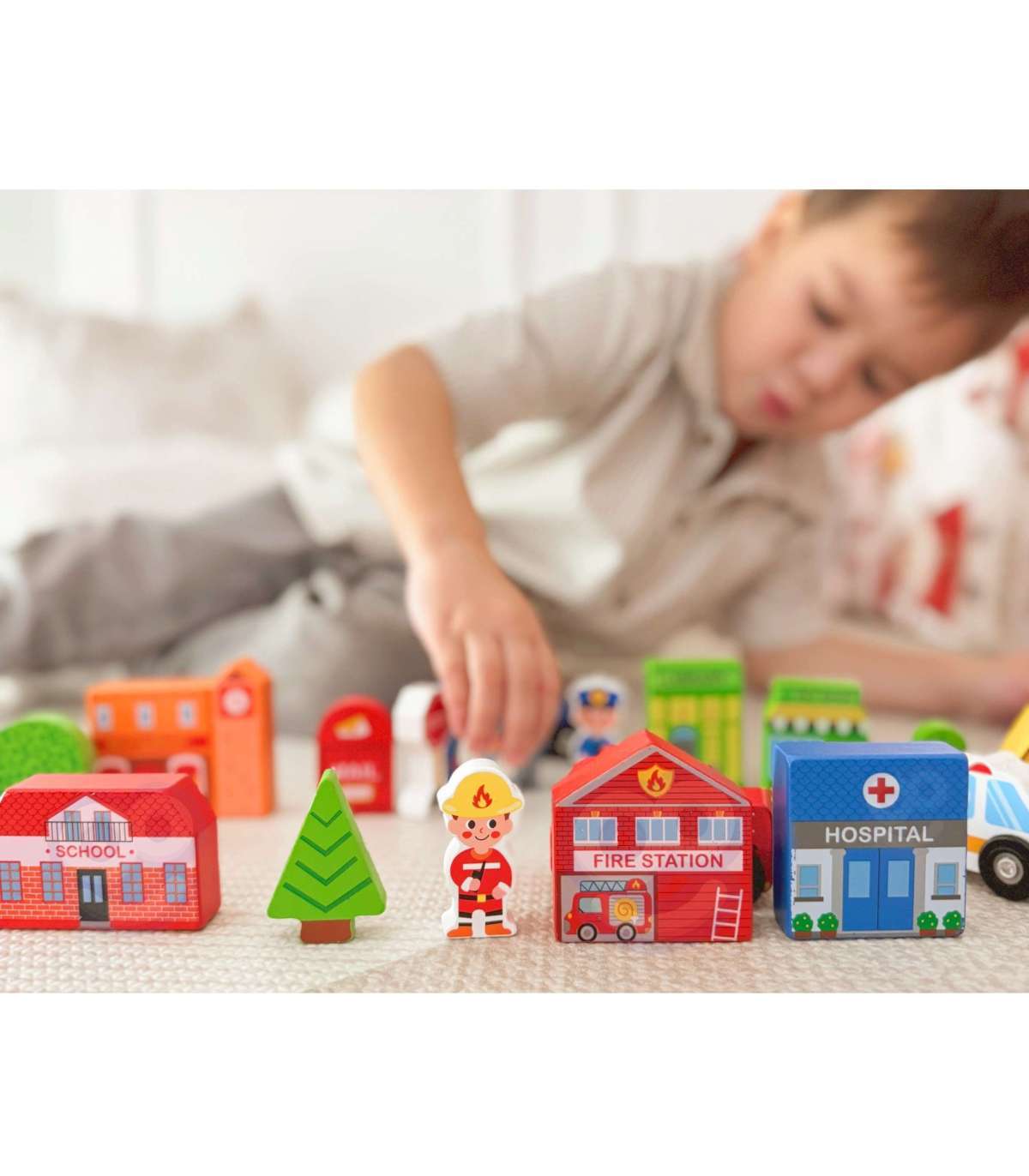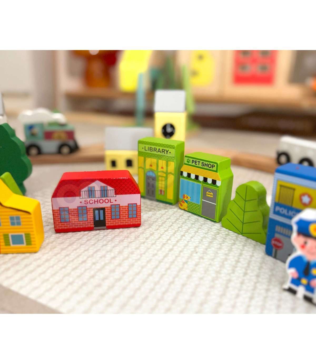 Ehitus- ja figuurikomplekt brändilt TOOKY TOY võimaldab ehitada oma väikelinna ja hakata figuuridega erinevaid stseene lavastama, mis seal võiksid toimuda. Komplekt võimaldab iseseisvat mängu, kuid sobib suurepäraselt ka teiste komplektide täienduseks. Komplekt sisaldab puidust karpi jaotistega, 11 hoonet, 3 tegelase figuuri (sealhulgas tuletõrjuja, politseinik ja arst) ning 6 muud objekti: stopimärk, liiklusfoorid, kaks puud, põõsas ja postkast. Rollimängu kaudu laps arendab oma loovust, kujutlusvõimet ja sotsiaalseid oskusi. Kogu komplekt on valmistatud kõrgeima kvaliteediga materjalidest ning värvitud mittetoksiliste värvidega, mis on ohutud lastele ja keskkonnale.
