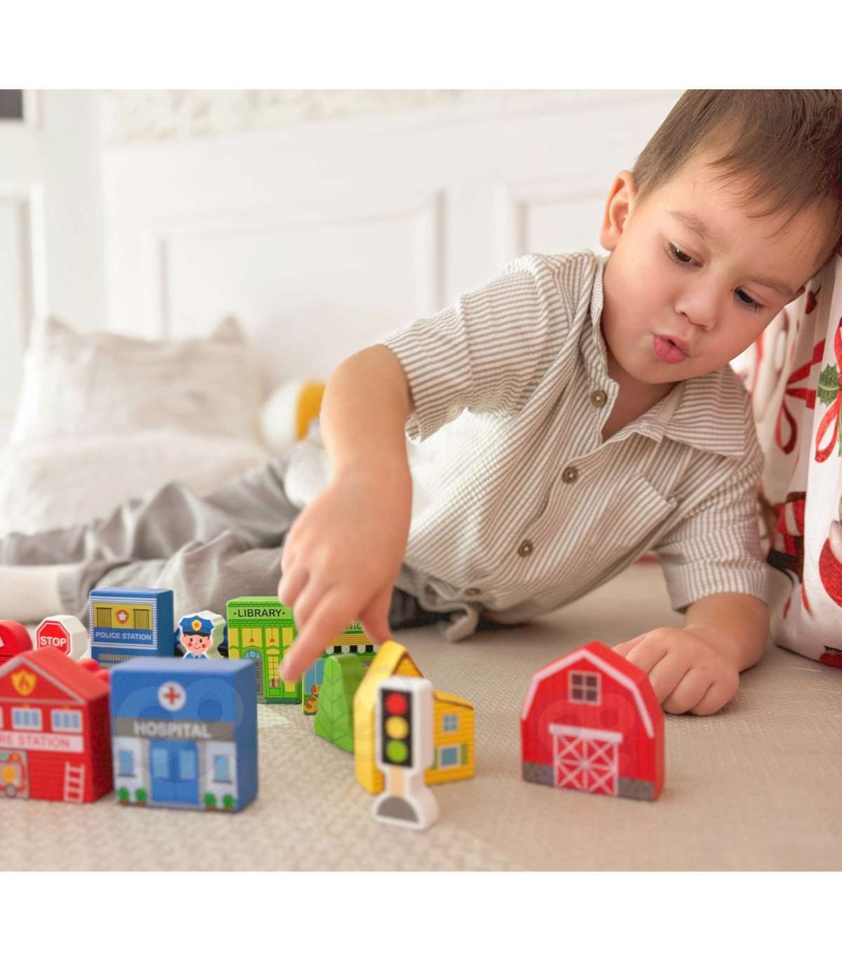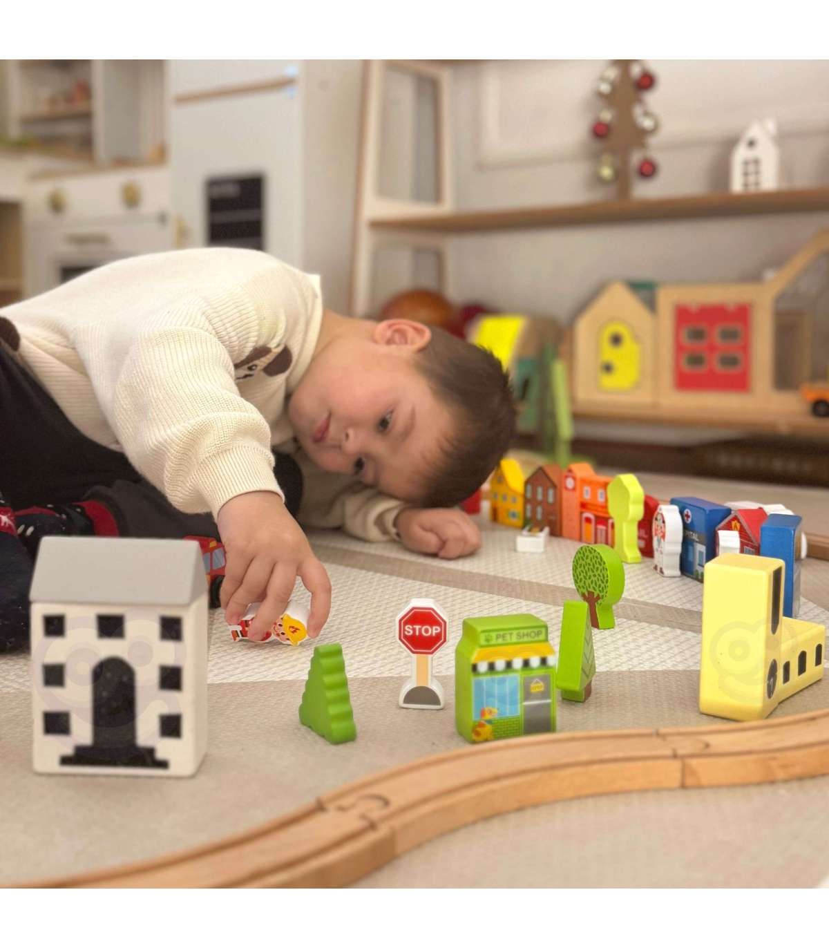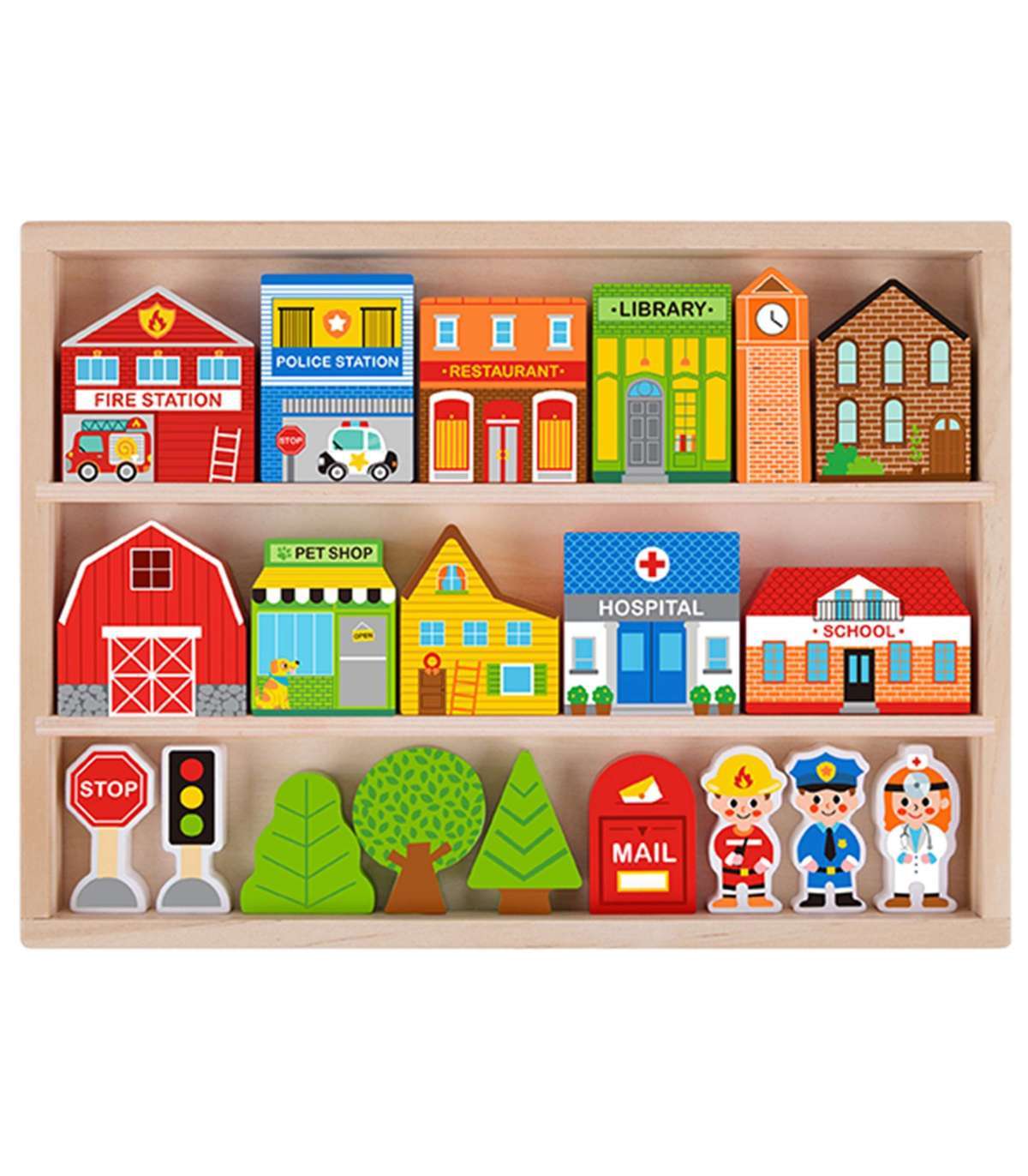 Ehitus- ja figuurikomplekt brändilt TOOKY TOY võimaldab ehitada oma väikelinna ja hakata figuuridega erinevaid stseene lavastama, mis seal võiksid toimuda. Komplekt võimaldab iseseisvat mängu, kuid sobib suurepäraselt ka teiste komplektide täienduseks. Komplekt sisaldab puidust karpi jaotistega, 11 hoonet, 3 tegelase figuuri (sealhulgas tuletõrjuja, politseinik ja arst) ning 6 muud objekti: stopimärk, liiklusfoorid, kaks puud, põõsas ja postkast. Rollimängu kaudu laps arendab oma loovust, kujutlusvõimet ja sotsiaalseid oskusi. Kogu komplekt on valmistatud kõrgeima kvaliteediga materjalidest ning värvitud mittetoksiliste värvidega, mis on ohutud lastele ja keskkonnale.