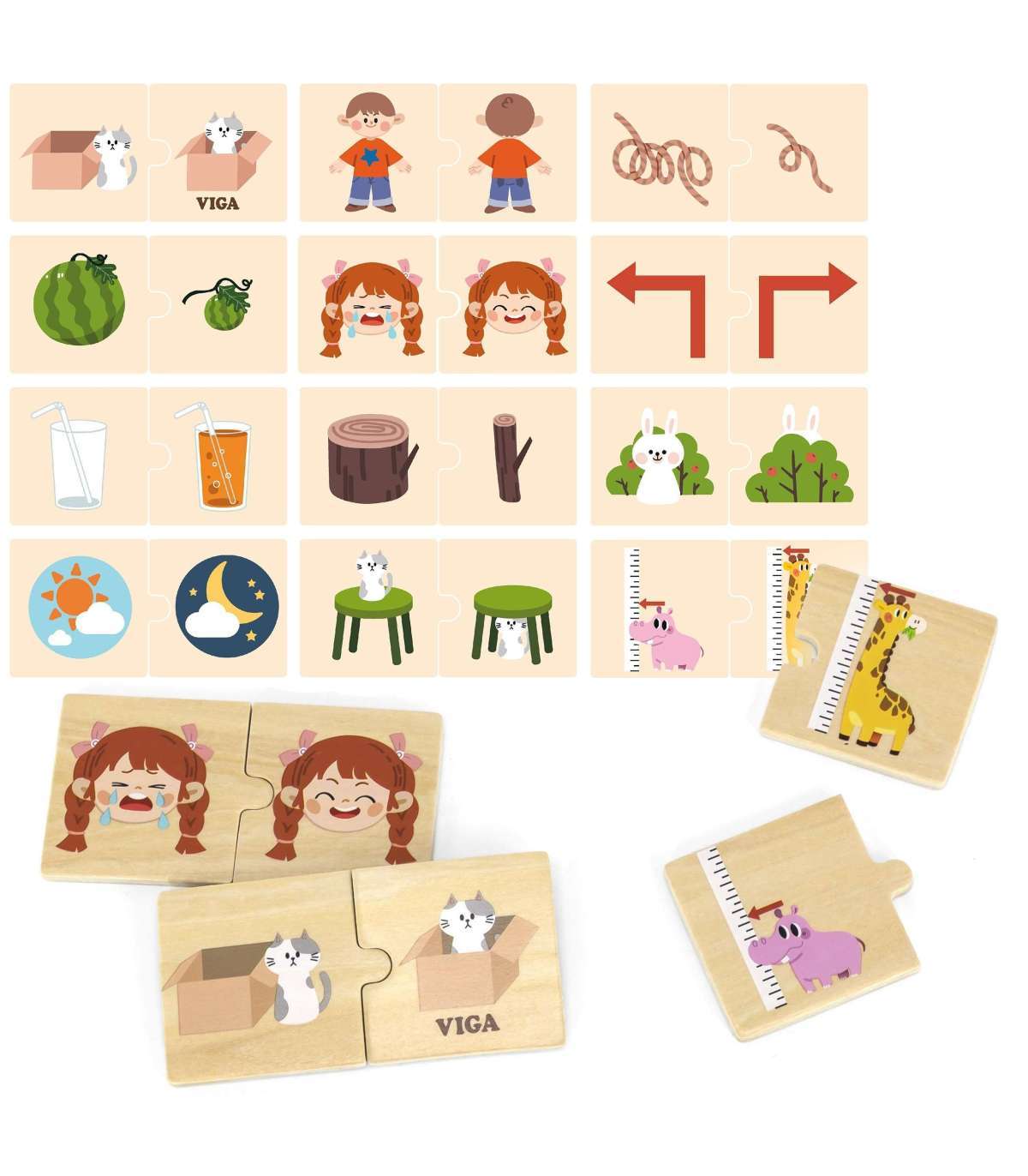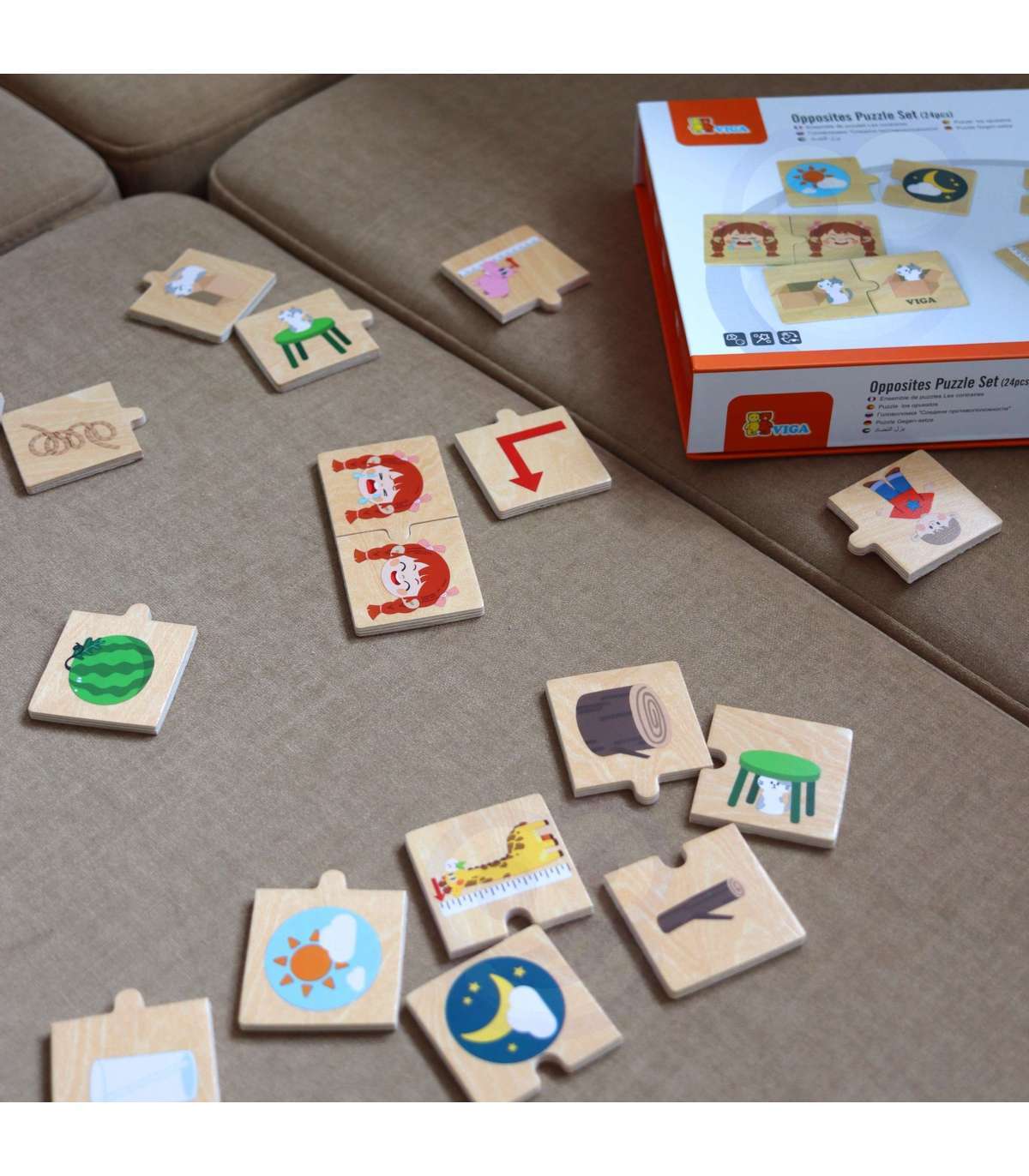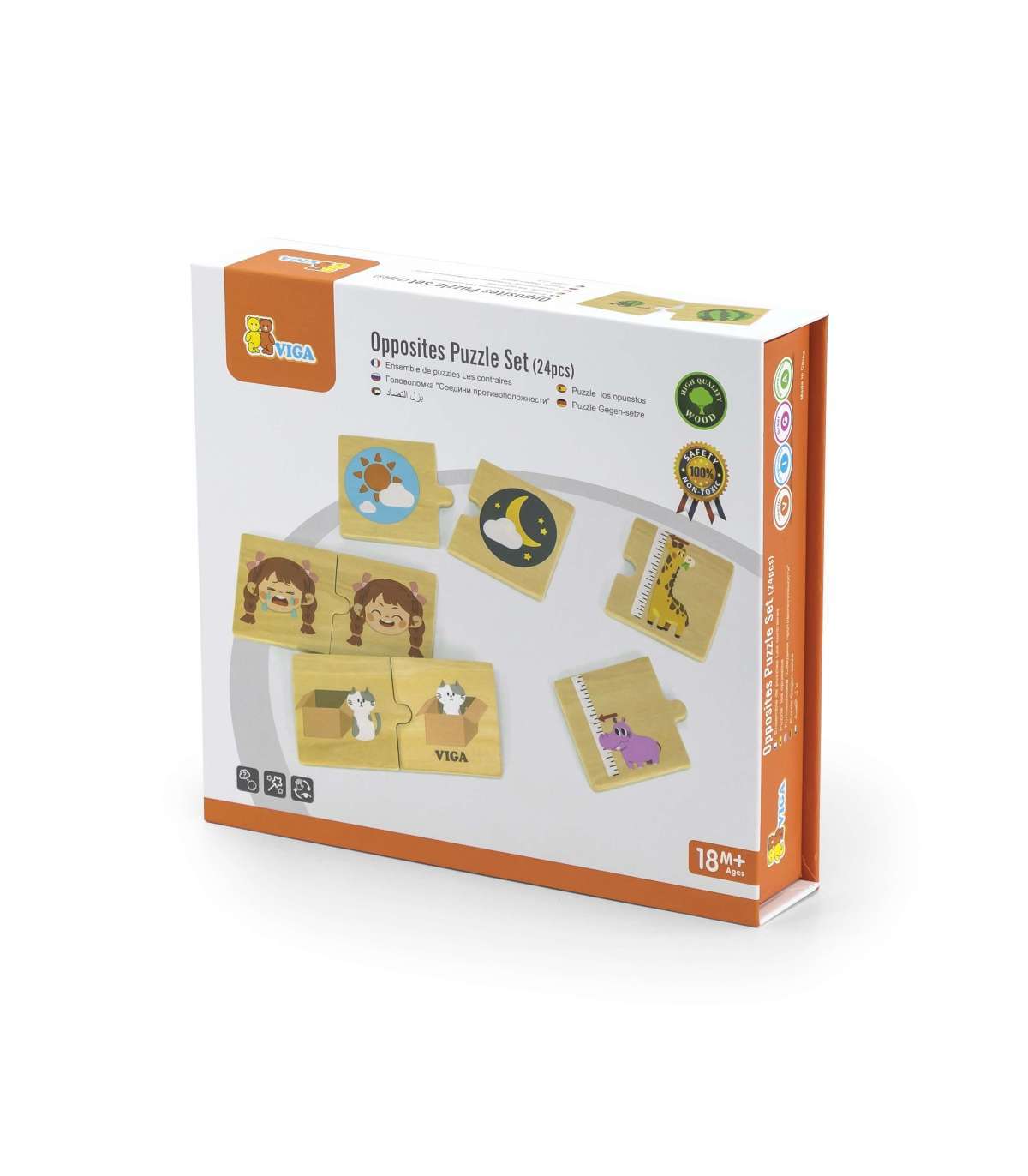 Puidust vastandite sobitamise pusle kaubamärgilt VIGA sisaldab 24 värvilist pusletükki, mida saab sobitada, moodustades vastandpaare. Mängimise kaudu arendavad väikesed lapsed oma sõnavara, tähelepanu, motoorseid oskusi ja loogilist mõtlemist, sobitades ja avastades seoseid.