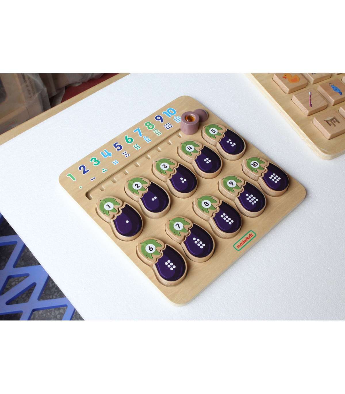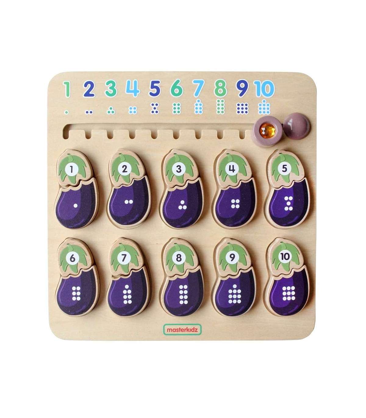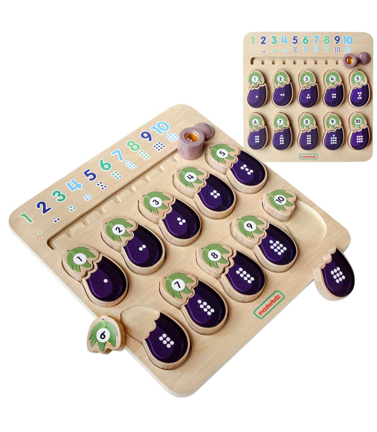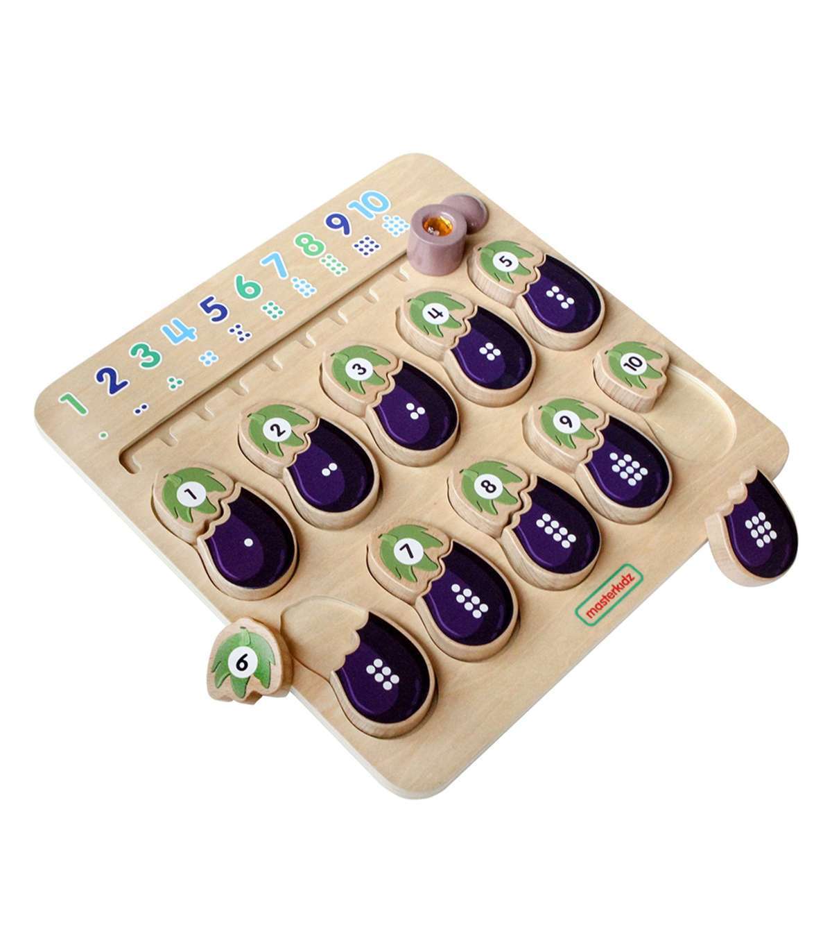 Puidust tahvel numbrite ja värvide õppimiseks brändilt MASTERKIDZ. Tahvel on loodud, et aidata lastel arendada oma meeli. Lapsed peavad sobitama vastavad baklažaani osad. Üks osa näitab numbrit ja teine vastavat arvu täppe. Ülal on liugrik koos sobitatud numbrite ja täppidega õiges järjekorras. Mäng arendab ka suurepäraselt lapse manuaalseid oskusi, s.t. peenmotoorikat.