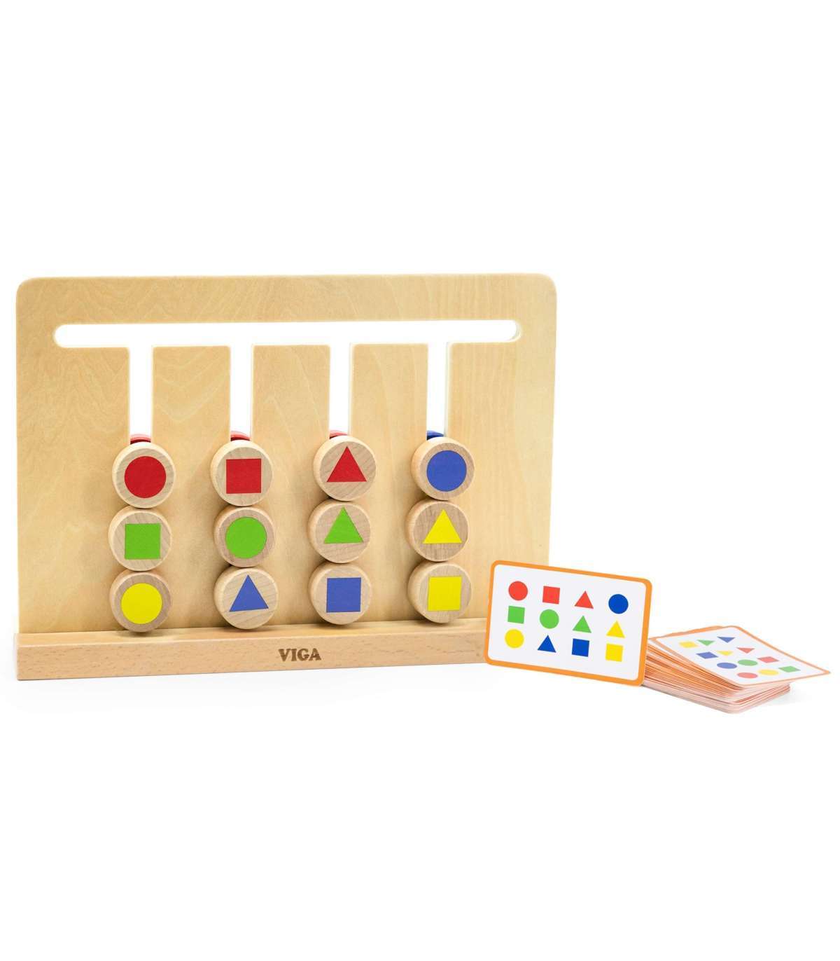 Loogikamäng „Värvide ja kujundite sobitamine” marki Viga pakub tunde mängurõõmu! Seisev mänguraam sisaldab 12 kahepoolset klotsi. Kui laps on juba valdanud lihtsama poole värviliste klotsidega, saab ta tõsta raskusastet, mängides teisel poolel värviliste geomeetriliste kujunditega. Lapse ülesanne on klotsid sorteerida või kaardilt mustrit taastada, kuid selleks peab ta planeerima käikude järjekorra.